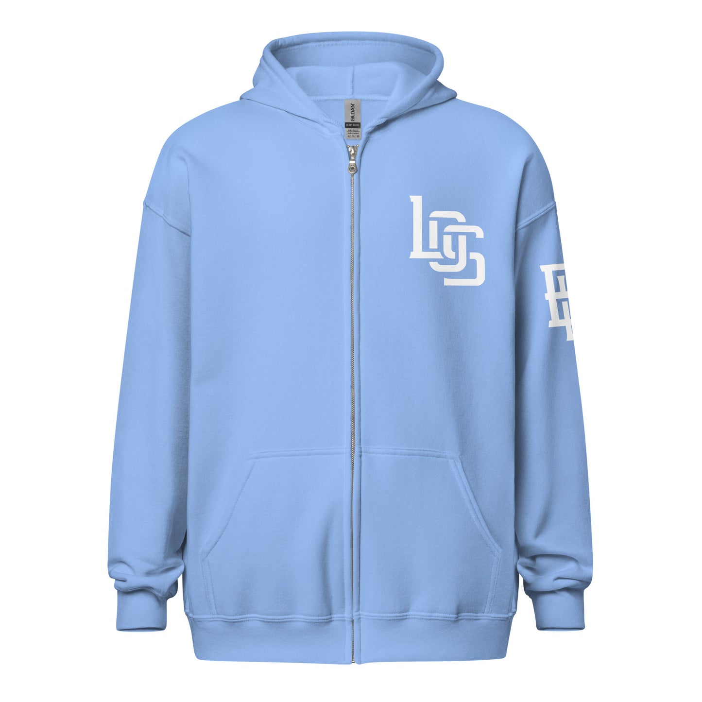 "LOS" Unisex Heavy Blend Zip Hoodie | Gildan 18600 | E Luna Brand ESSENCE Tricrest 3 White Logos: Front Upper Left, Left Arm & Outside Back Label