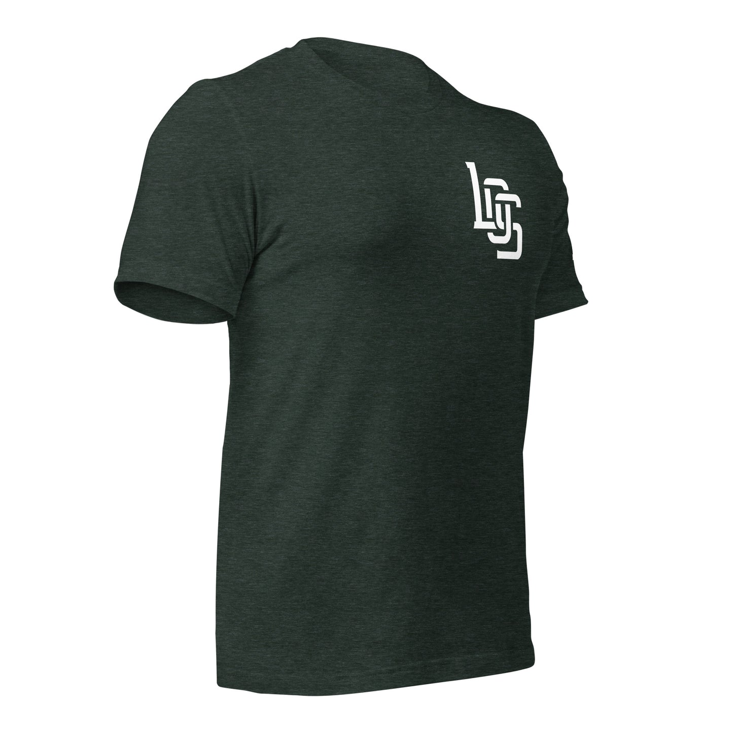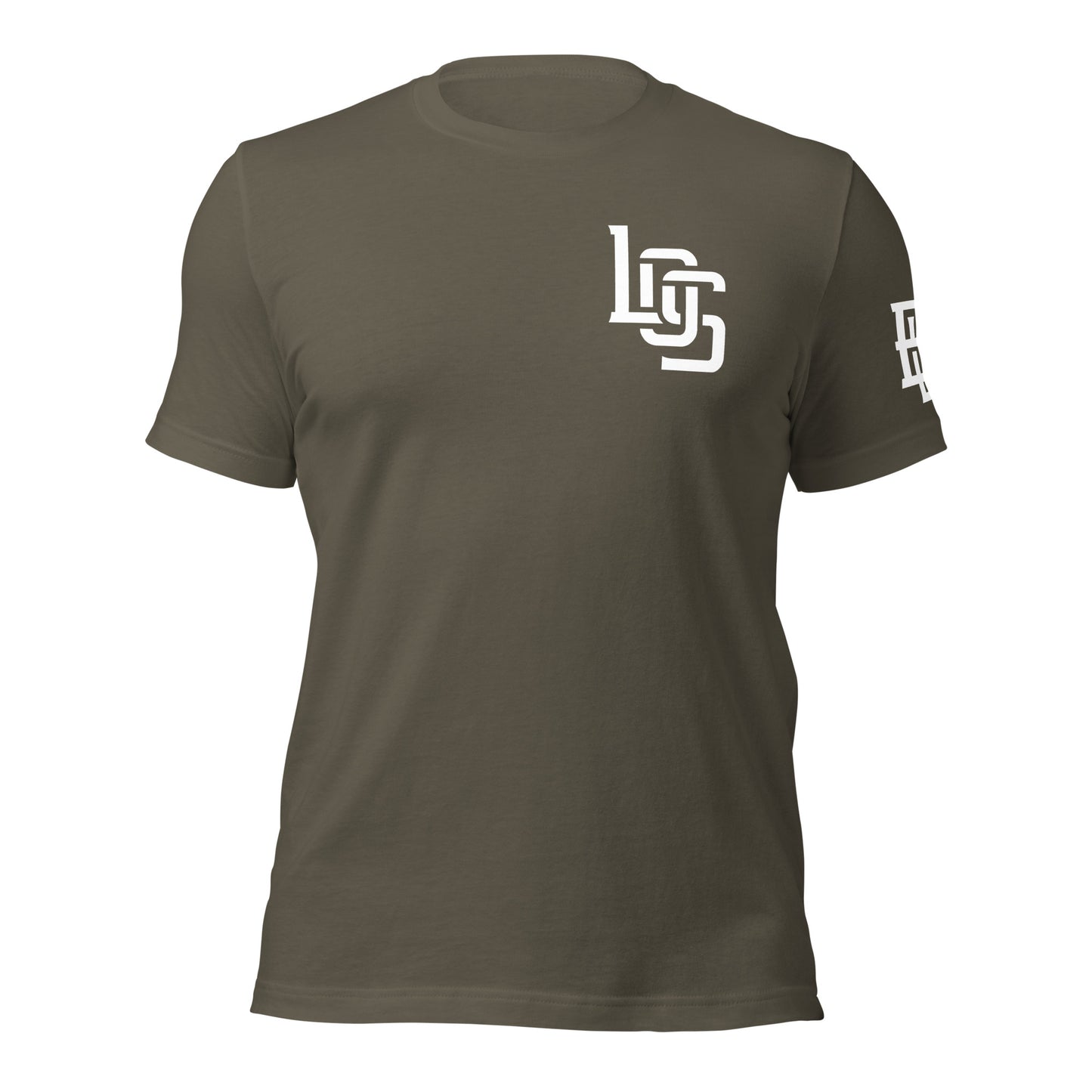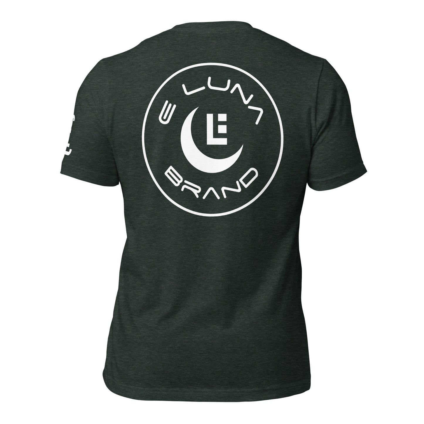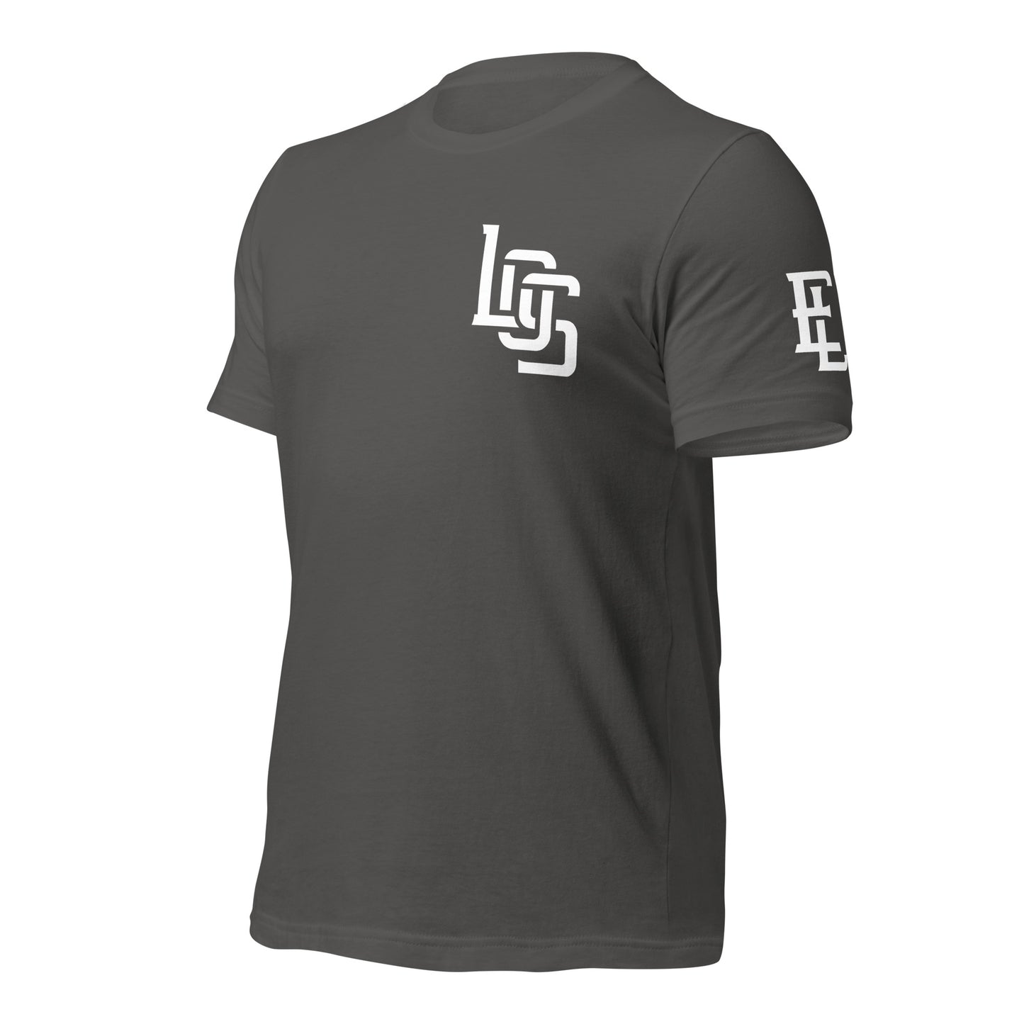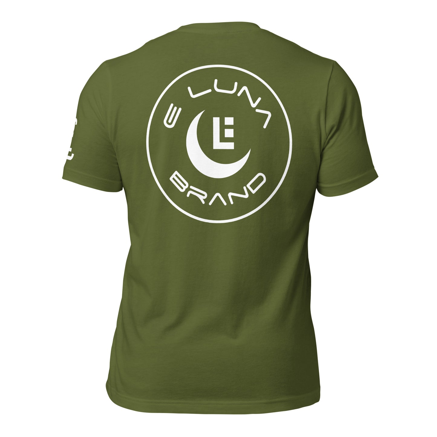 "LOS" Unisex Staple T-Shirt | Bella + Canvas 3001 | E Luna Brand ELEMENT Tricrest 3 White Logos: Front Upper Left, Left Arm & Back (Large)