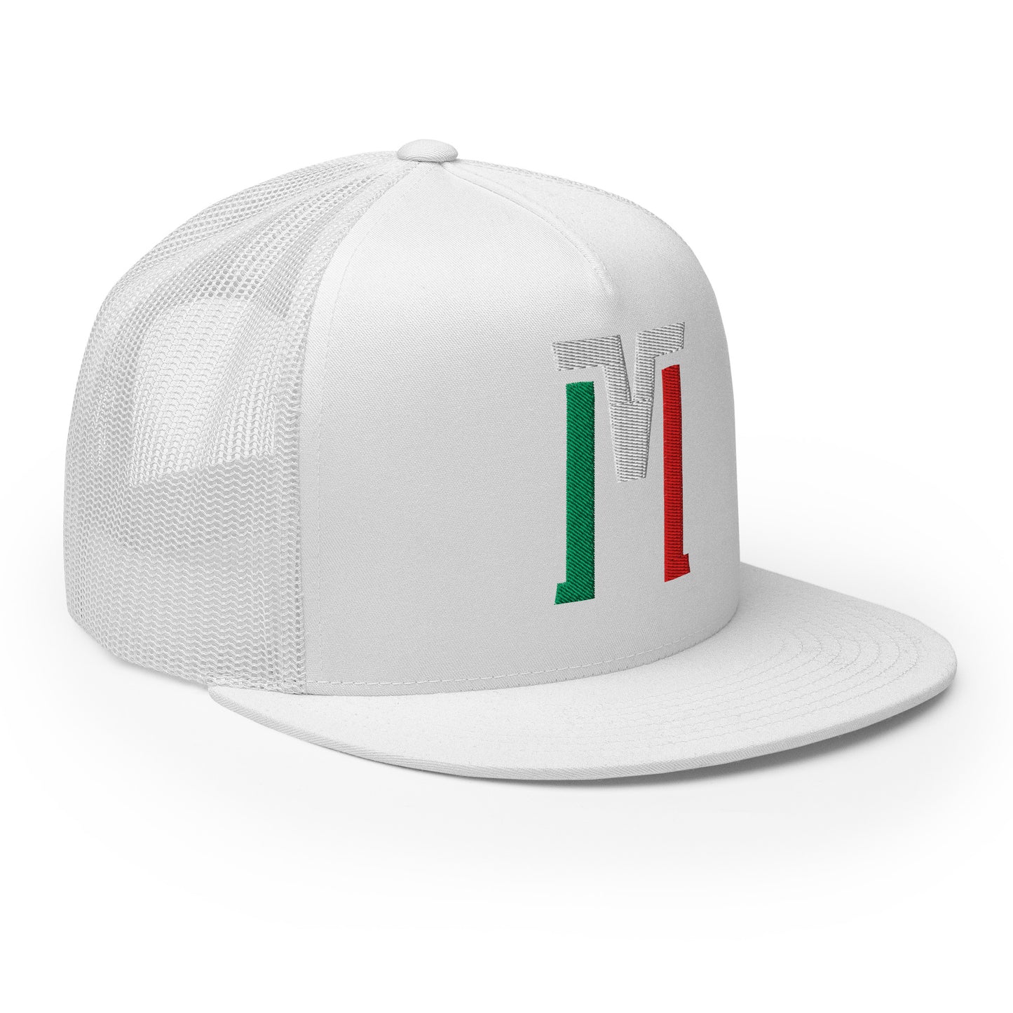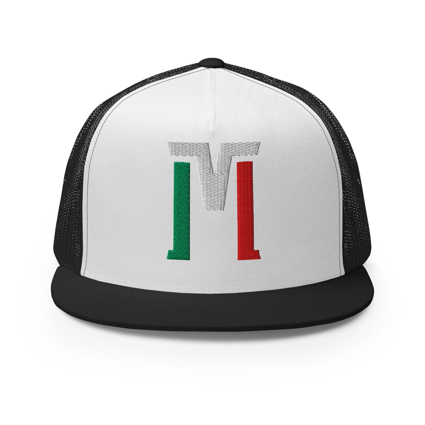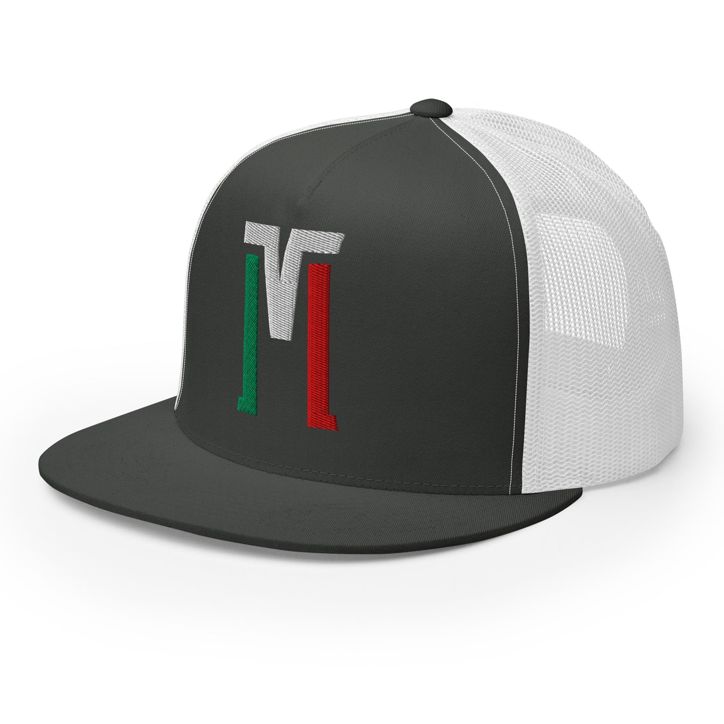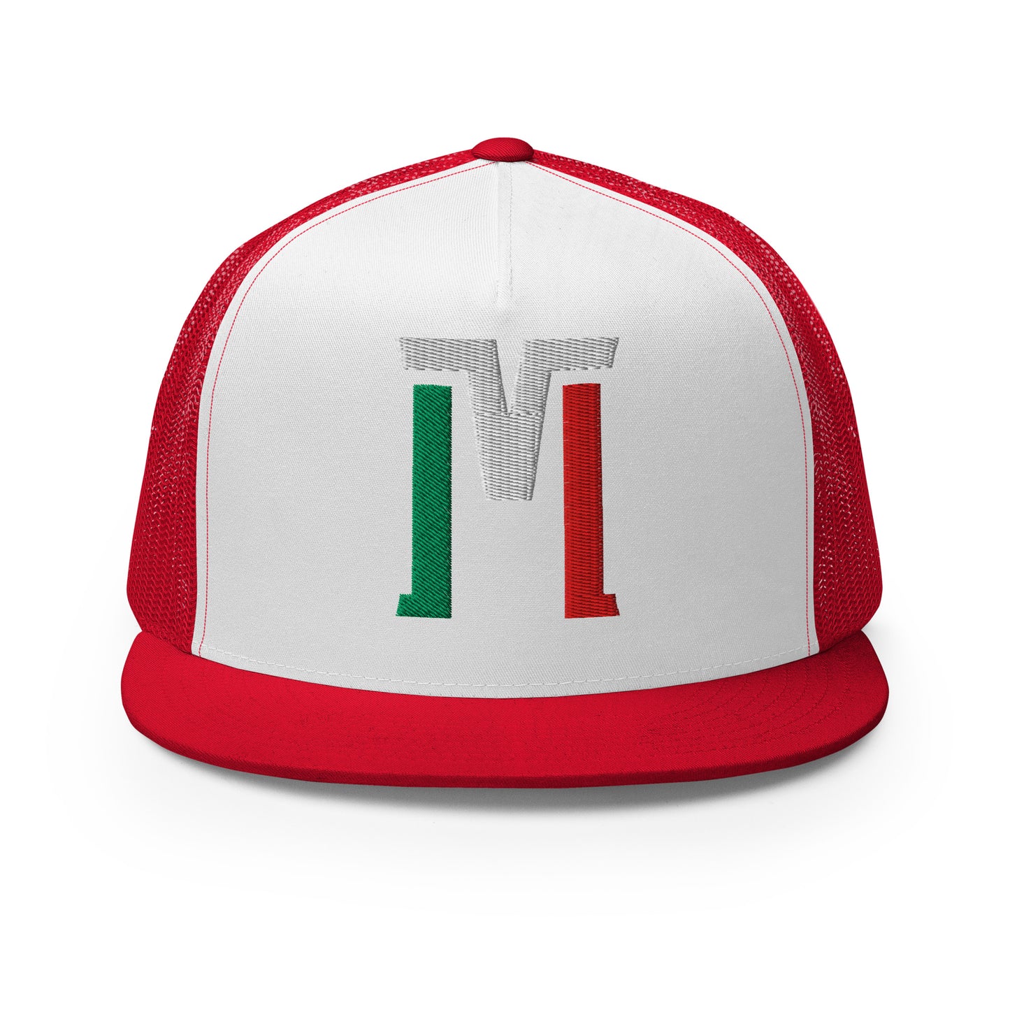 "M" Five Panel Trucker Cap | E Luna Brand CLASSIC | 1 Green, White, Red Thread Logo | 3D Puff Edition
