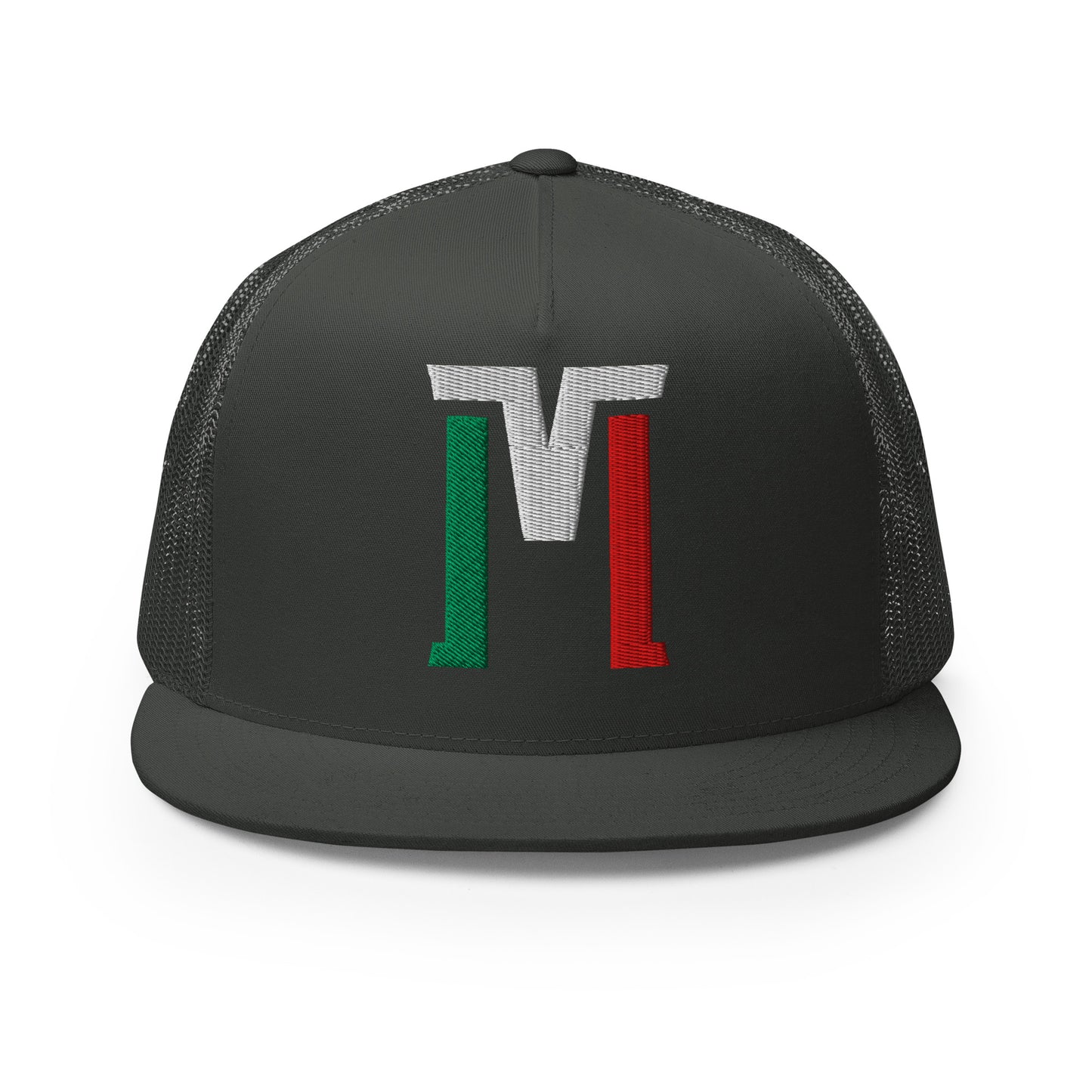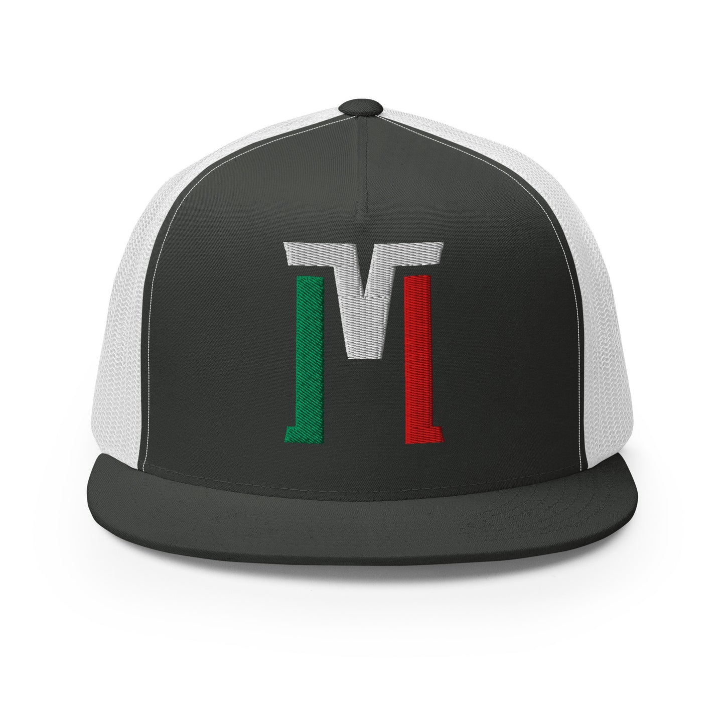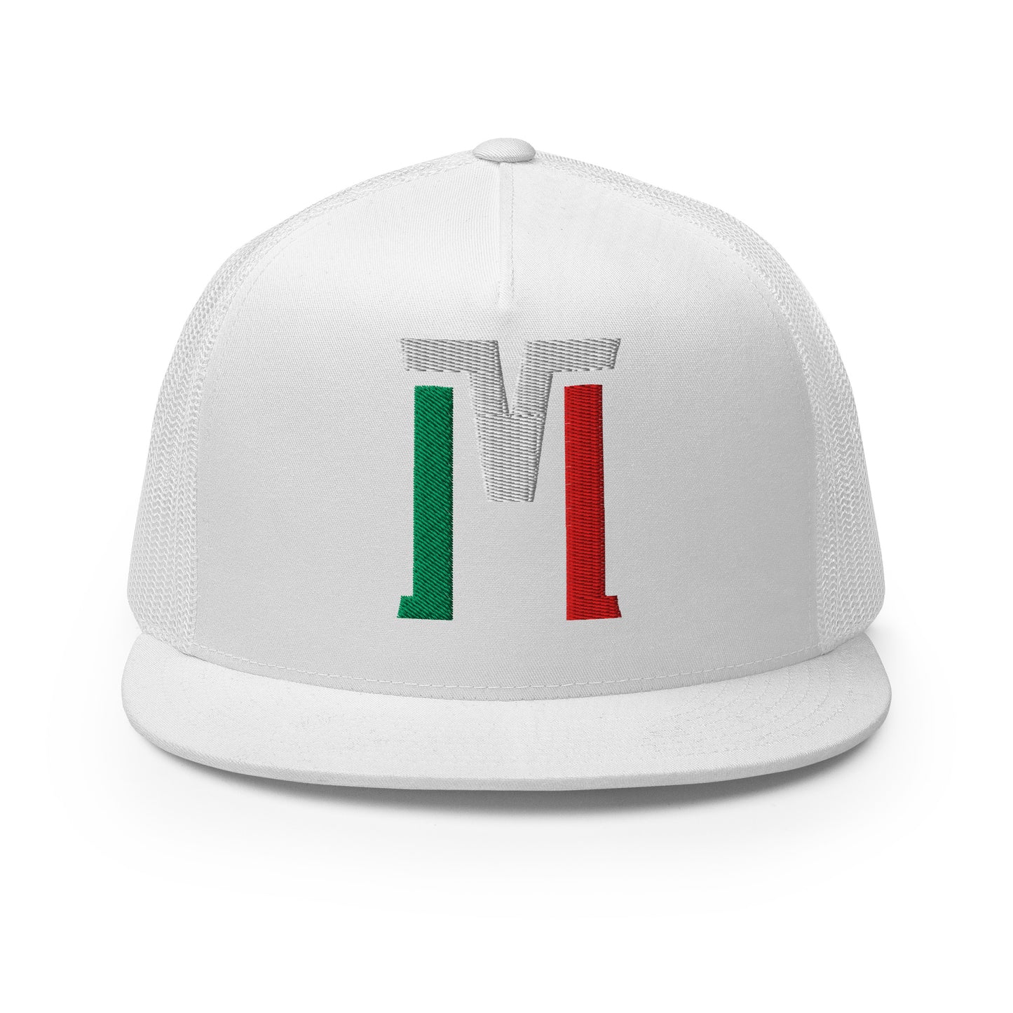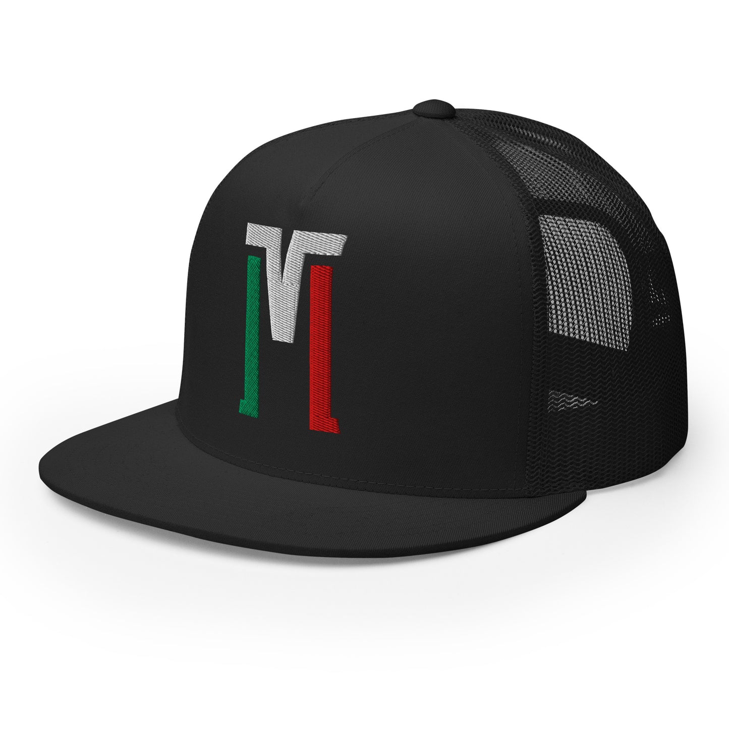 "M" Five Panel Trucker Cap | E Luna Brand CLASSIC | 1 Green, White, Red Thread Logo | 3D Puff Edition