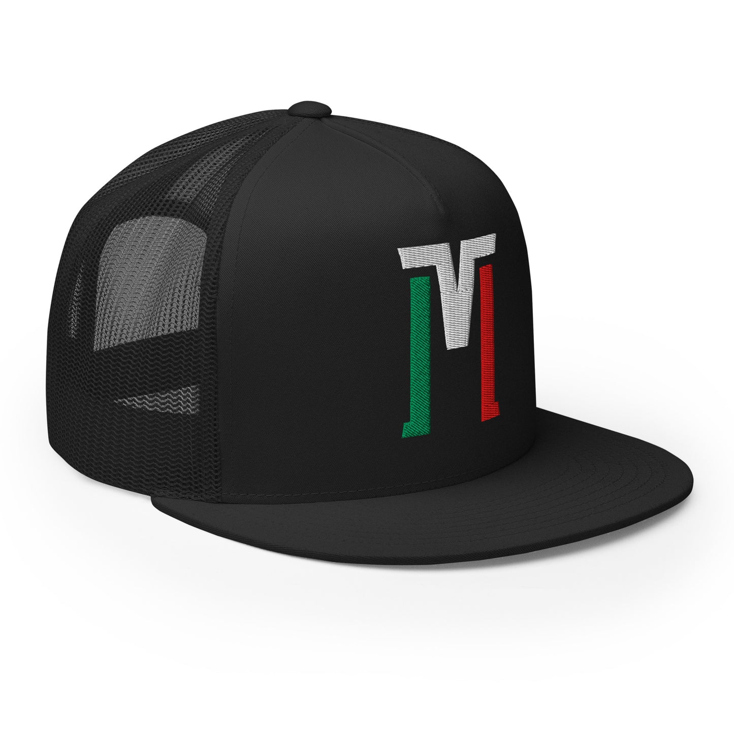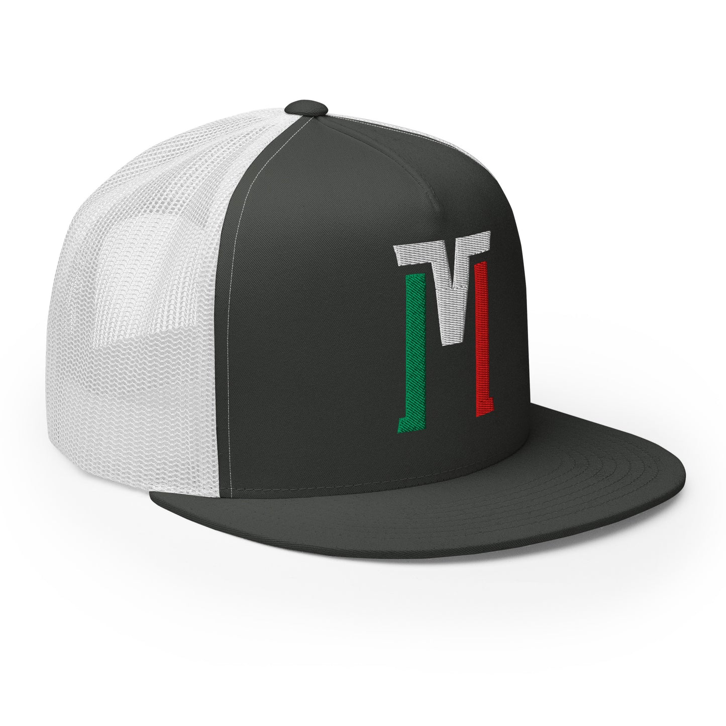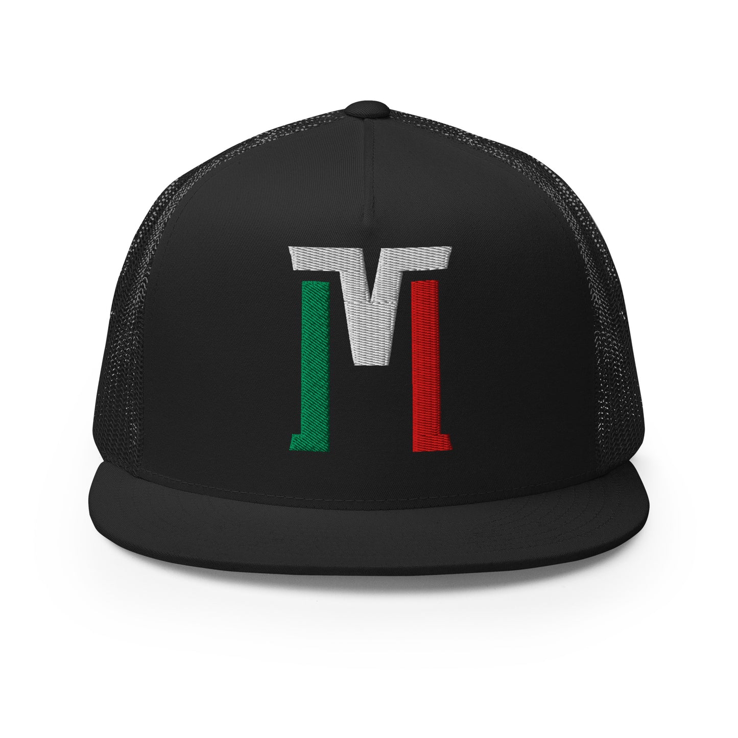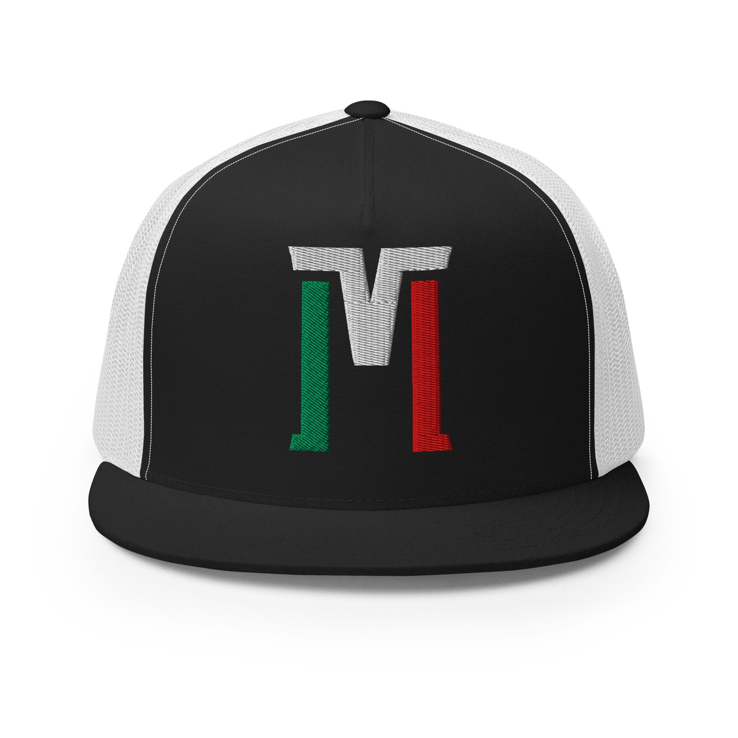 "M" Five Panel Trucker Cap | E Luna Brand CLASSIC | 1 Green, White, Red Thread Logo | 3D Puff Edition