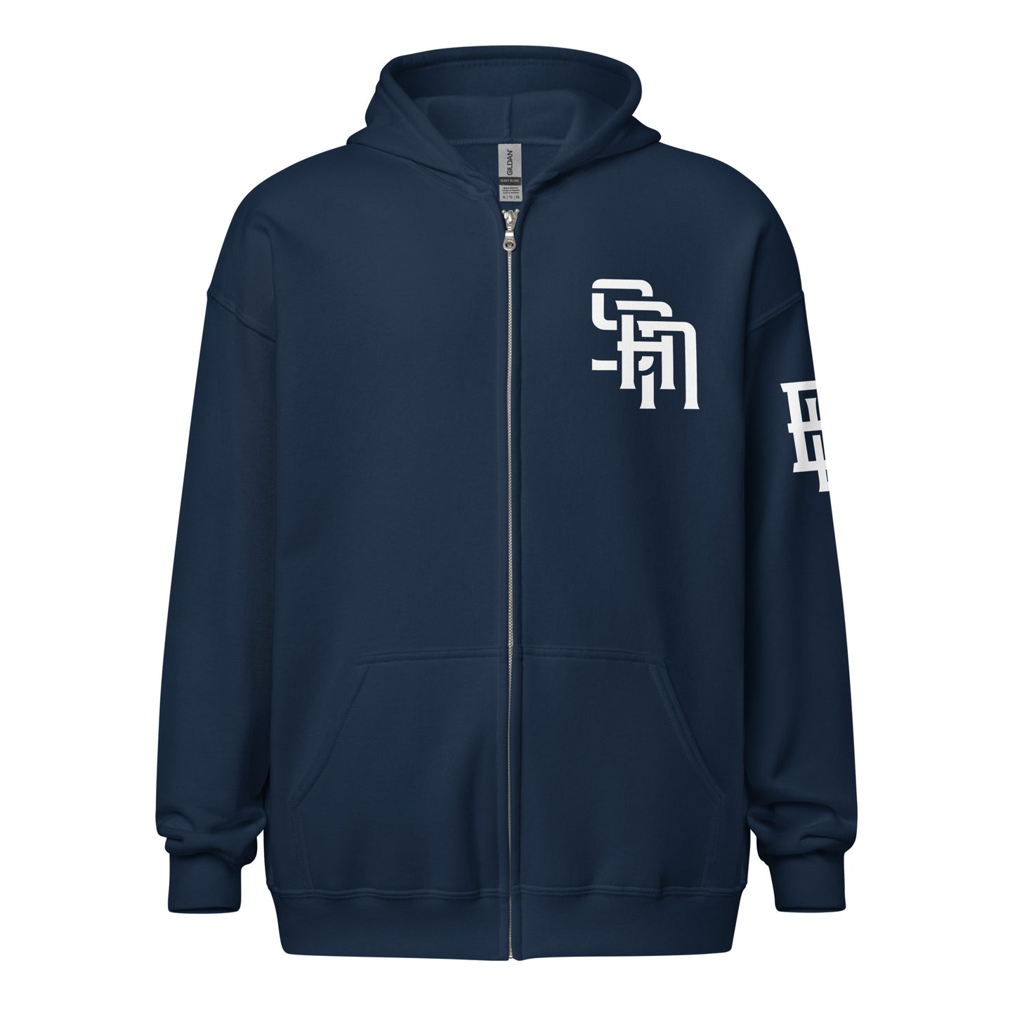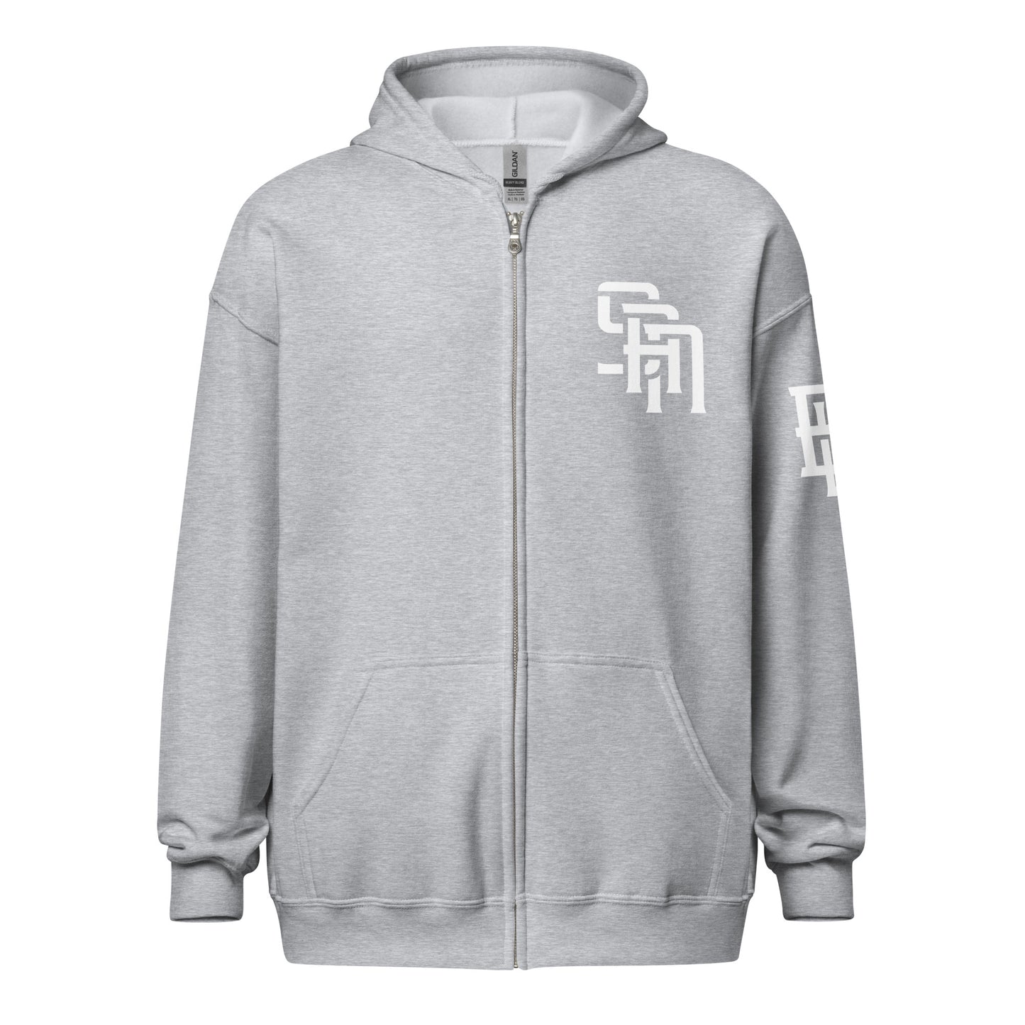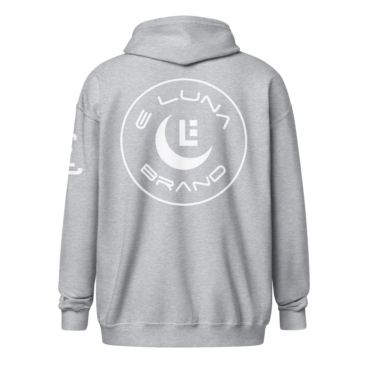 "SAN" 2.0 Unisex Heavy Blend Zip Hoodie | E Luna Brand ELEMENT | 3 White Logos: Front Left, Left Sleeve & Back