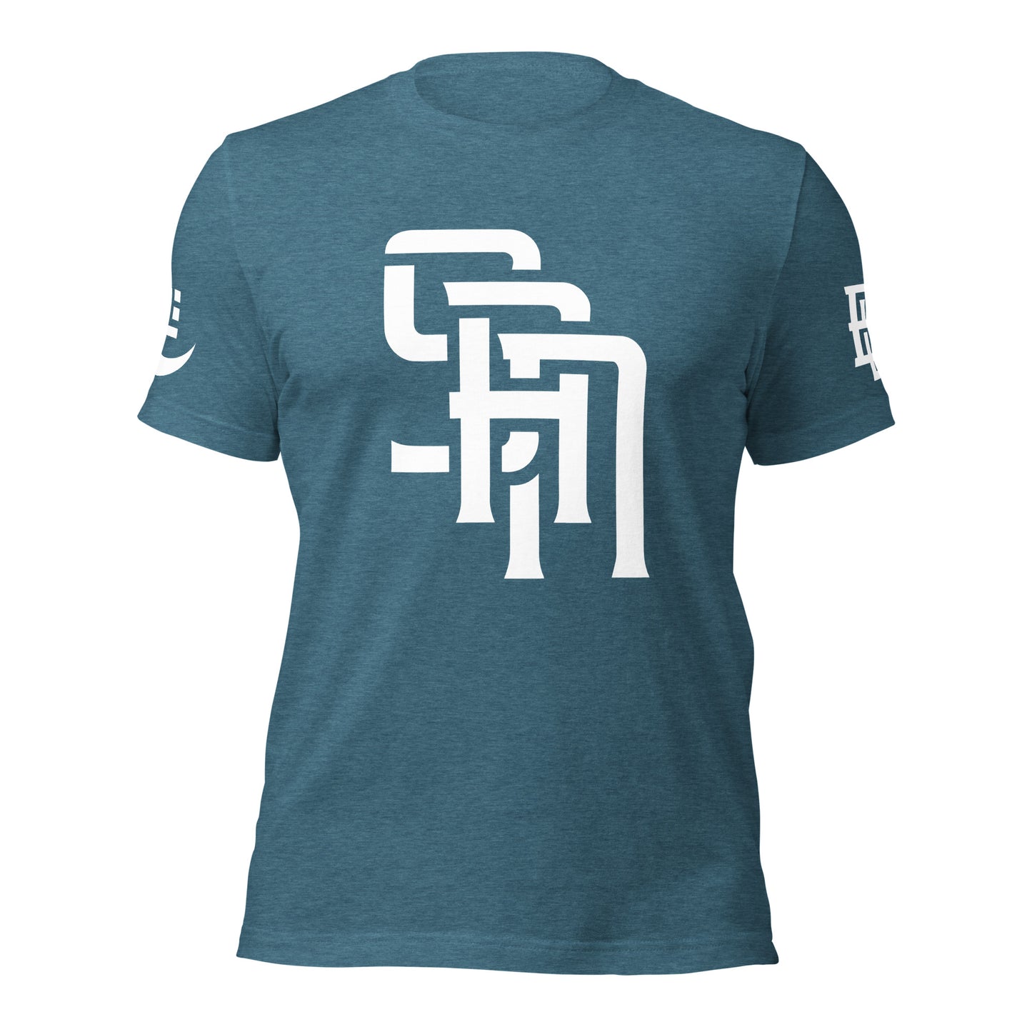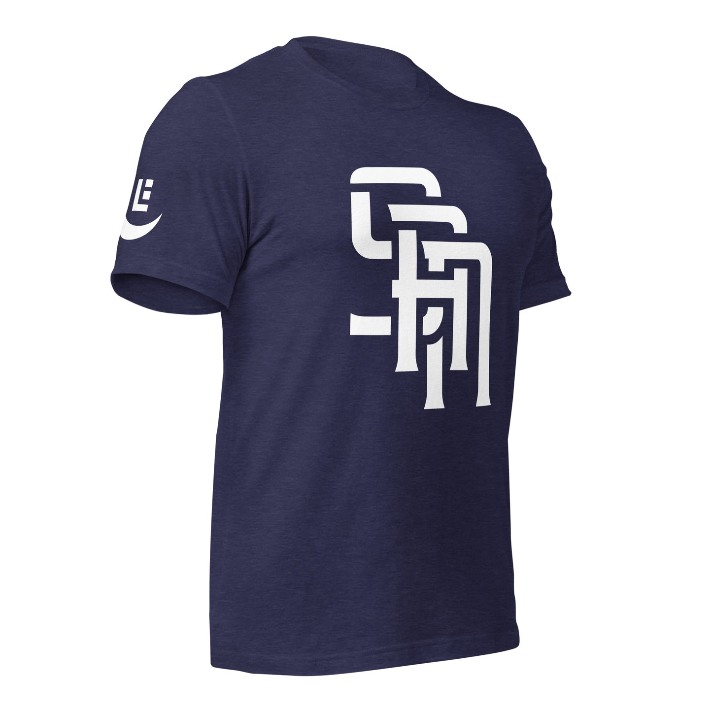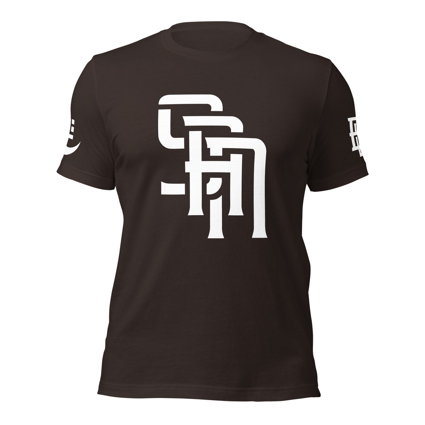 "SAN" 2.0 Unisex Staple T-Shirt | E Luna Brand EXCLUSIVE | 4 White Logos: Front, Left/Right Sleeves & Back Signature