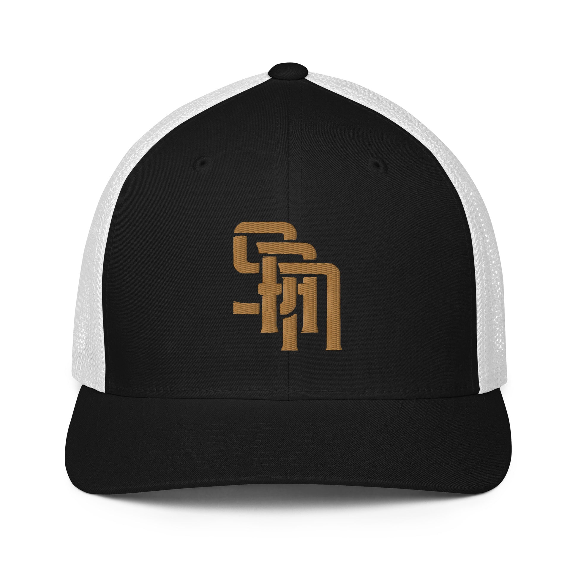 "SAN" Closed-Back Trucker Cap | Flexfit 6511 | E Luna Brand CLASSIC Solocrest 1 Old Gold Thread Front Logo [3D Puff Edition]