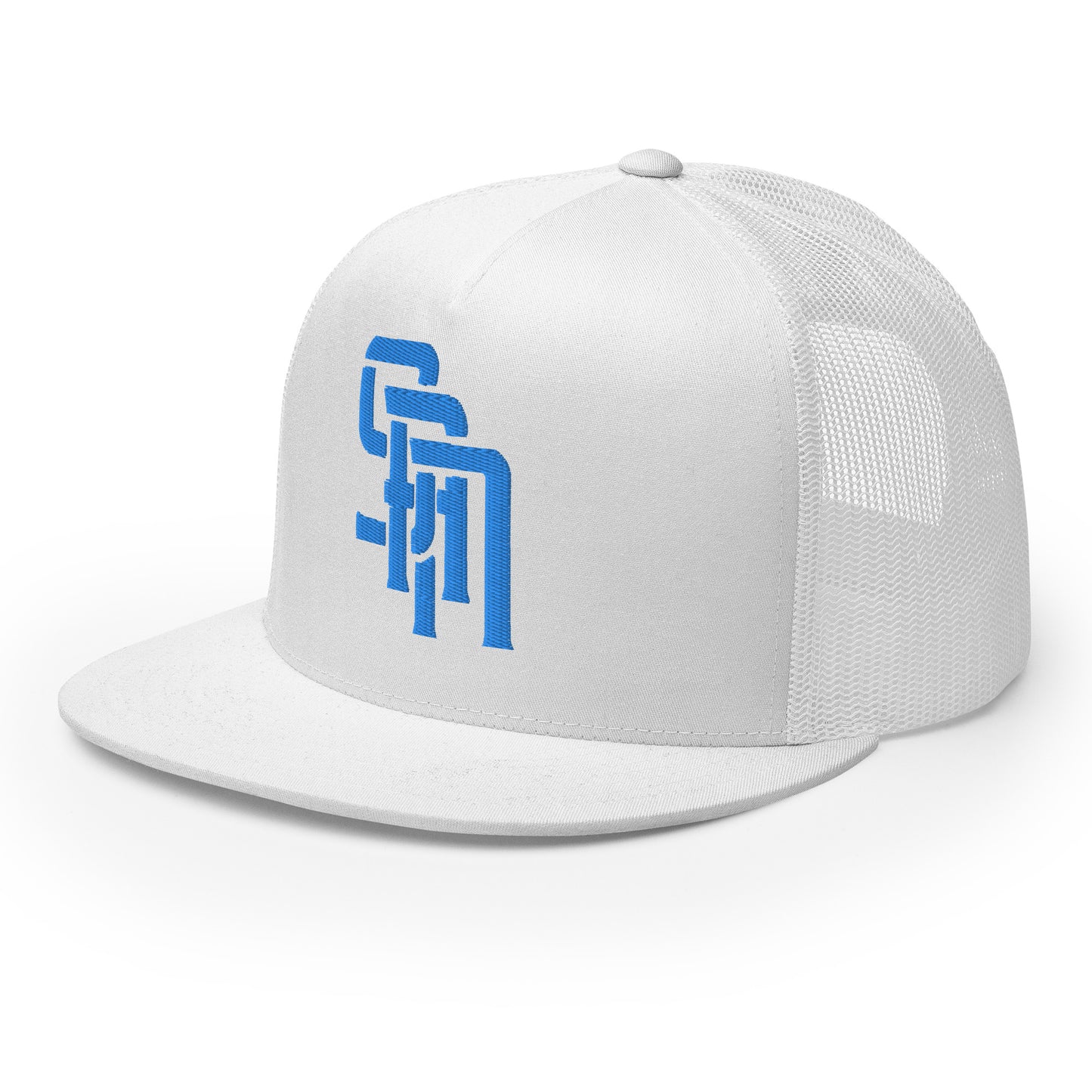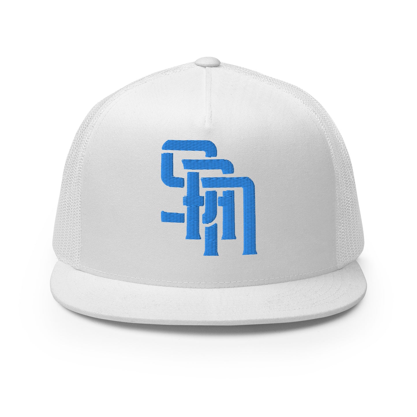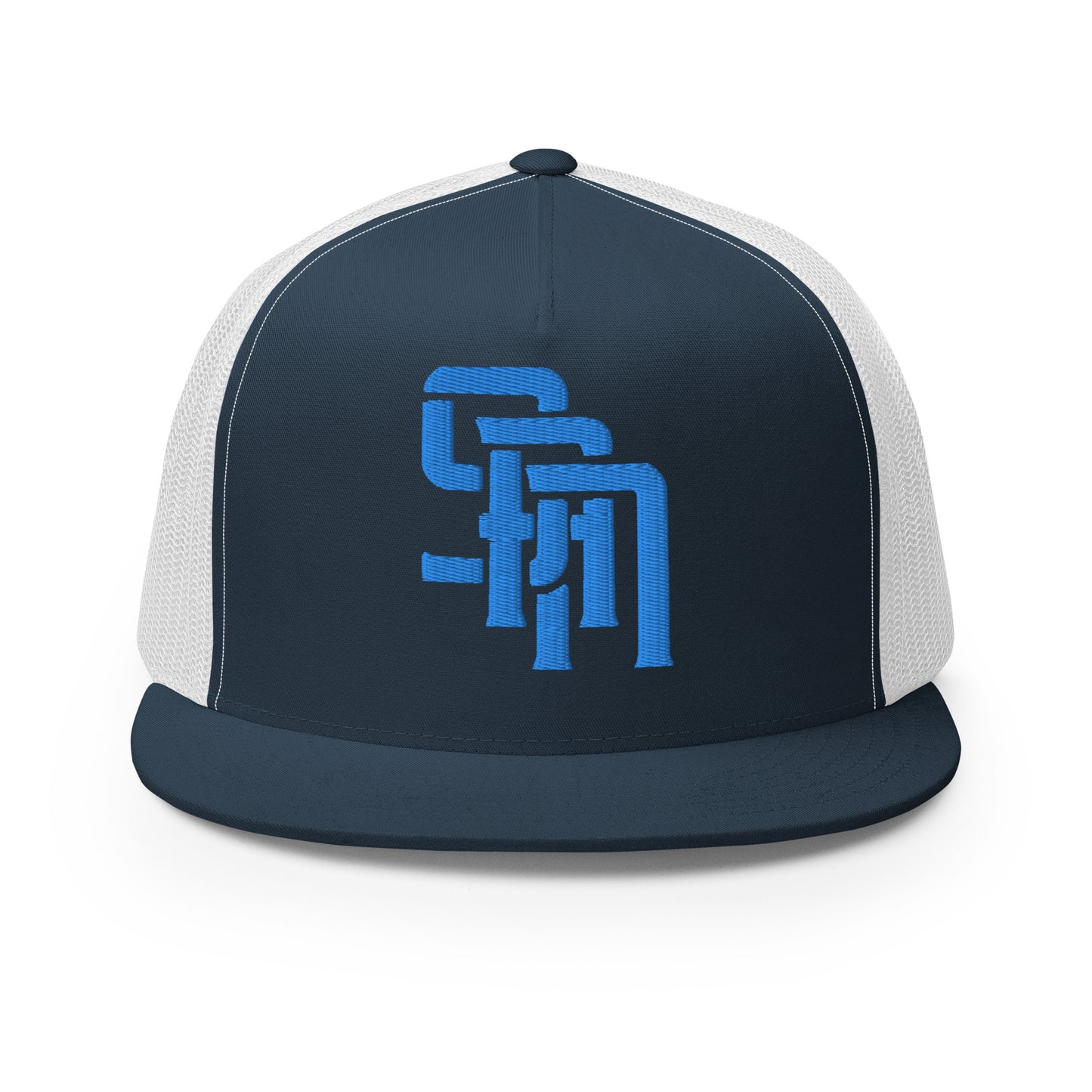 "SAN" Five Panel Trucker Cap | Yupoong 6006 | E Luna Brand CLASSIC Solocrest 1 Aqua/Teal Thread Front Logo [3D Puff Edition]