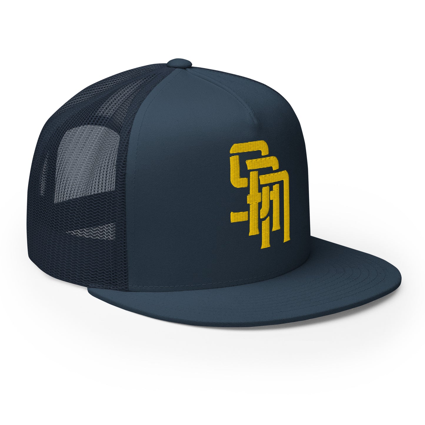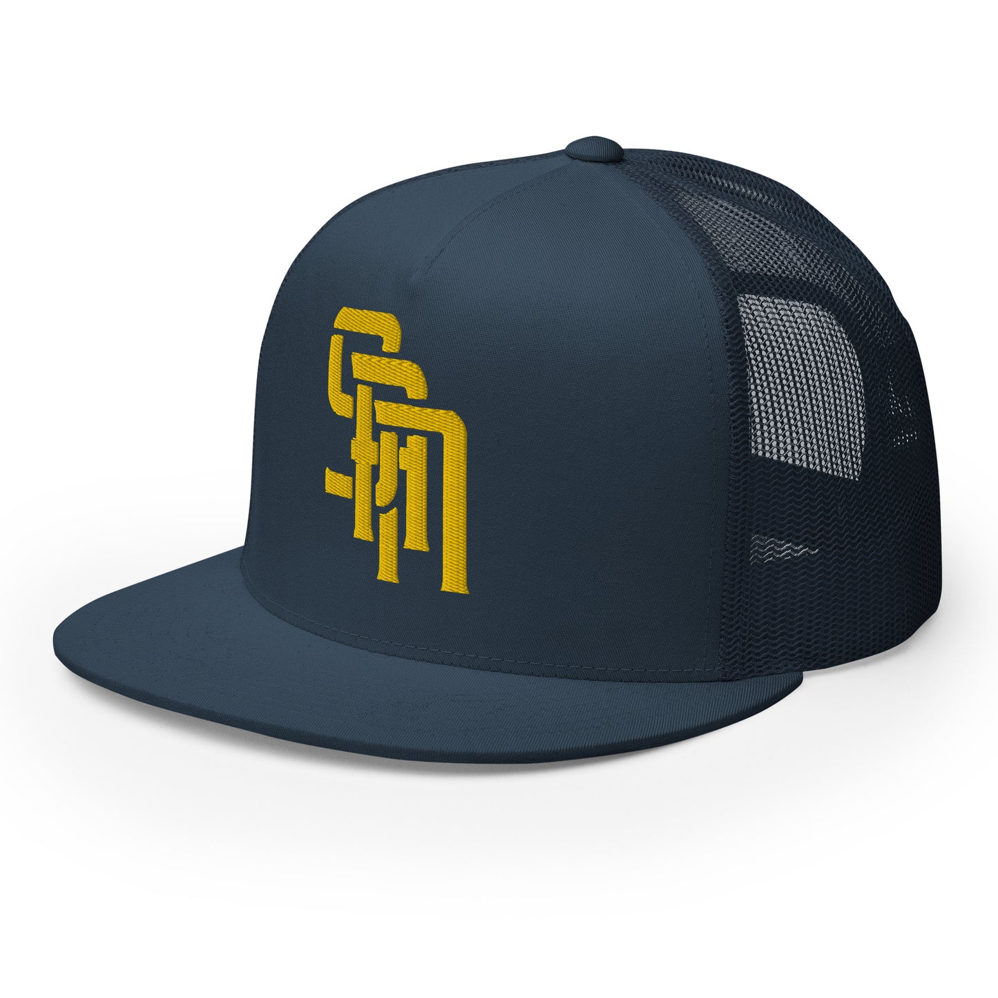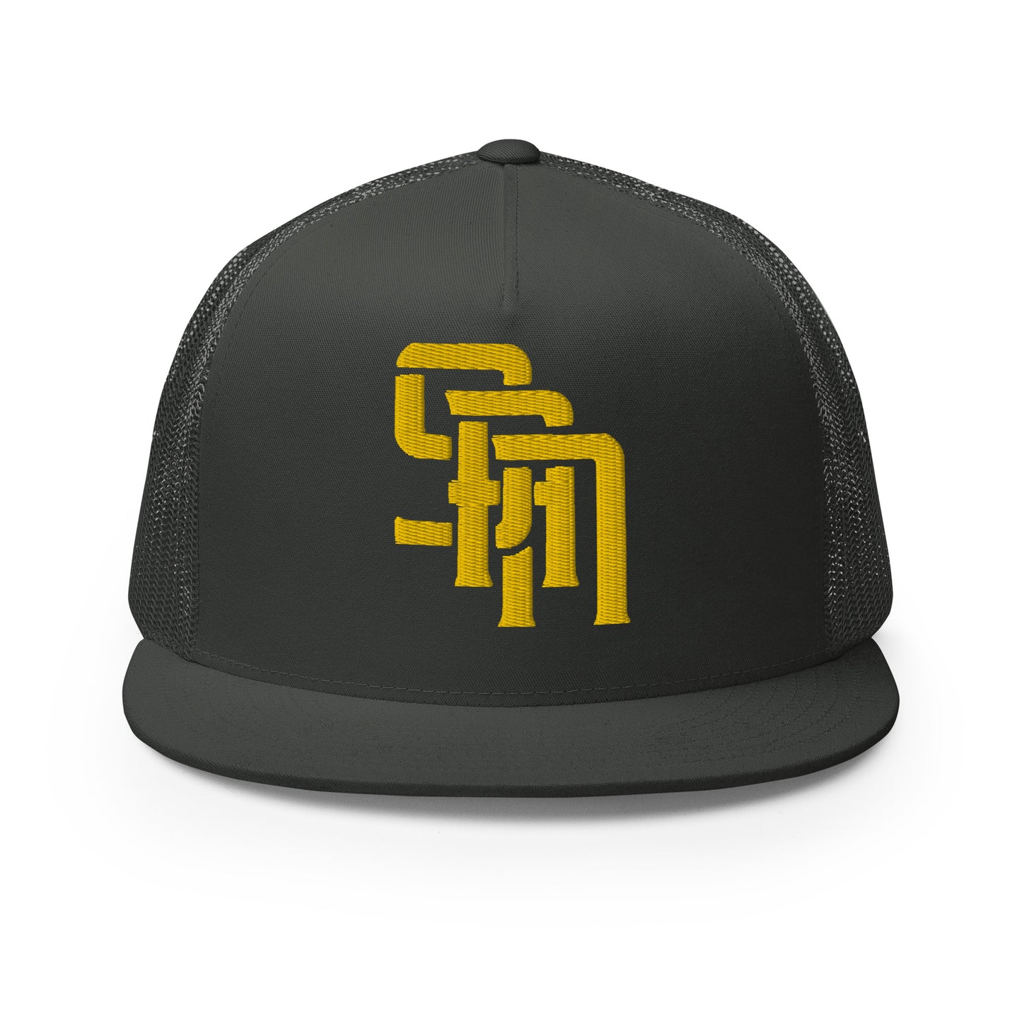 "SAN" Five Panel Trucker Cap | Yupoong 6006 | E Luna Brand CLASSIC Solocrest 1 Gold Thread Front Logo [3D Puff Edition]