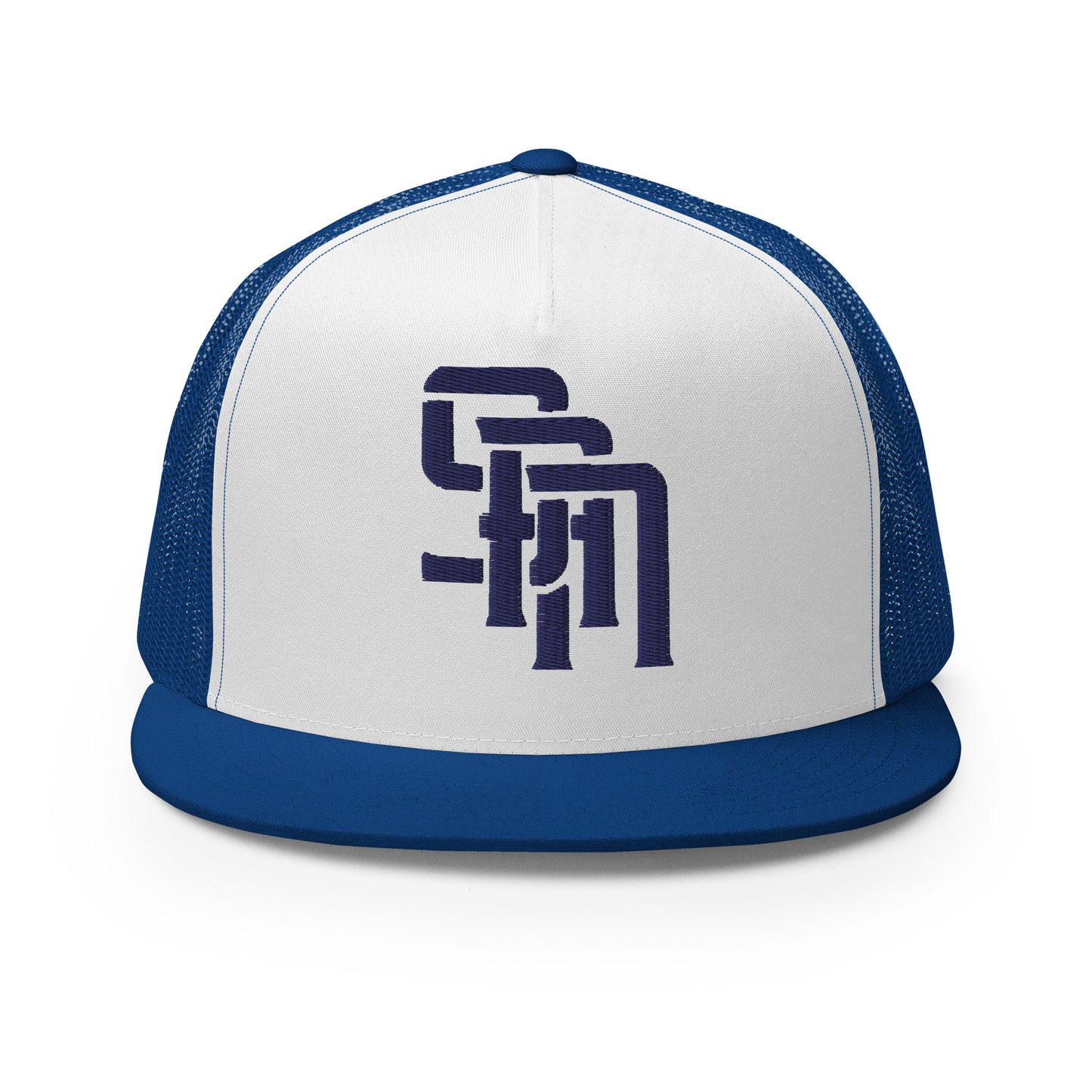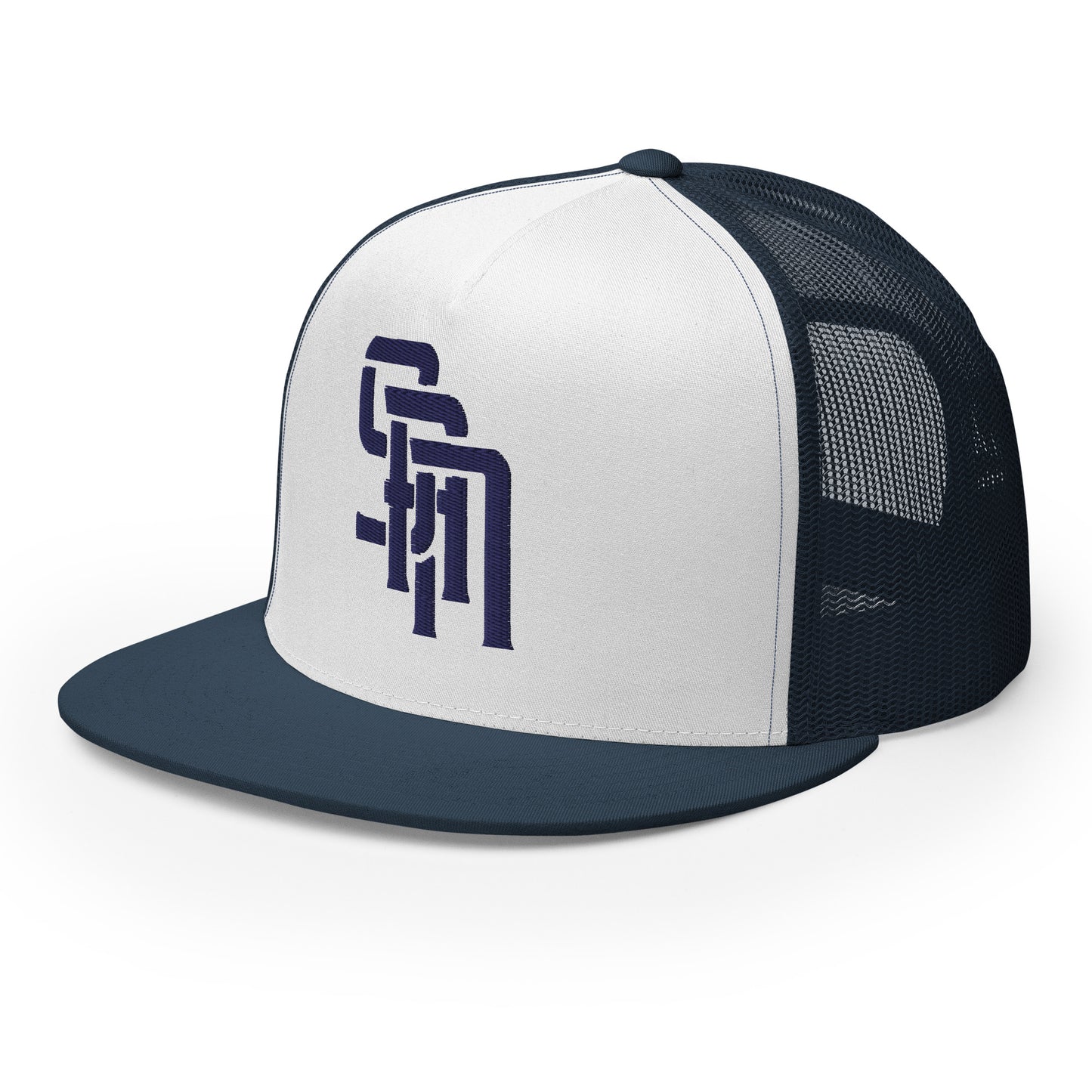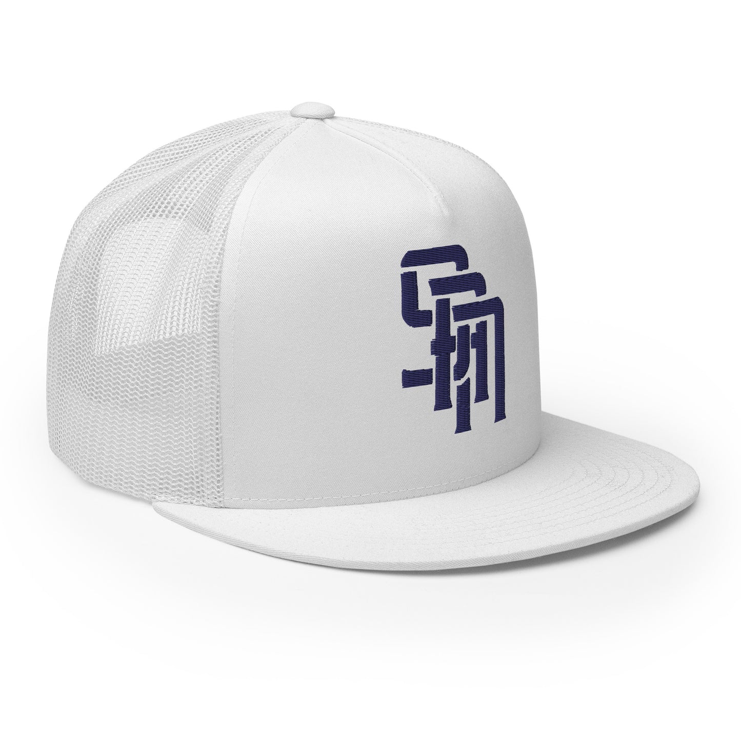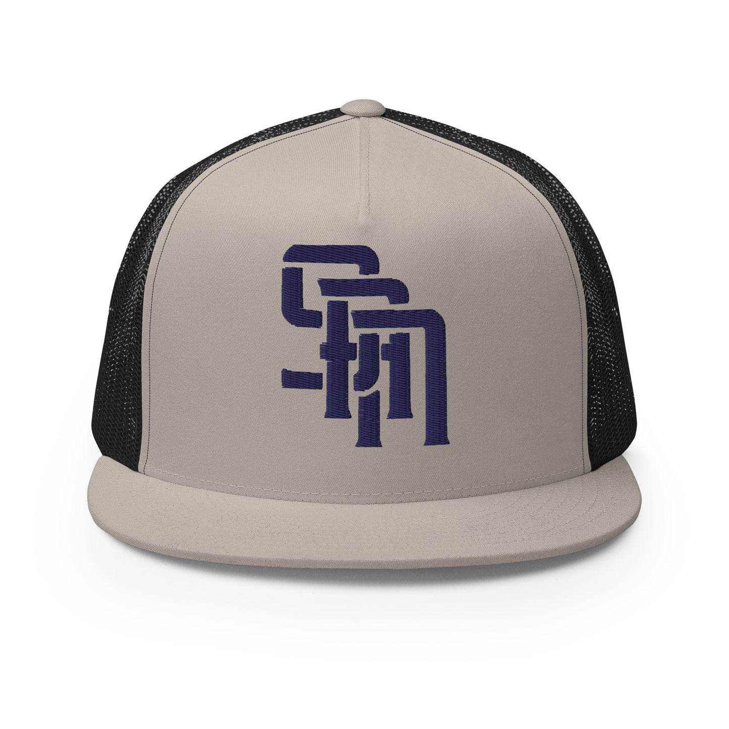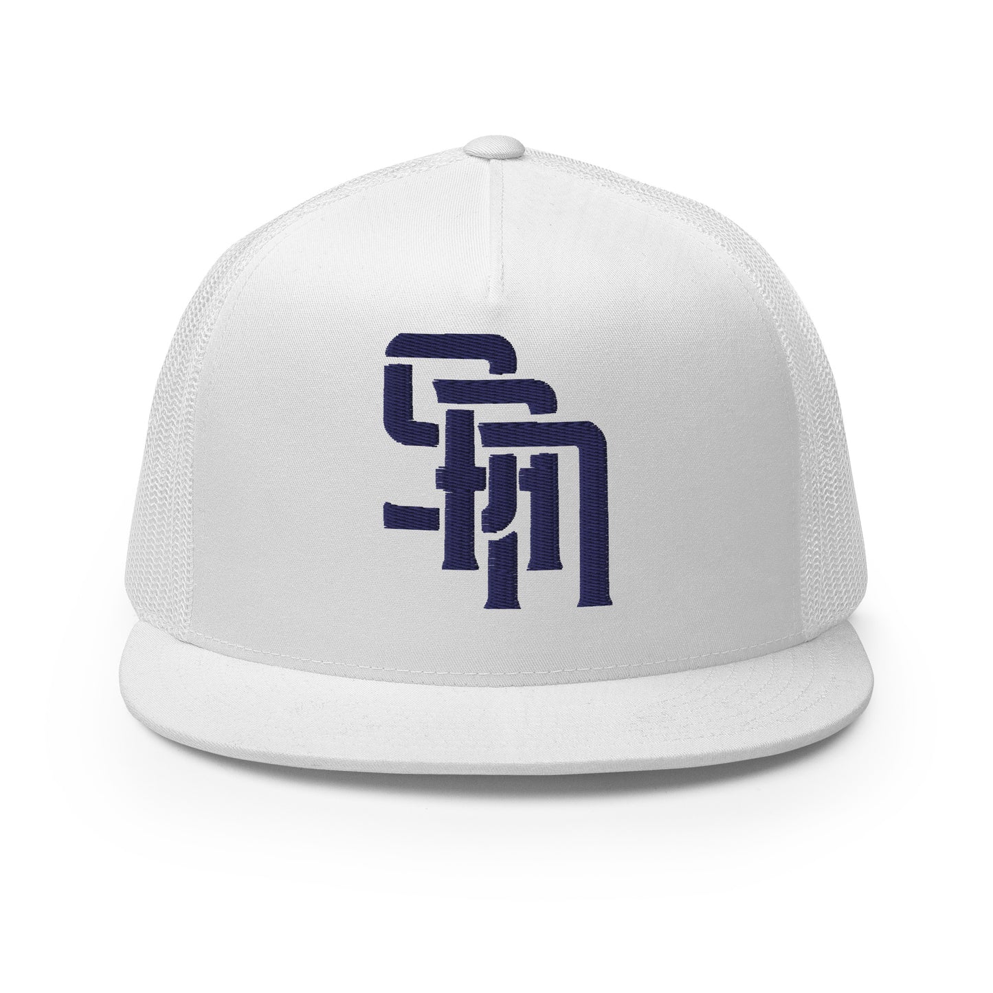 "SAN" Five Panel Trucker Cap | Yupoong 6006 | E Luna Brand CLASSIC Solocrest 1 Navy Thread Front Logo [3D Puff Edition]