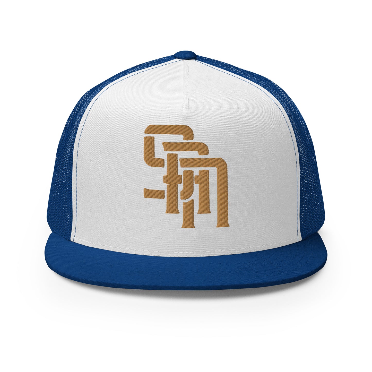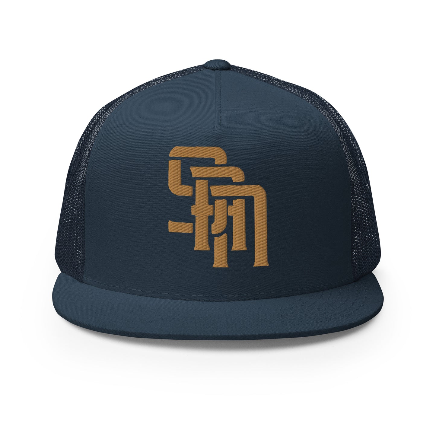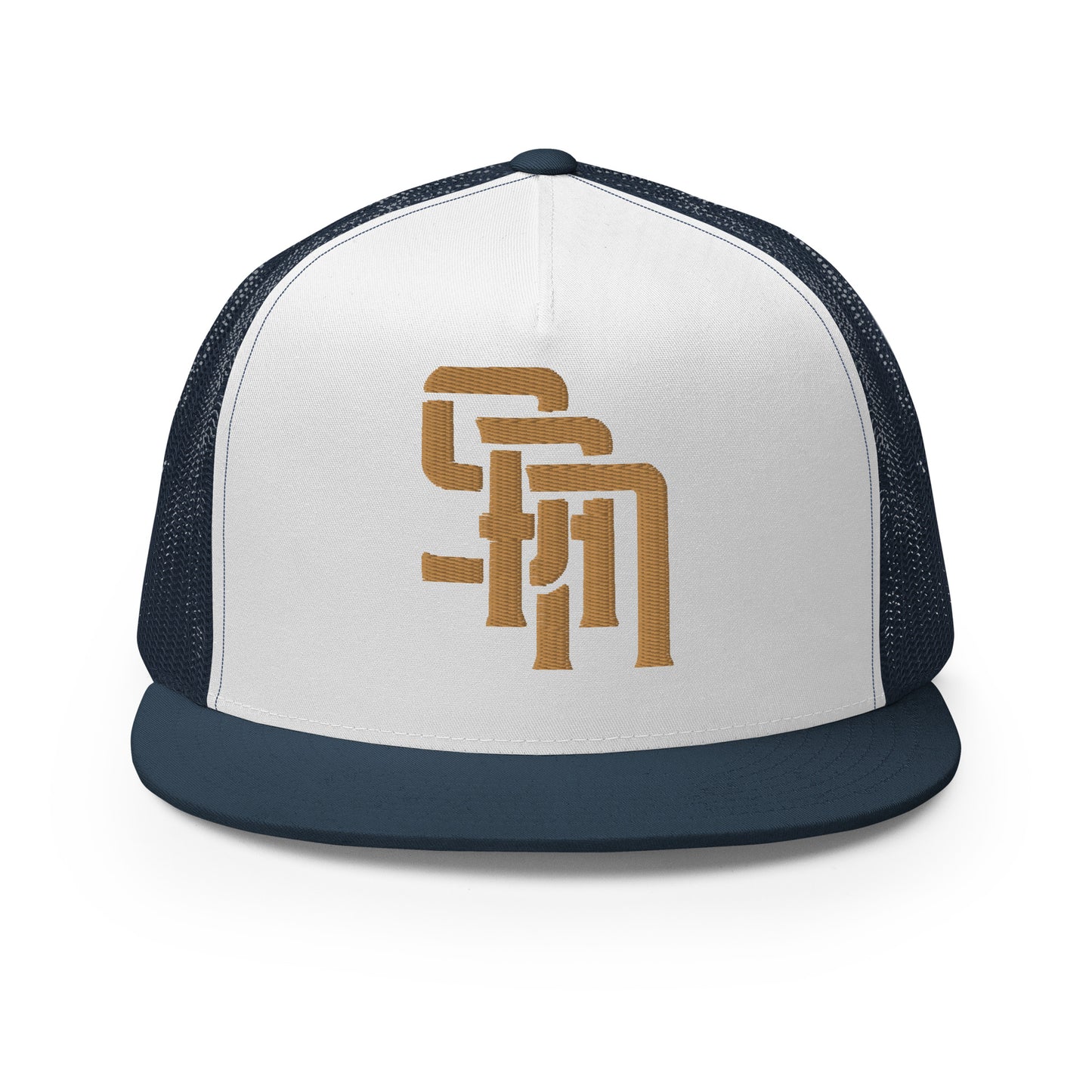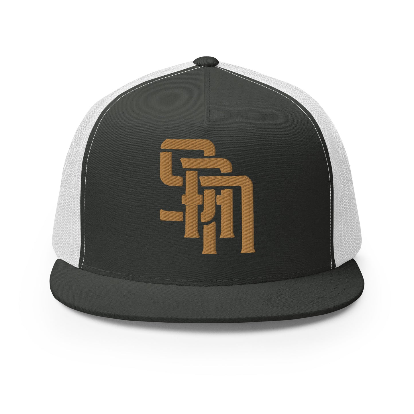"SAN" Five Panel Trucker Cap | Yupoong 6006 | E Luna Brand CLASSIC Solocrest 1 Old Gold Thread Front Logo [3D Puff Edition]