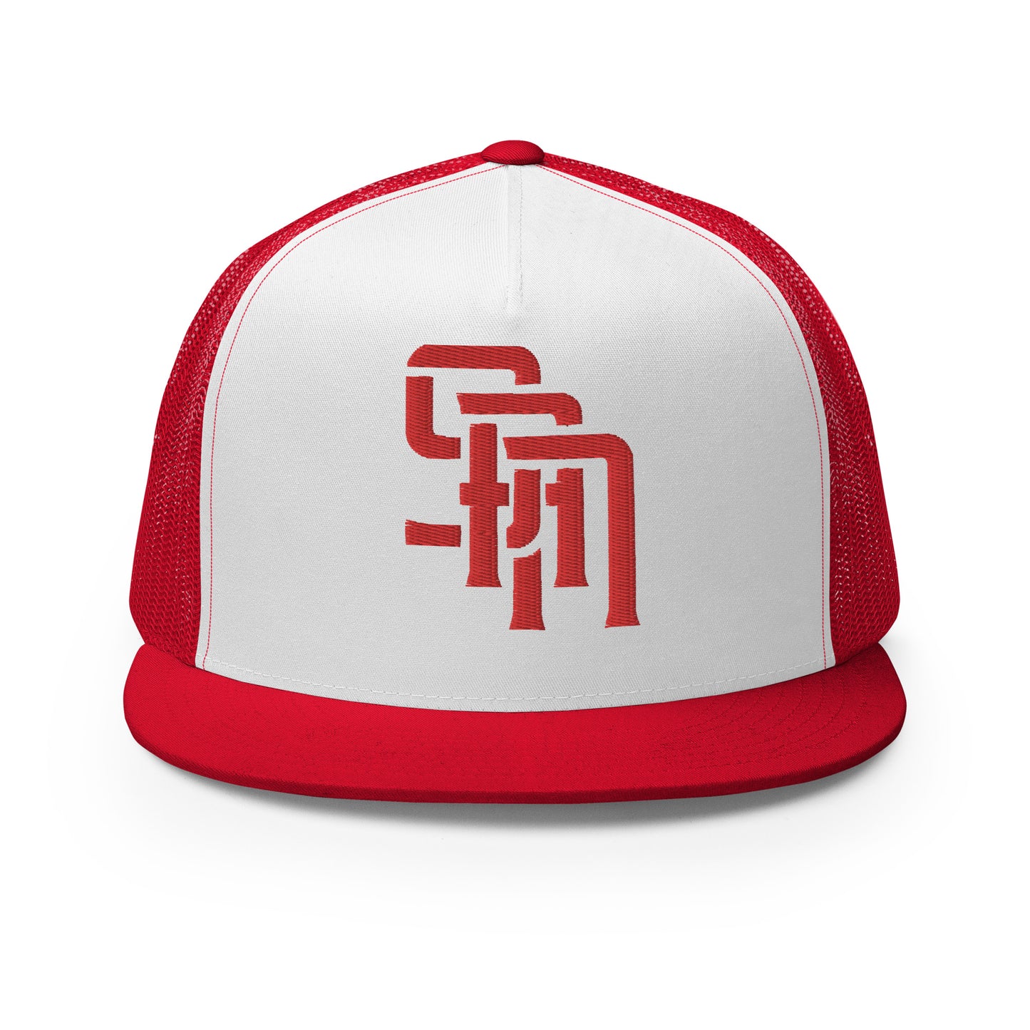 "SAN" Five Panel Trucker Cap | Yupoong 6006 | E Luna Brand CLASSIC Solocrest 1 Red Thread Front Logo