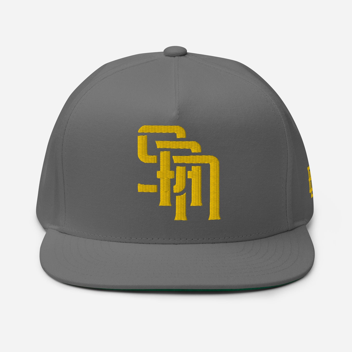 "SAN" Flat Bill Cap | Yupoong 6007 | E Luna Brand ESSENTIAL Duocrest 2 Gold Thread Logos: Front & Left