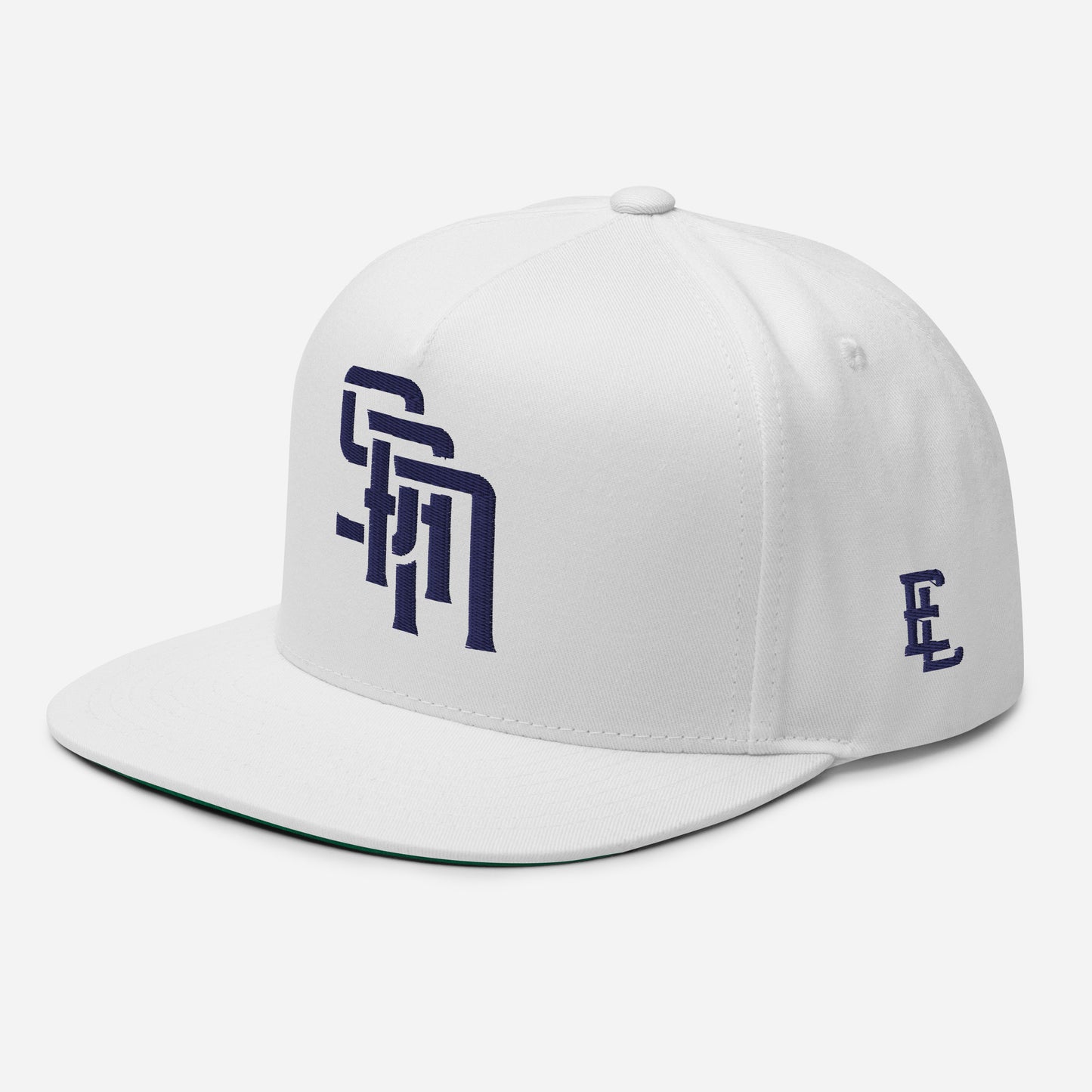 "SAN" Flat Bill Cap | Yupoong 6007 | E Luna Brand ESSENTIAL Duocrest 2 Navy Thread Logos: Front & Left
