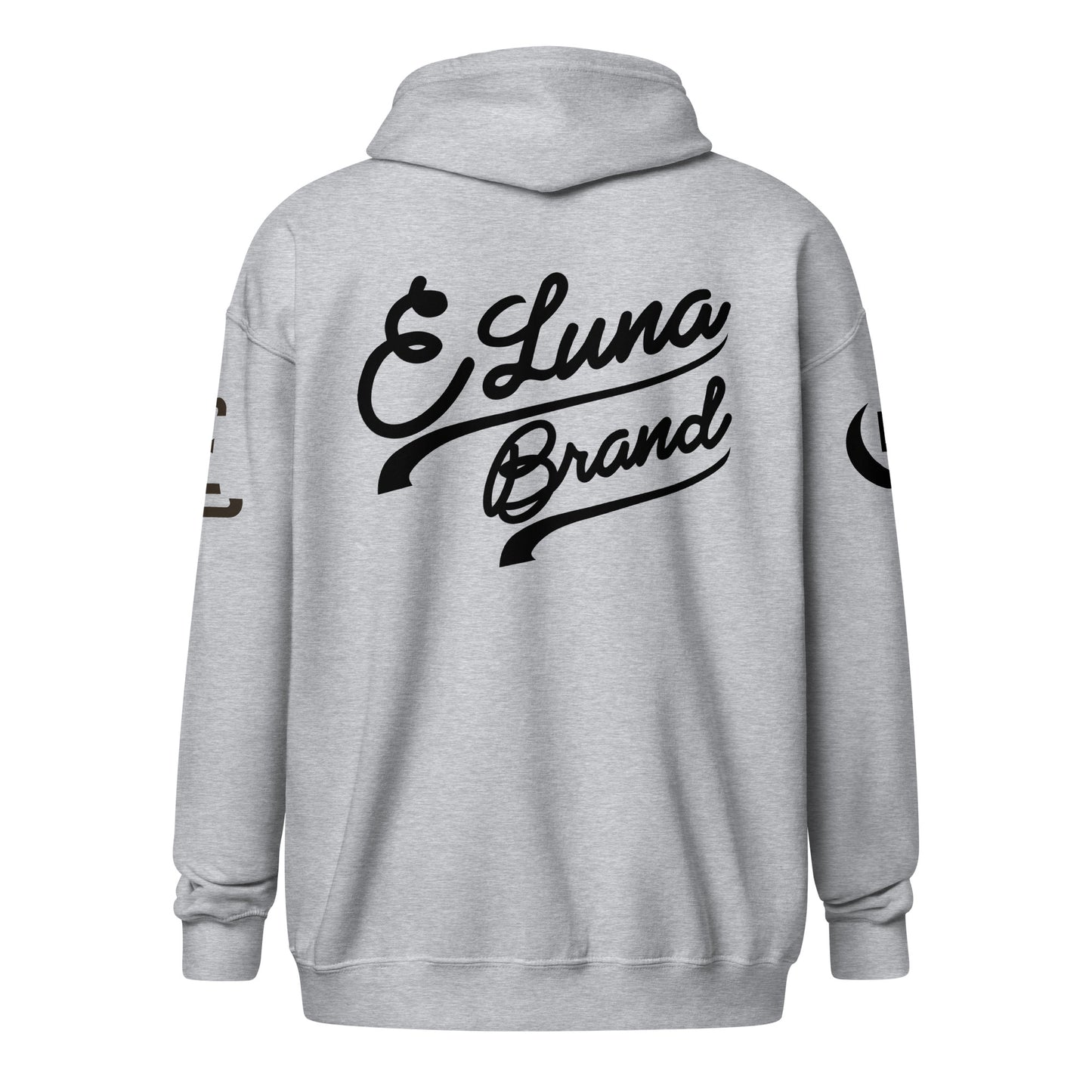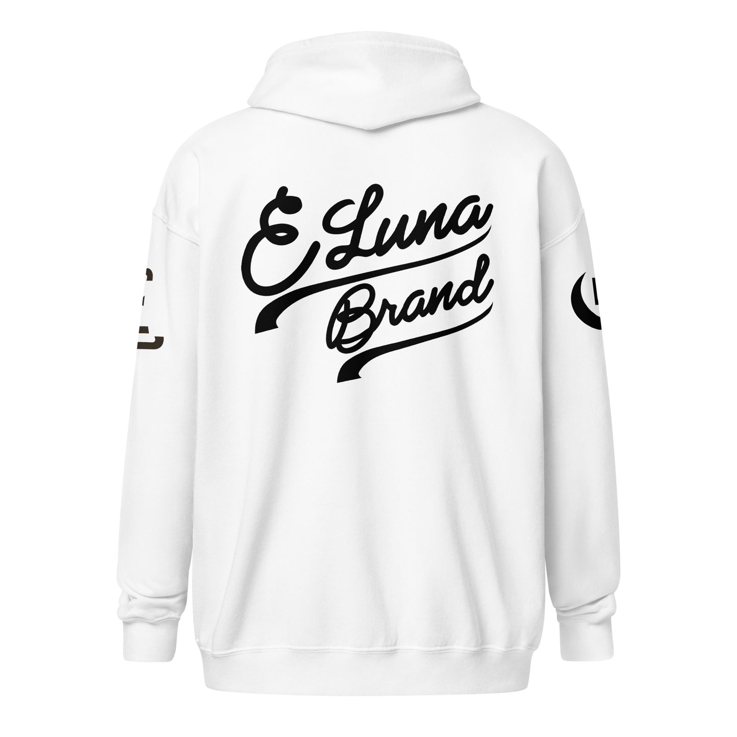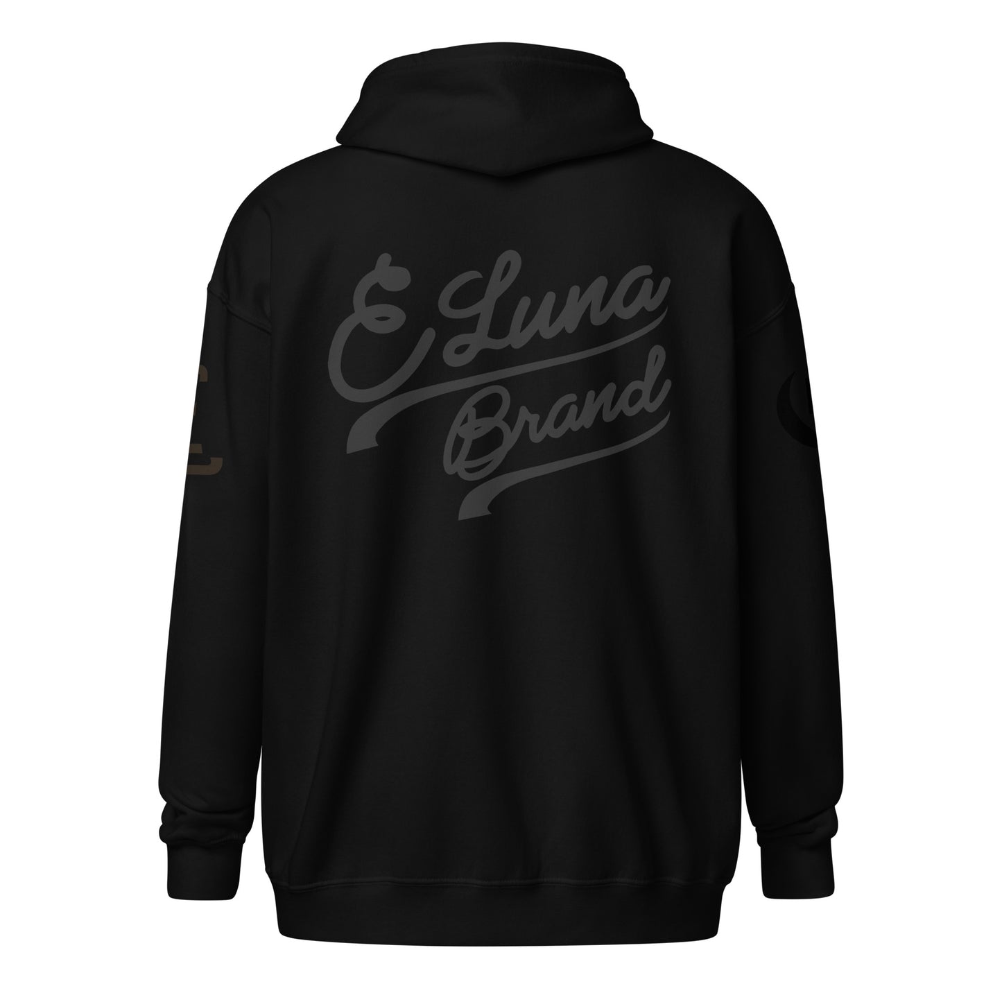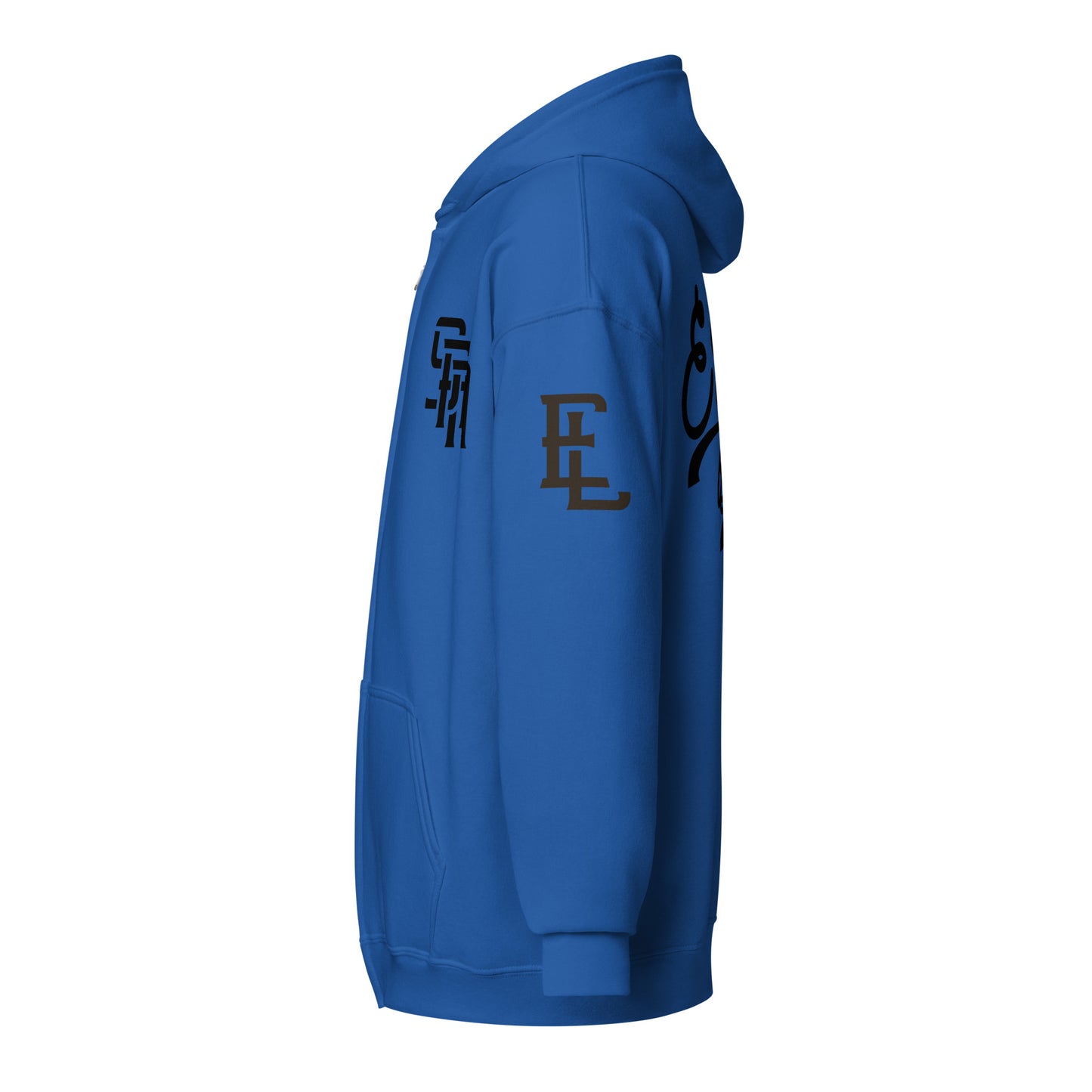 "SAN" Unisex Heavy Blend Zip Hoodie | E Luna Brand EXCLUSIVE | 4 Black Logos: Front Left, Left/Right Sleeves & Back Signature