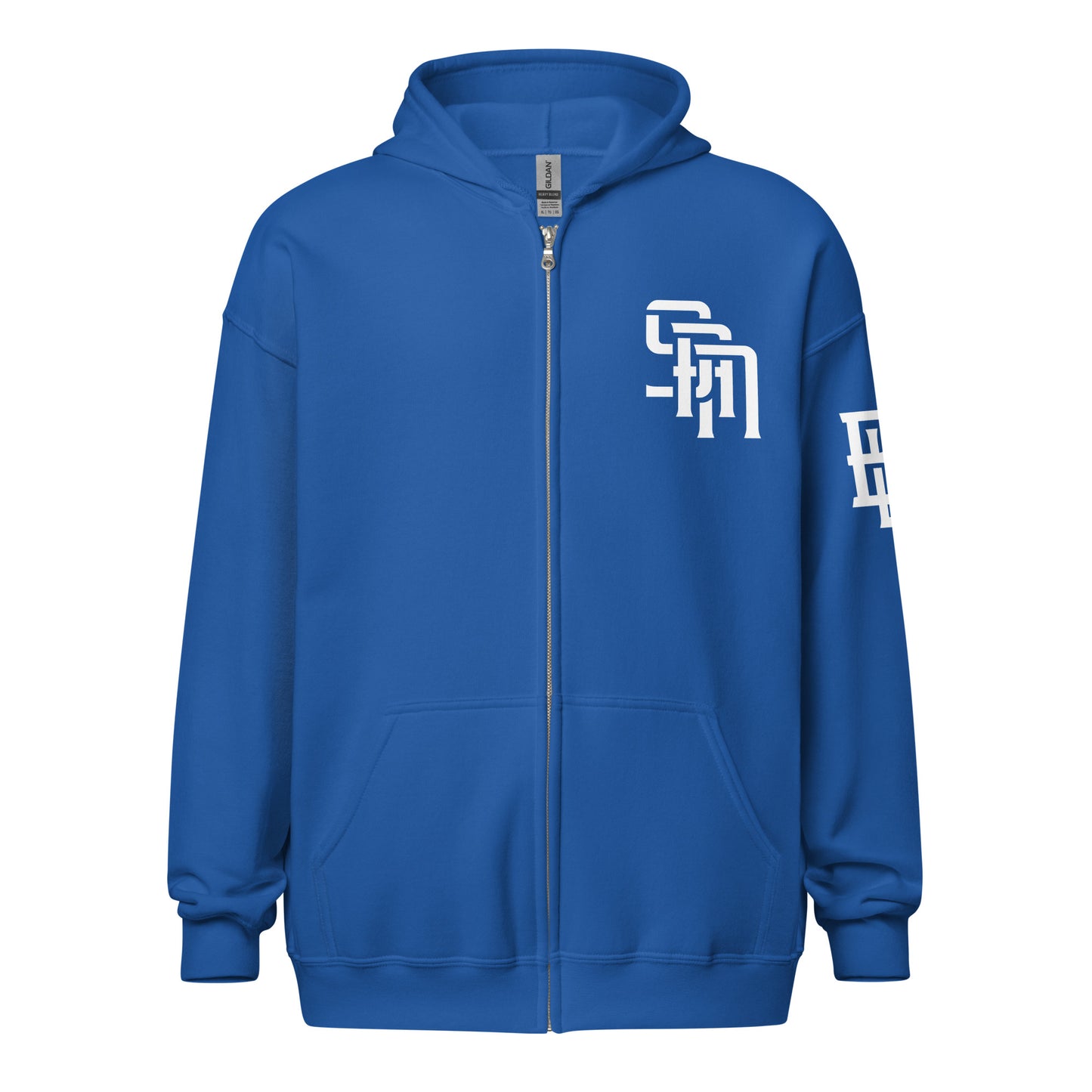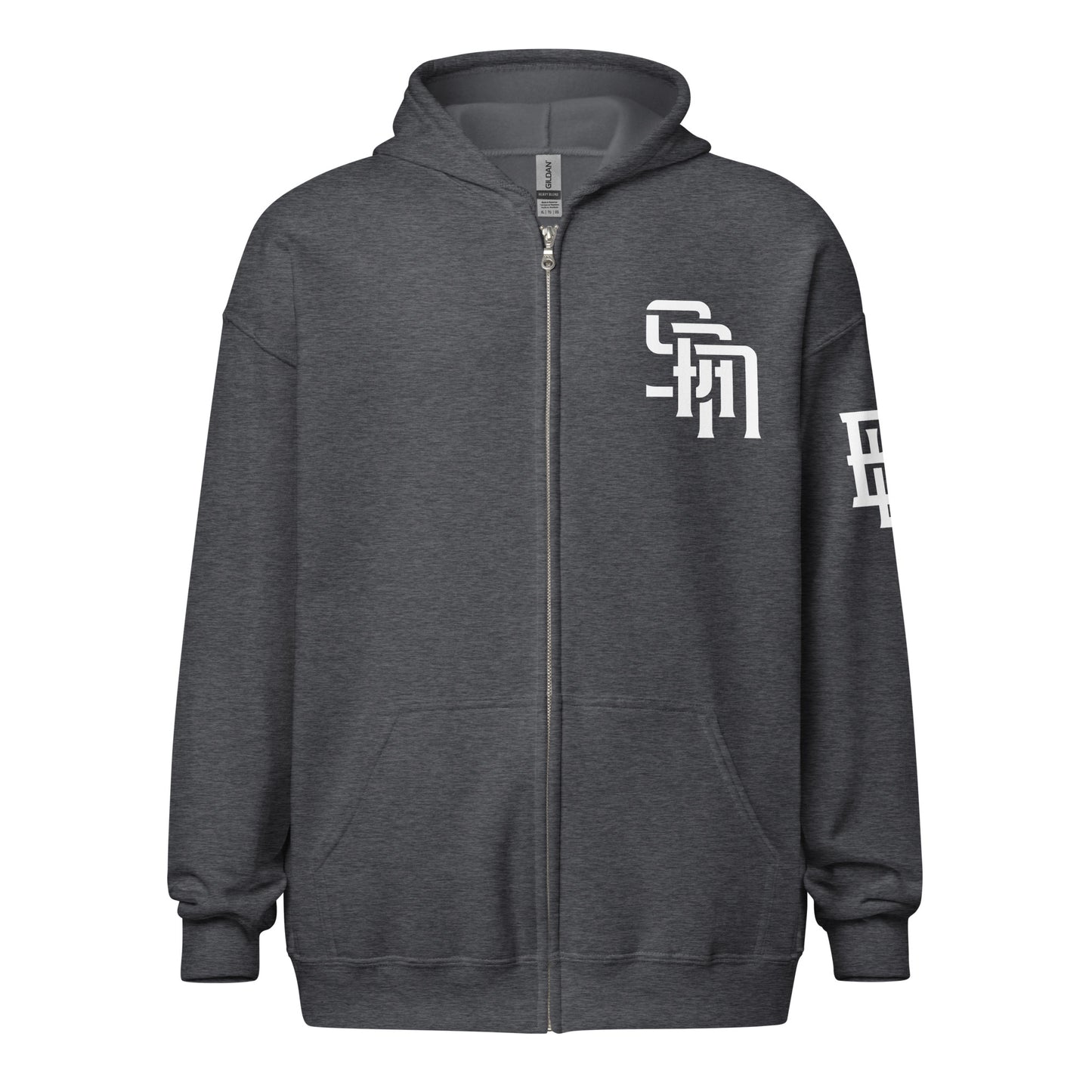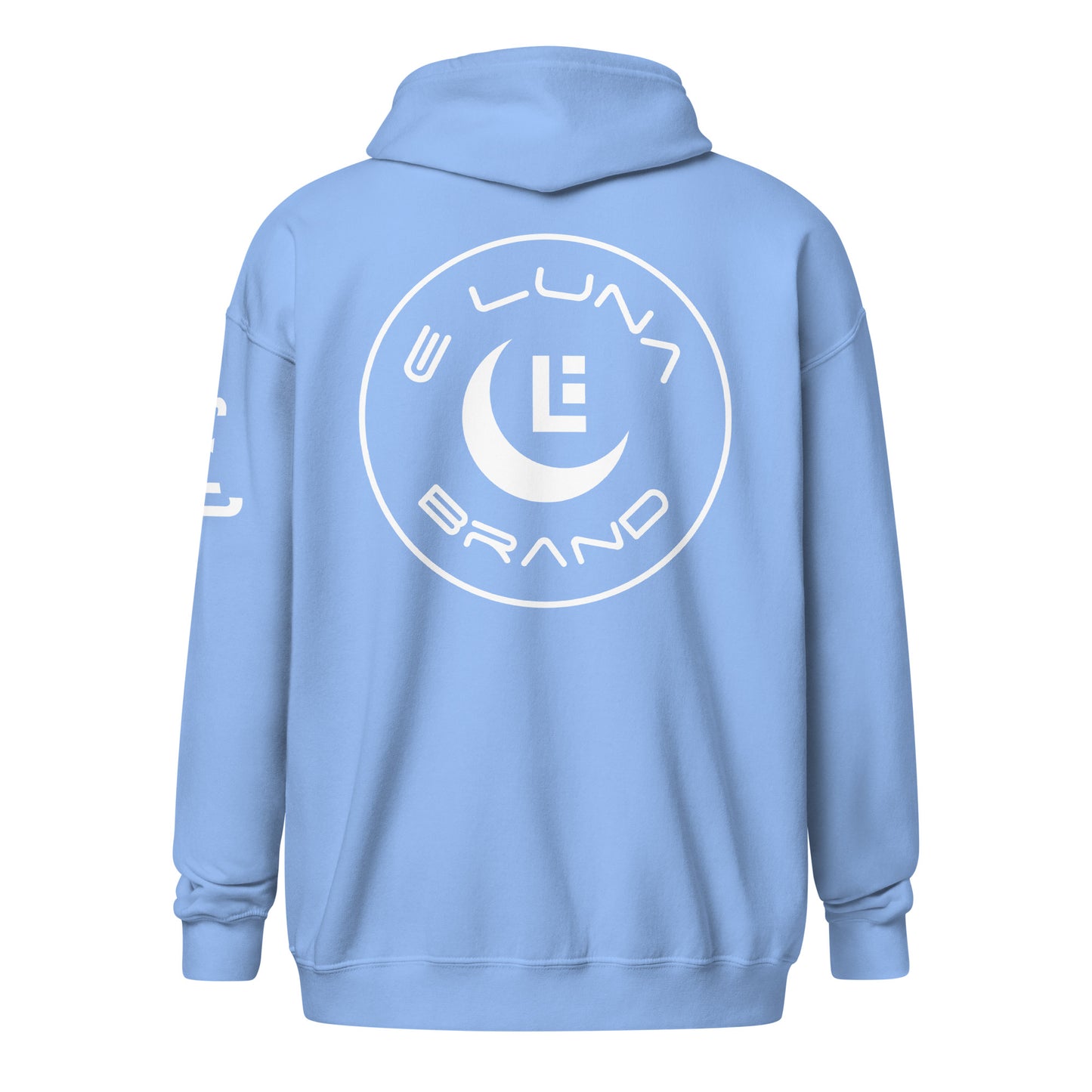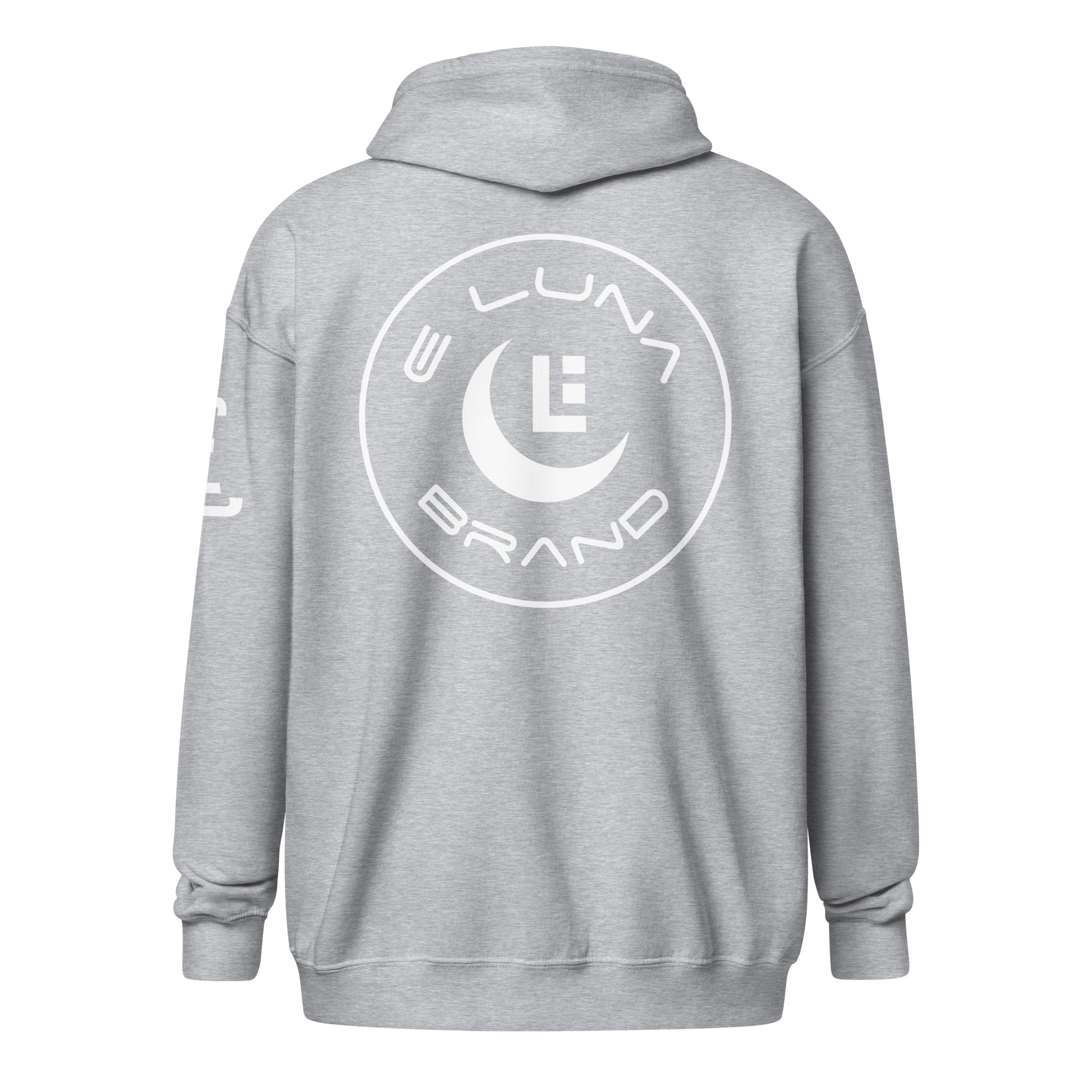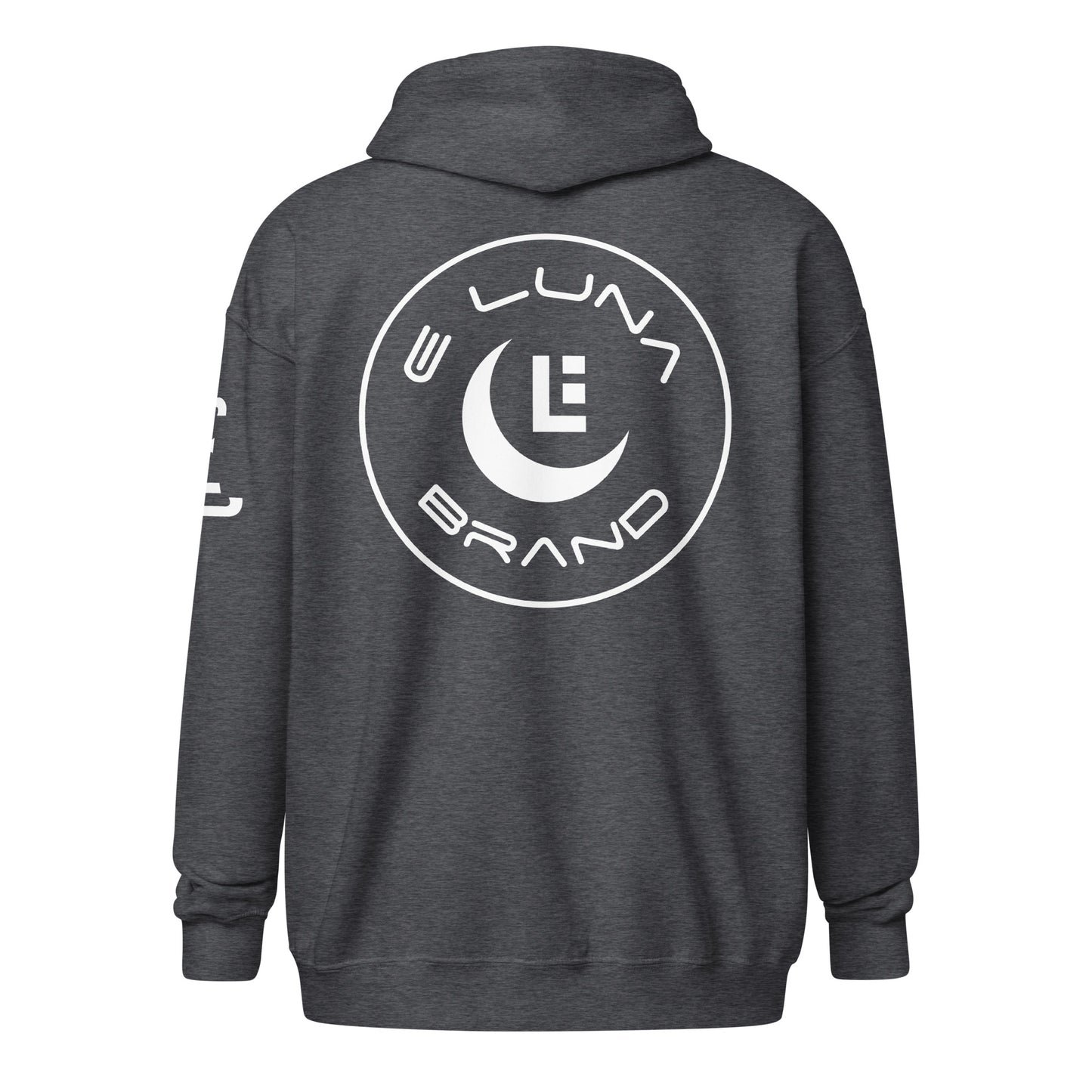 "SAN" Unisex Heavy Blend Zip Hoodie | E Luna Brand ELEMENT | 3 White Logos: Front Left, Left Sleeve & Back