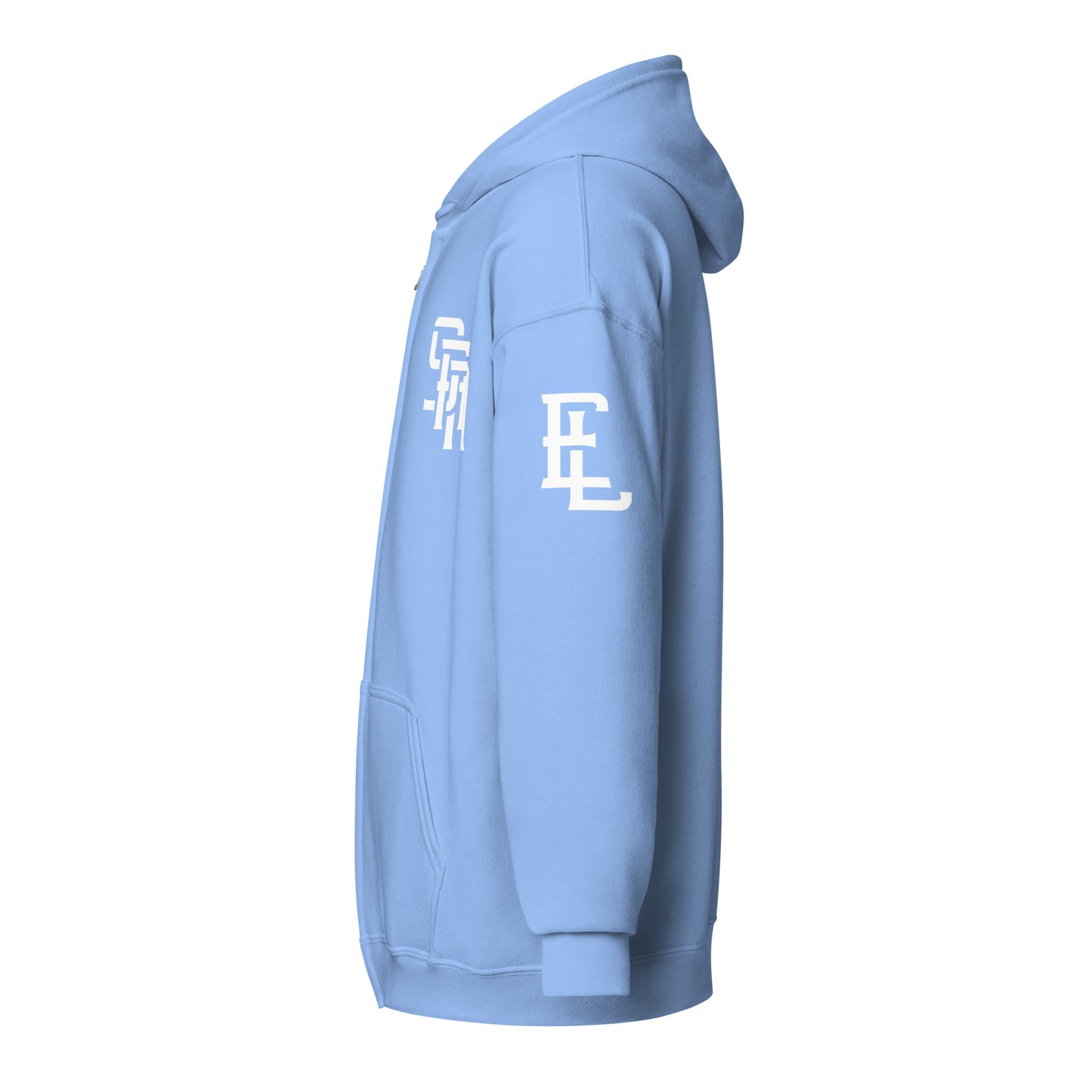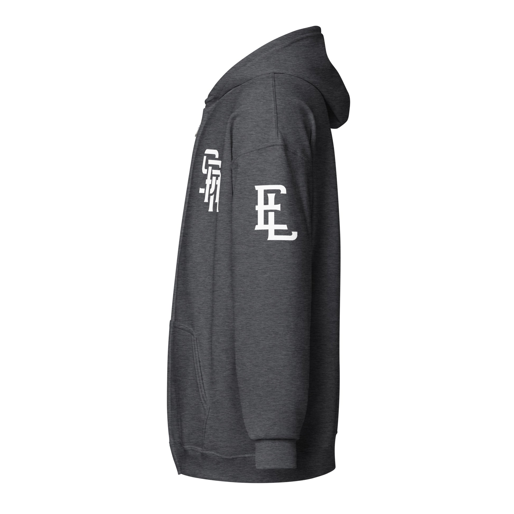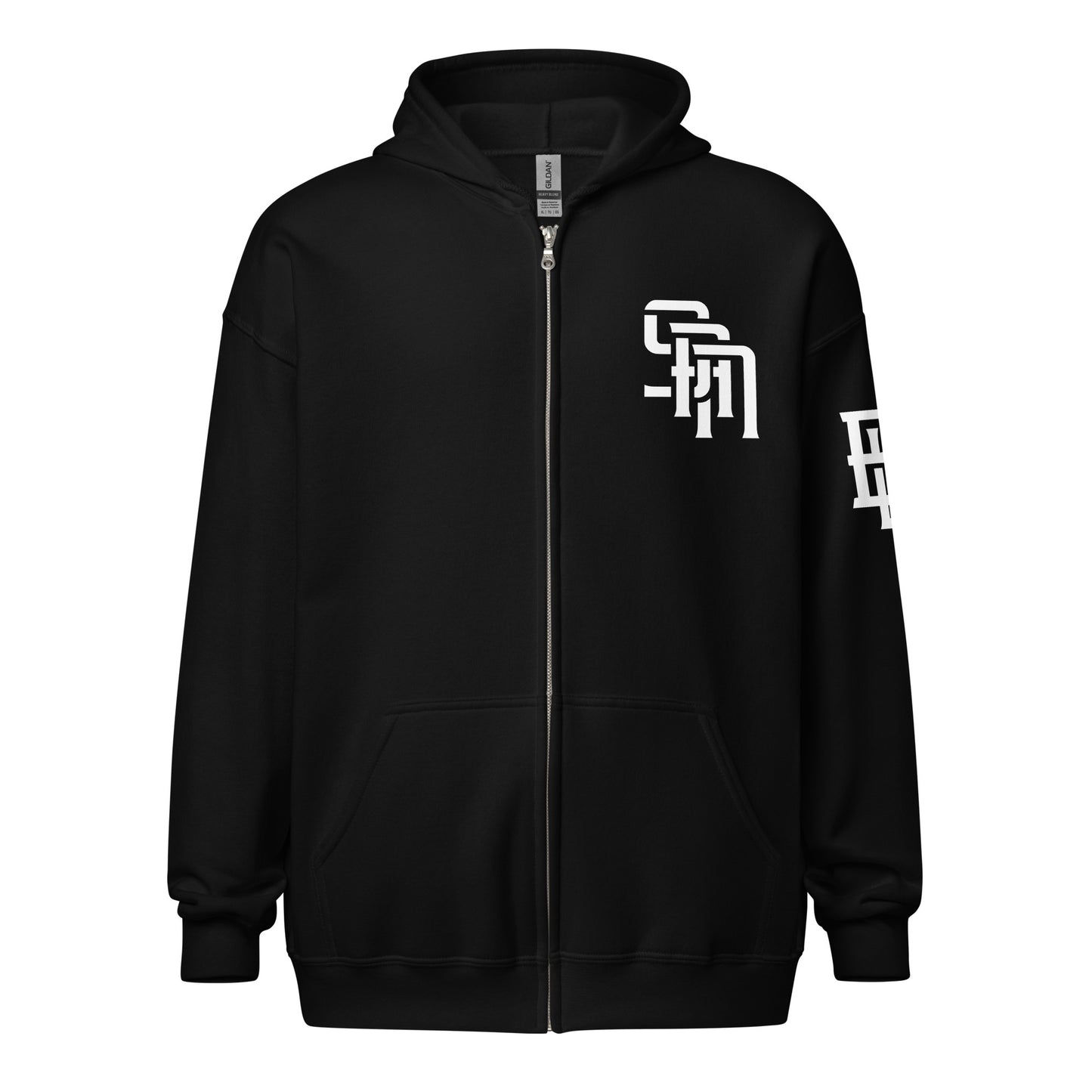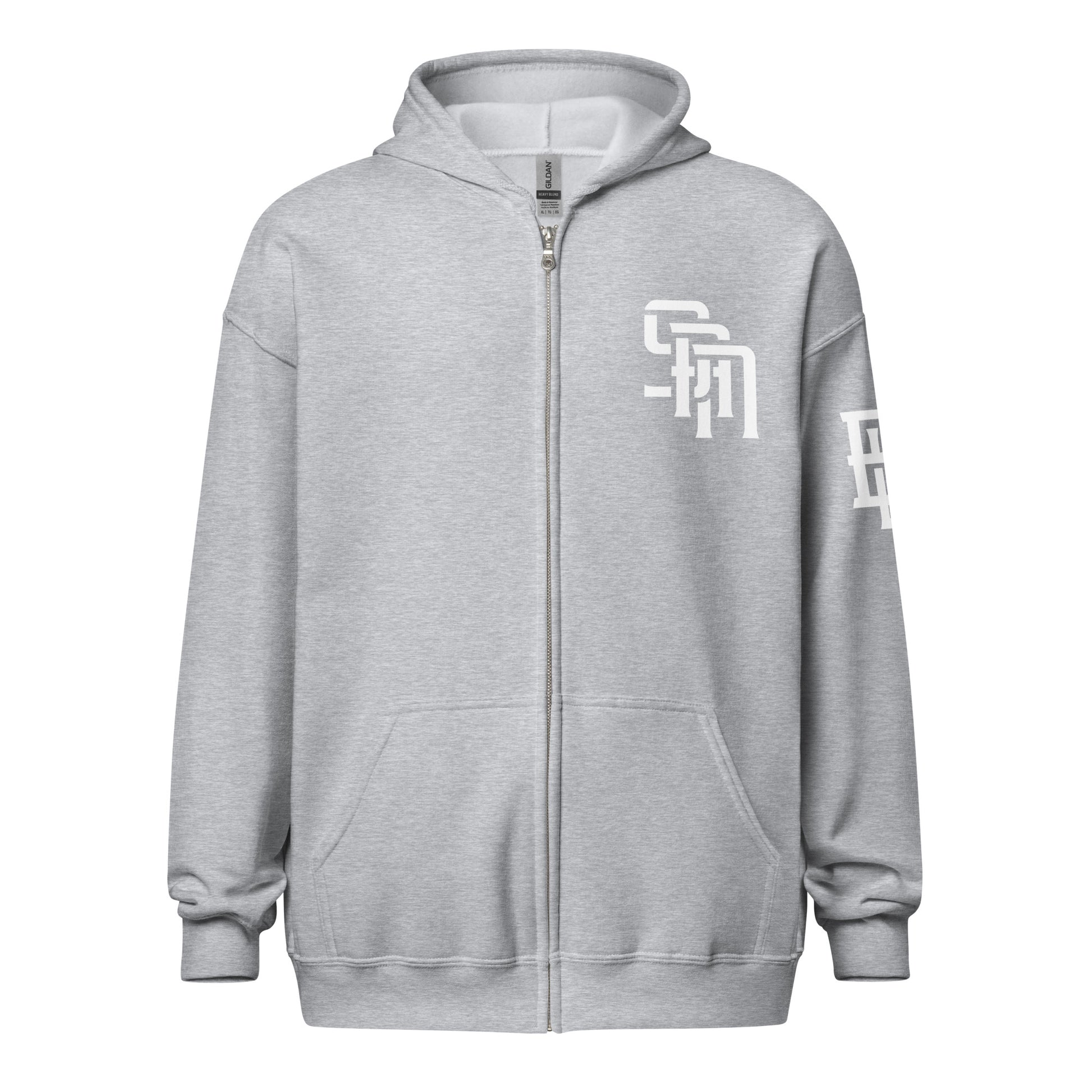 "SAN" Unisex Heavy Blend Zip Hoodie | E Luna Brand ESSENCE | 3 White Logos: Front Left, Left Sleeve & Outside Back Label