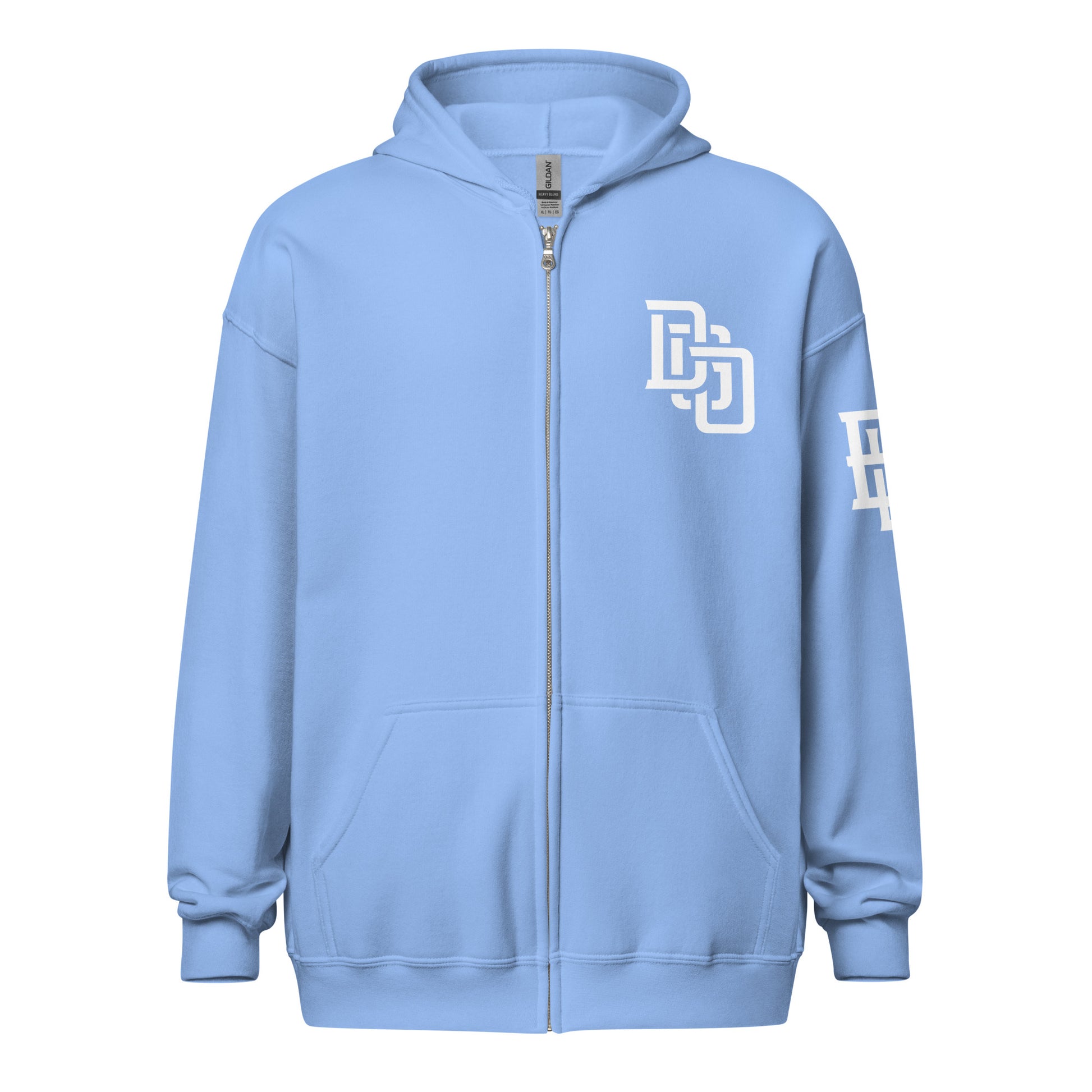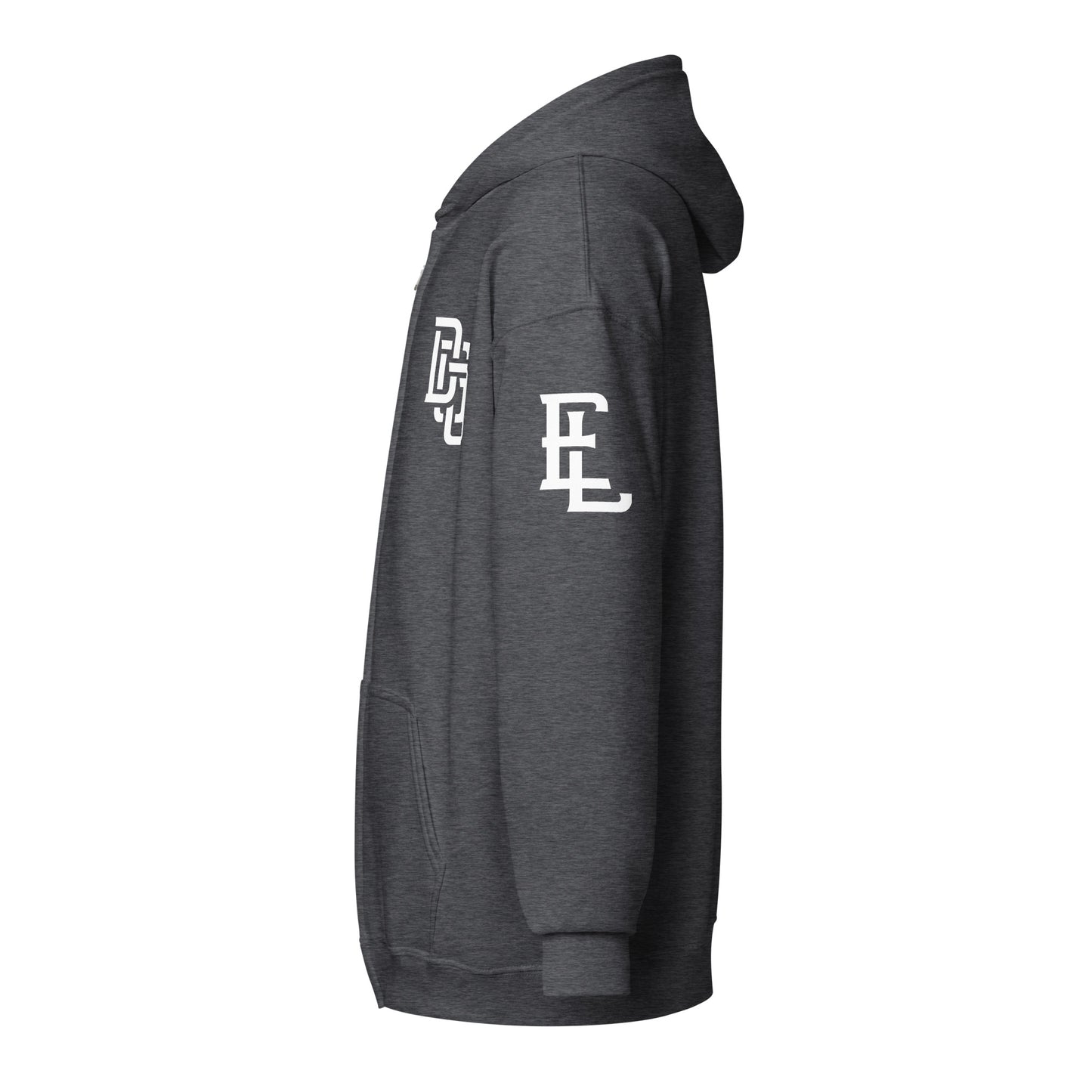 "DGO" Unisex Heavy Blend Zip Hoodie | Gildan 18600 | E Luna Brand ESSENCE Tricrest 3 White Logos: Front Upper Left, Left Arm & Outside Back Label