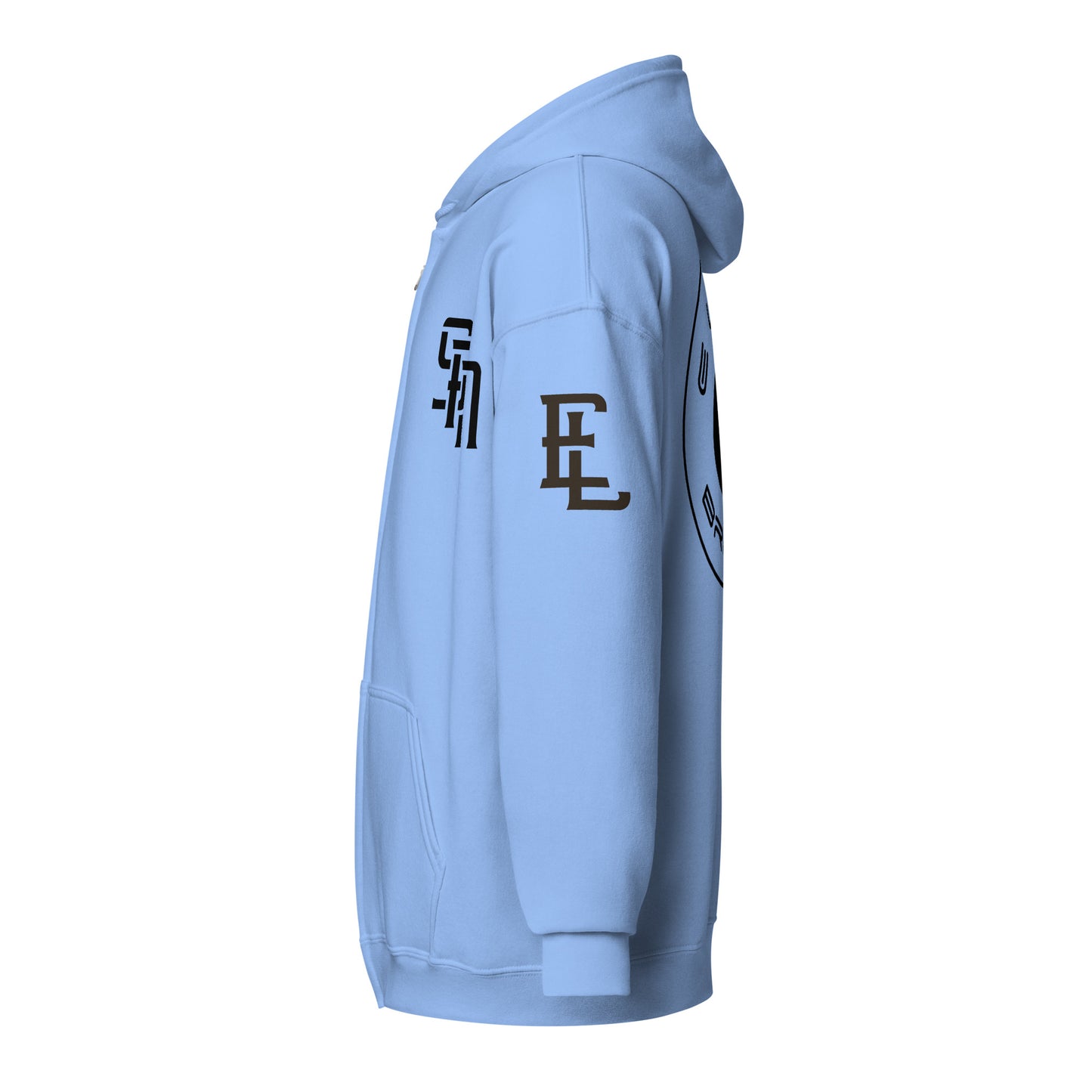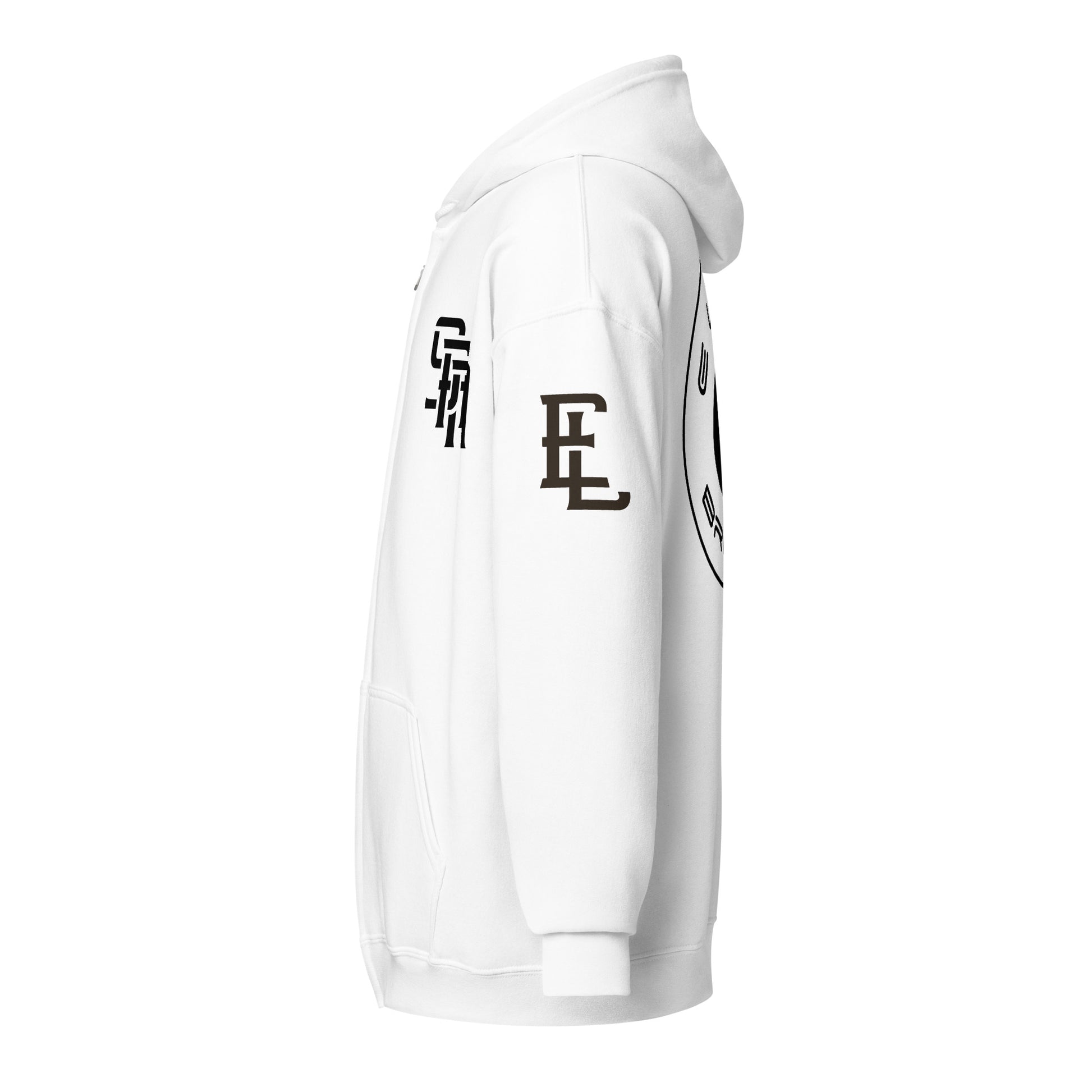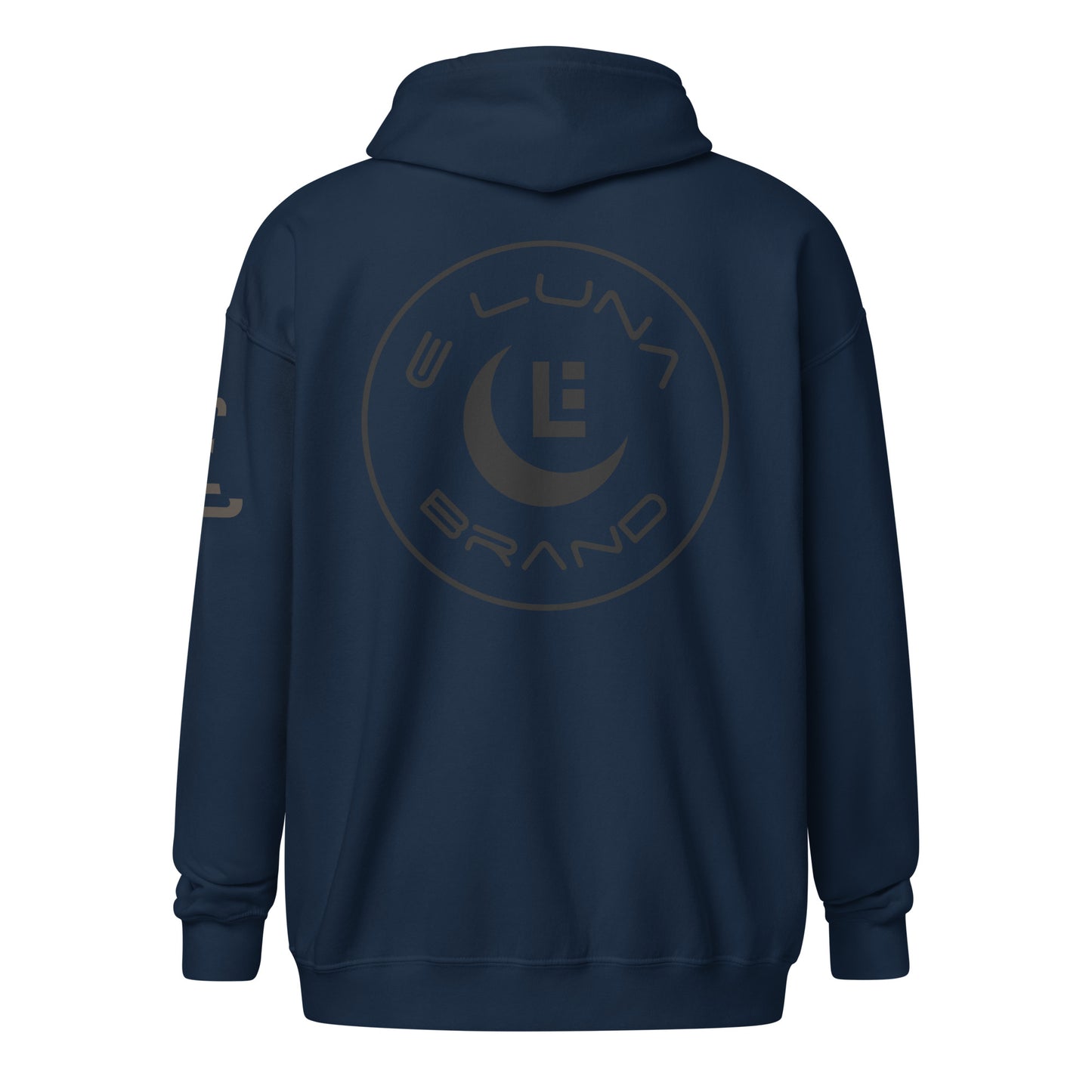 "SAN" Unisex Heavy Blend Zip Hoodie | E Luna Brand ELEMENT | 3 Black Logos: Front Left, Left Sleeve & Back
