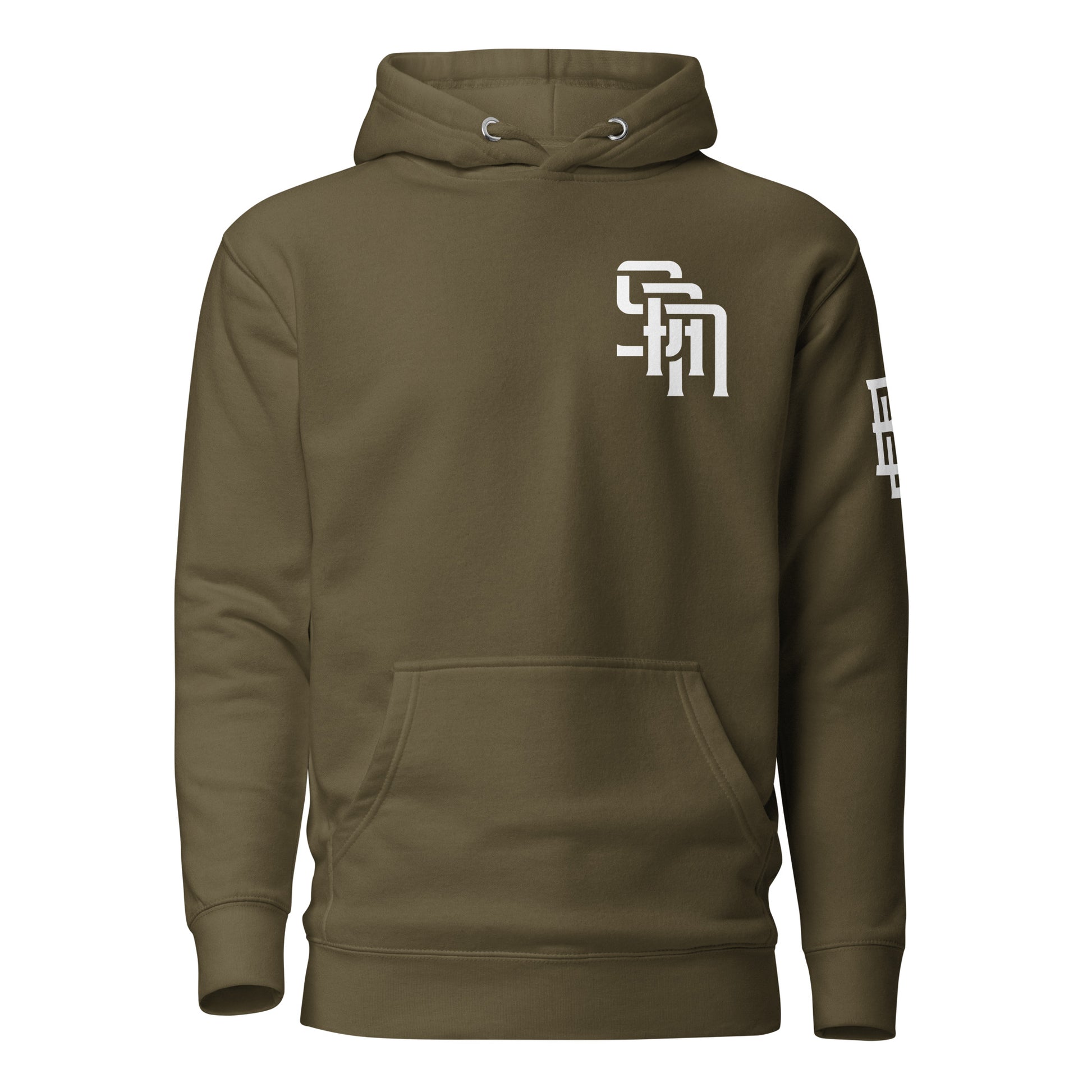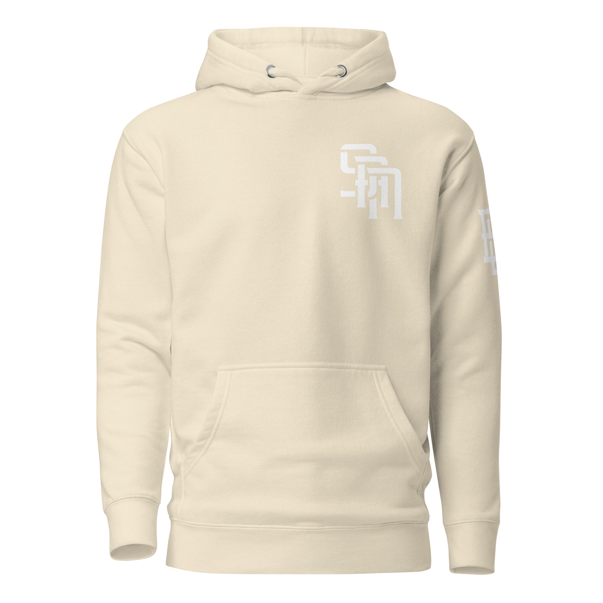 "SAN" Unisex Premium Hoodie | E Luna Brand ESSENCE | 3 White Logos: Front Left, Left Sleeve & Outside Back Label