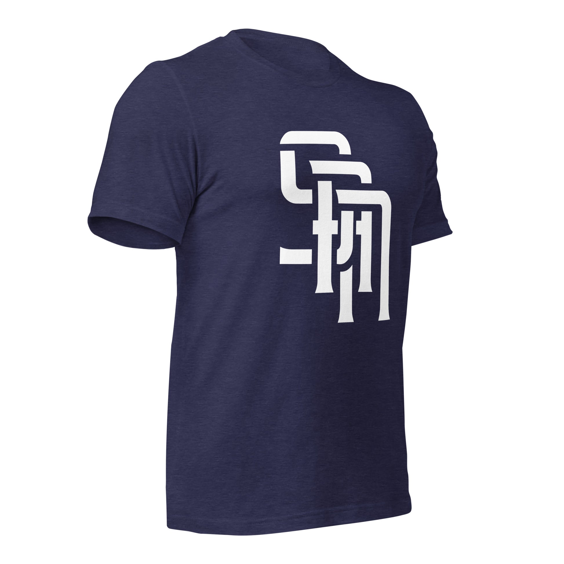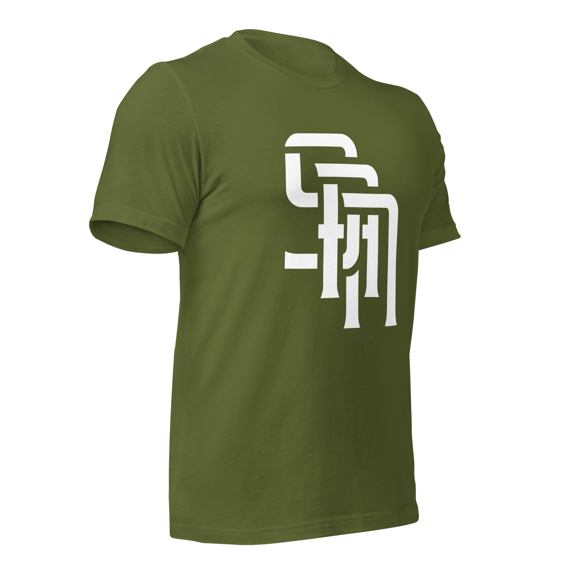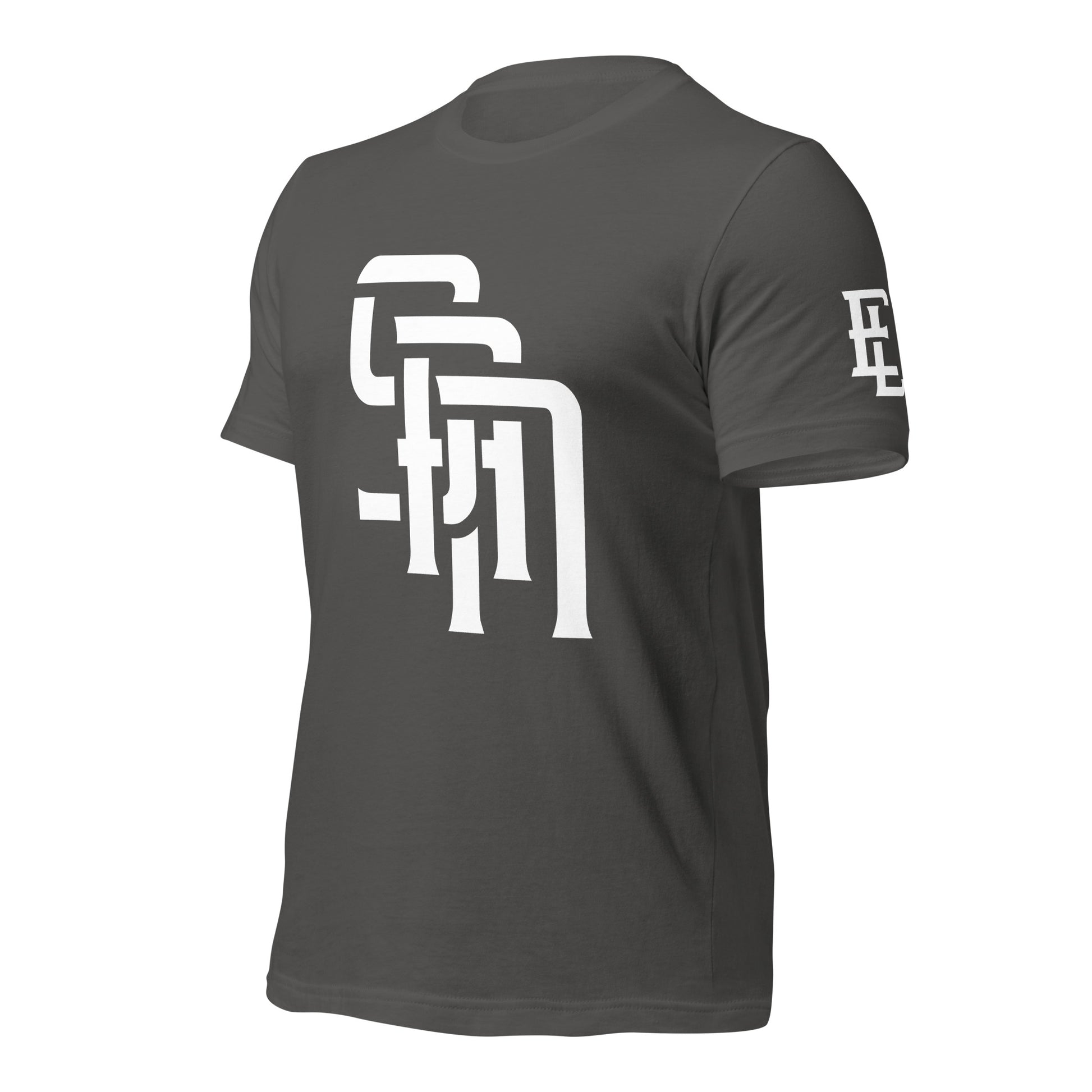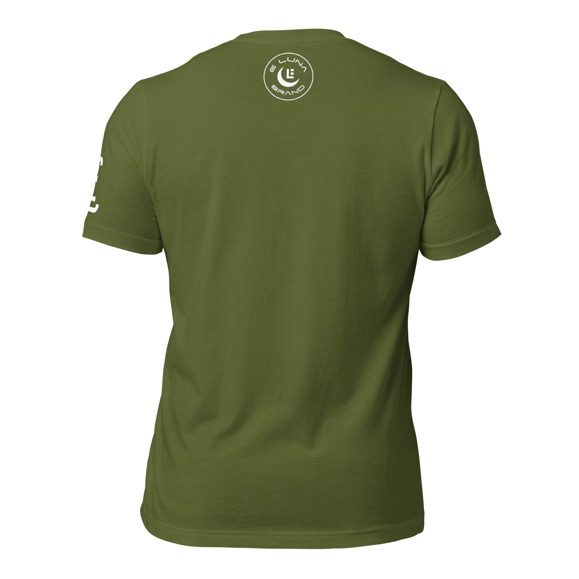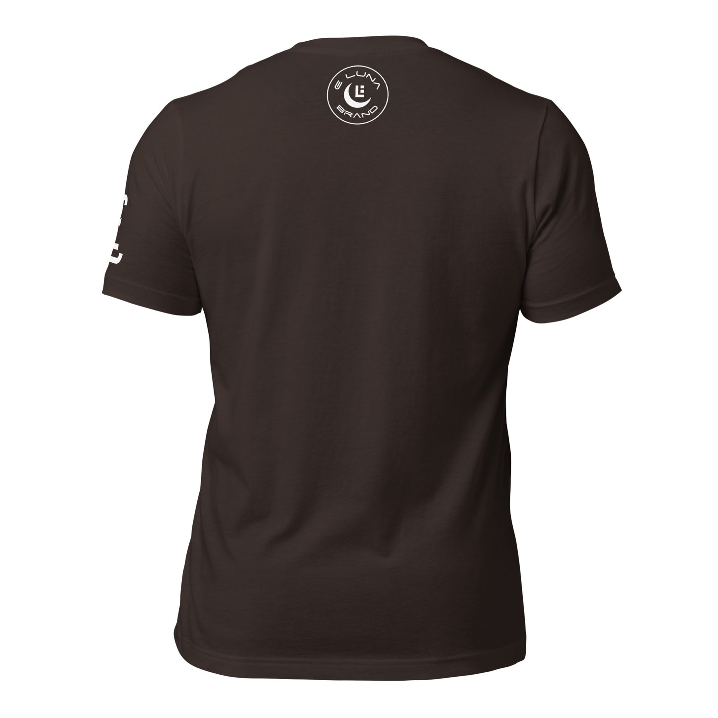 "SAN" Unisex Staple T-Shirt | E Luna Brand ESSENCE | 3 White Logos: Front, Left Sleeve & Outside Back Label