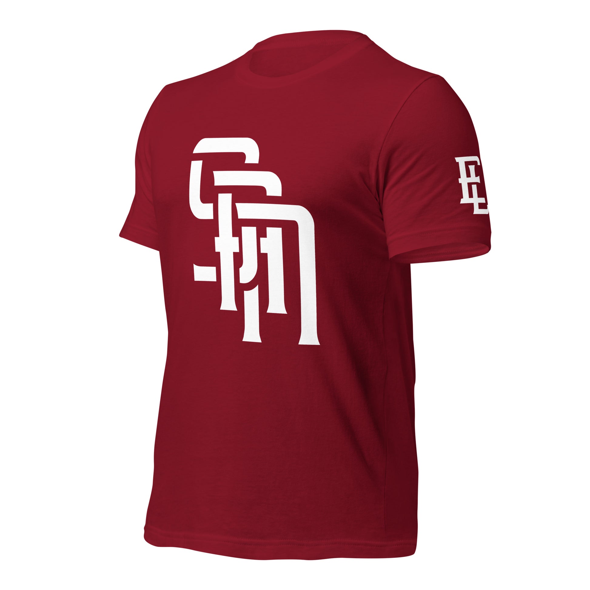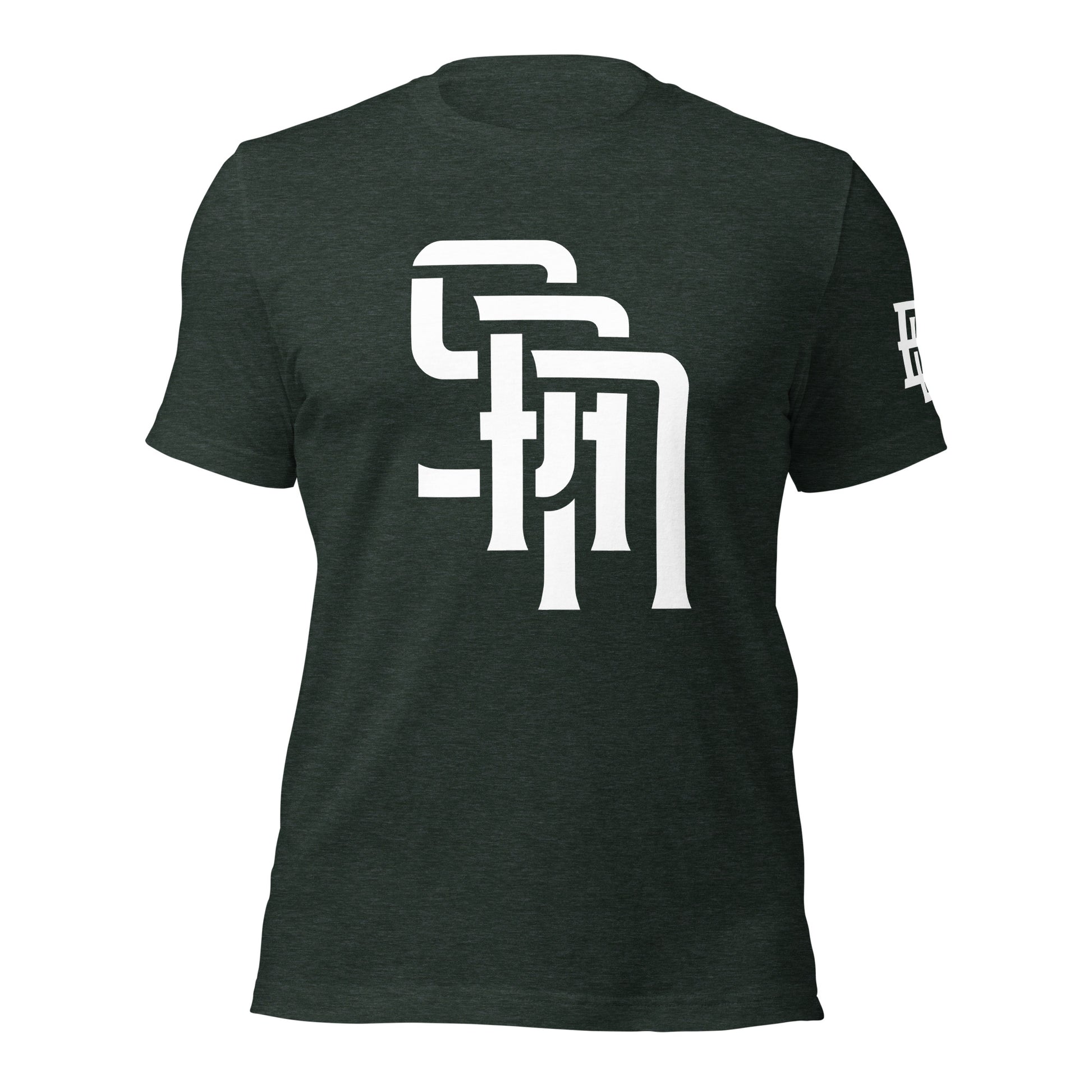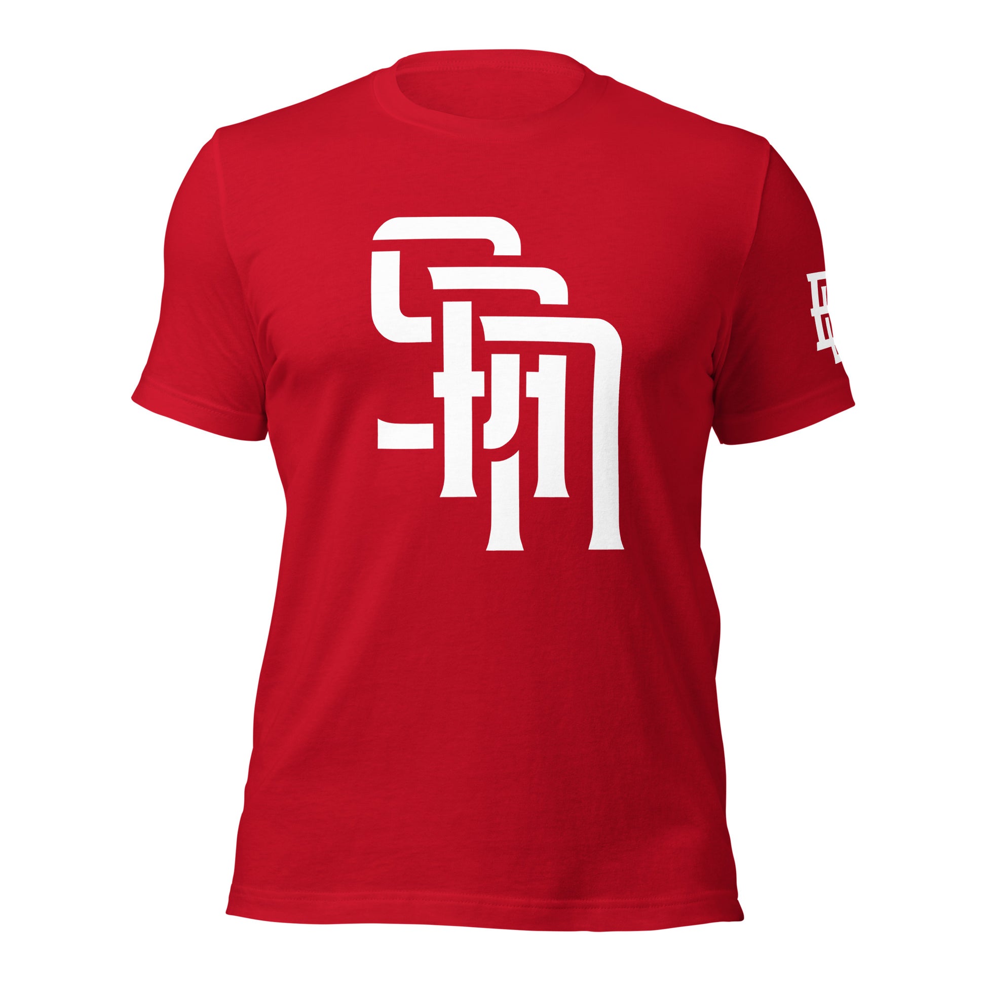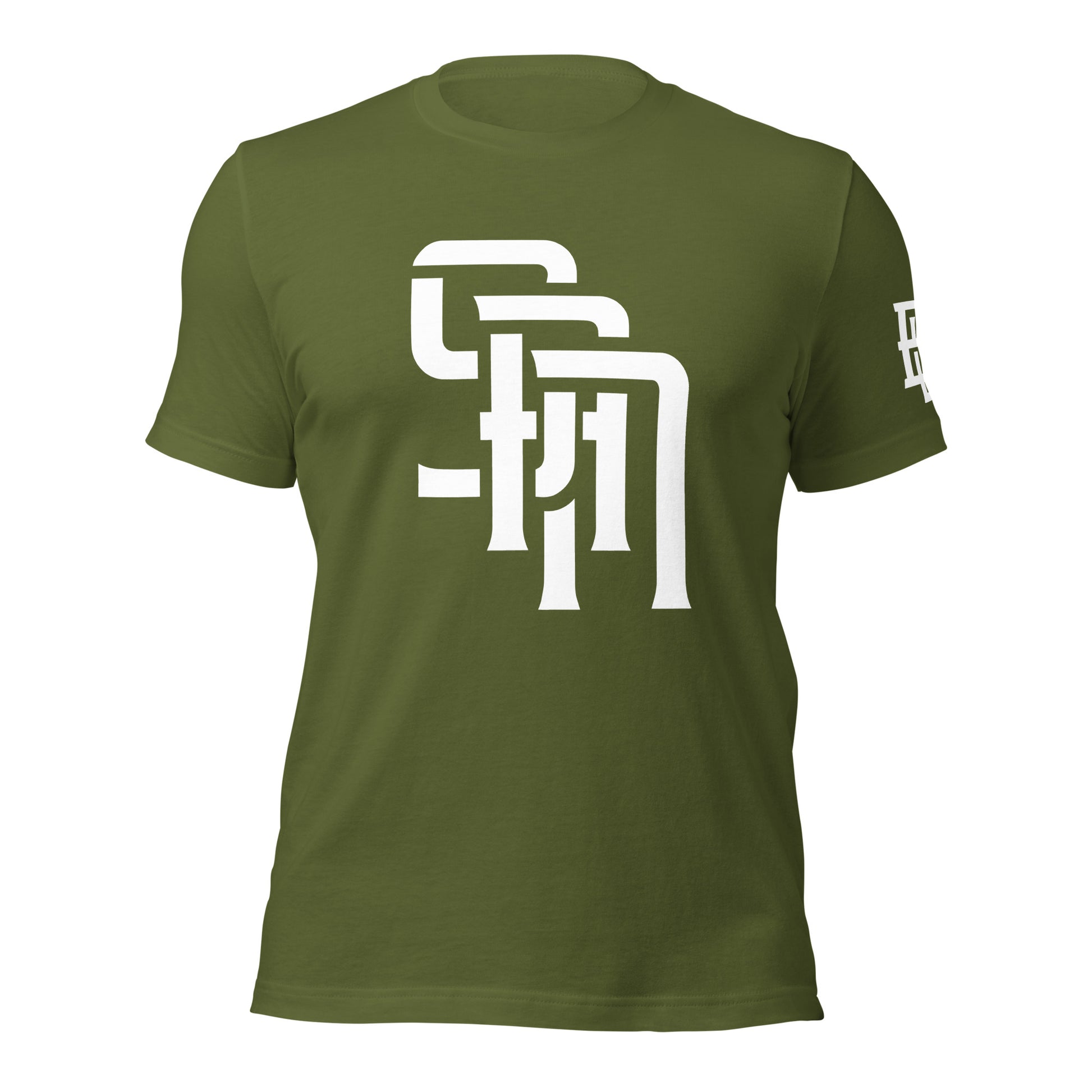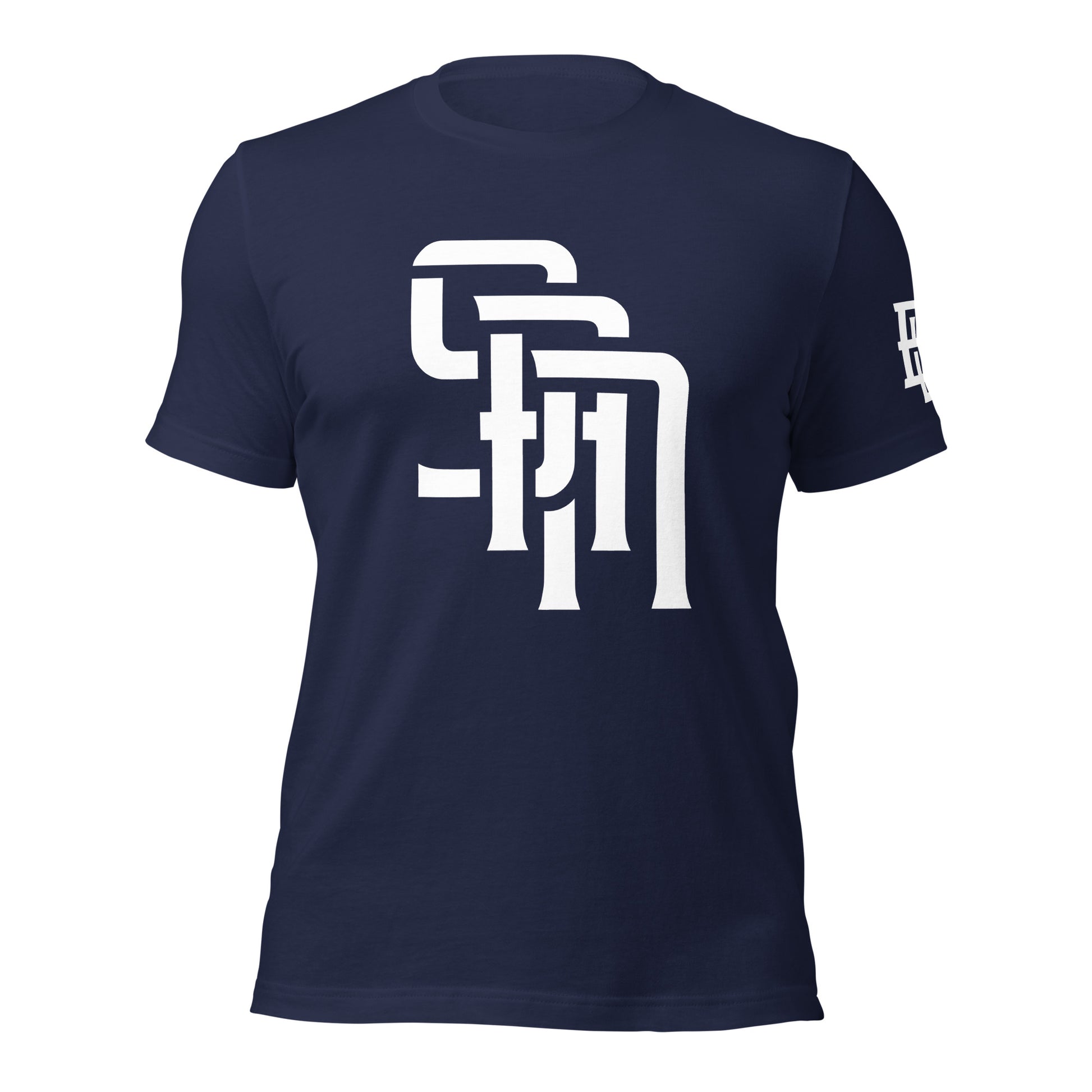 "SAN" Unisex Staple T-Shirt | E Luna Brand ESSENCE | 3 White Logos: Front, Left Sleeve & Outside Back Label