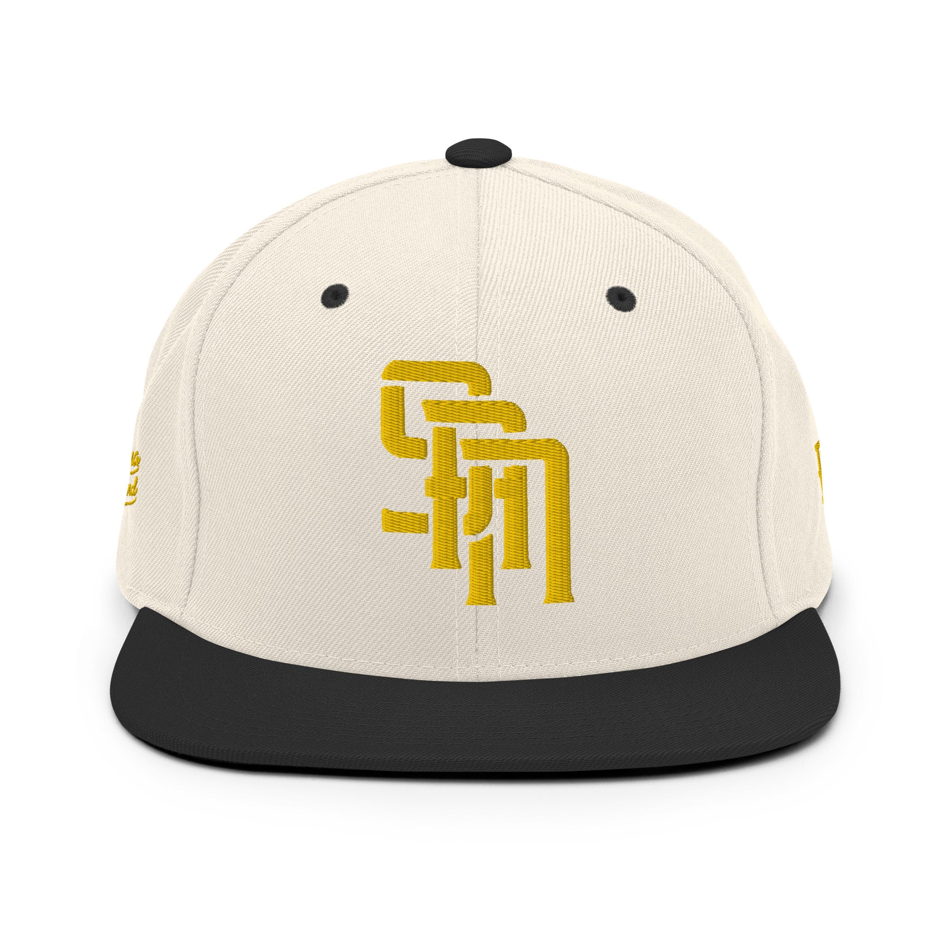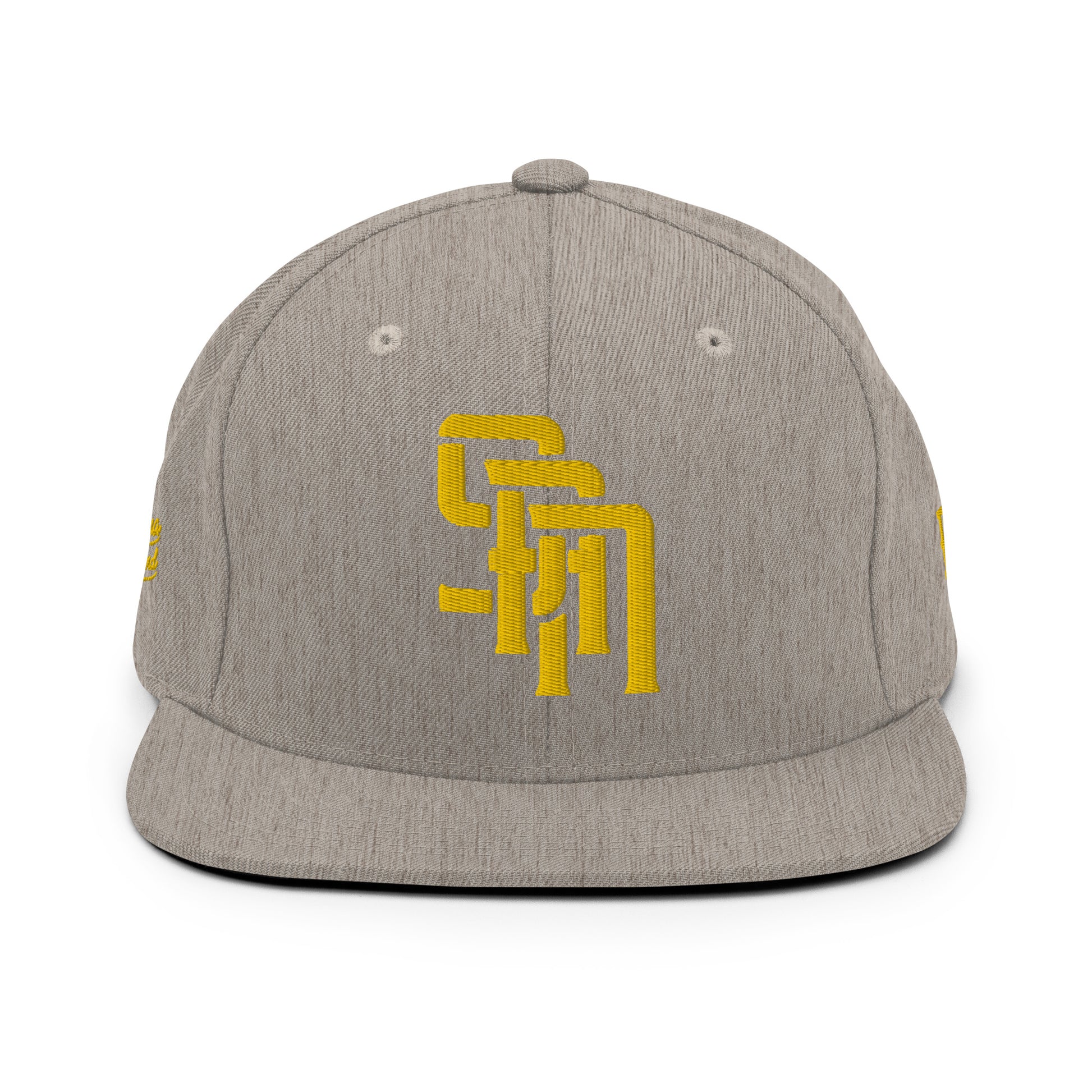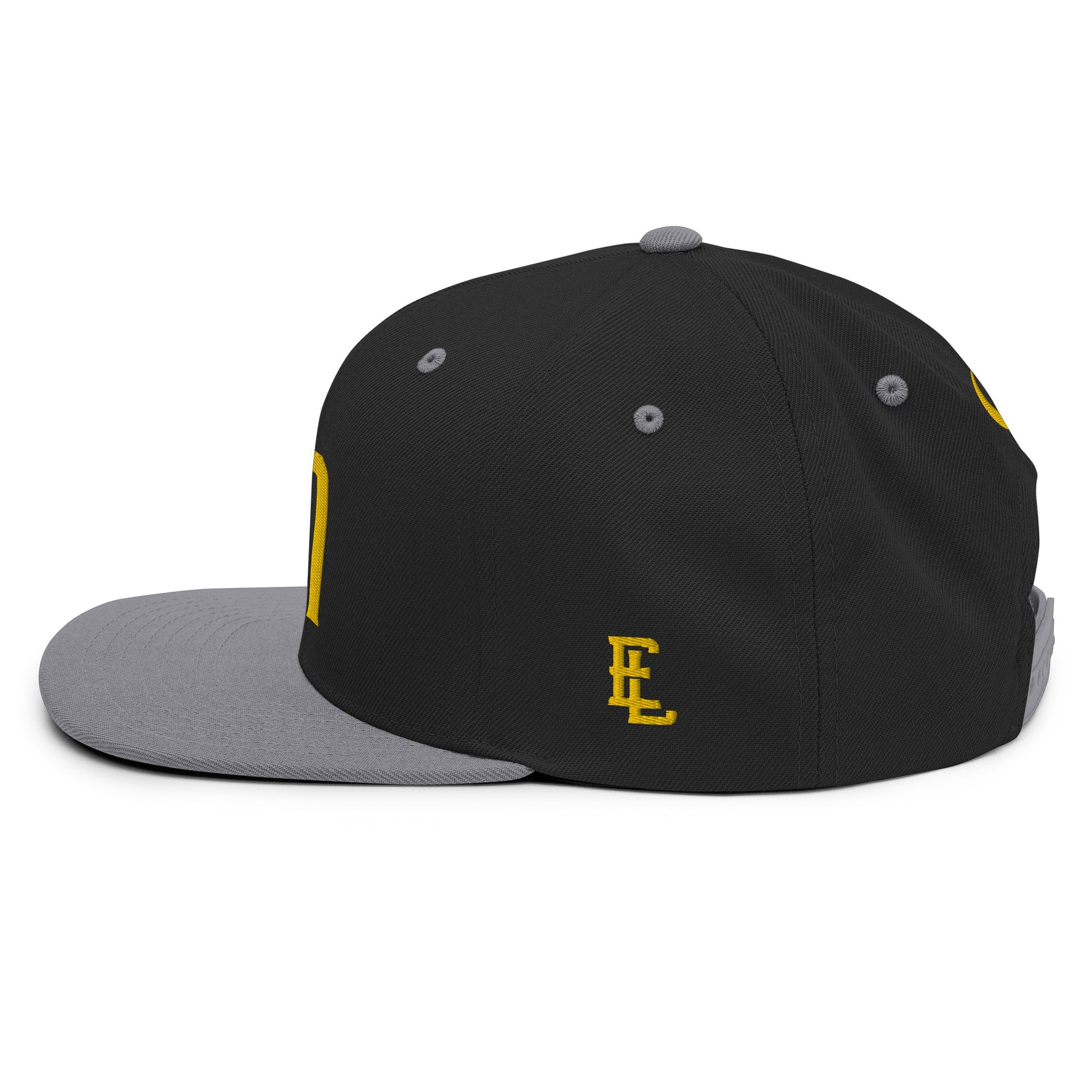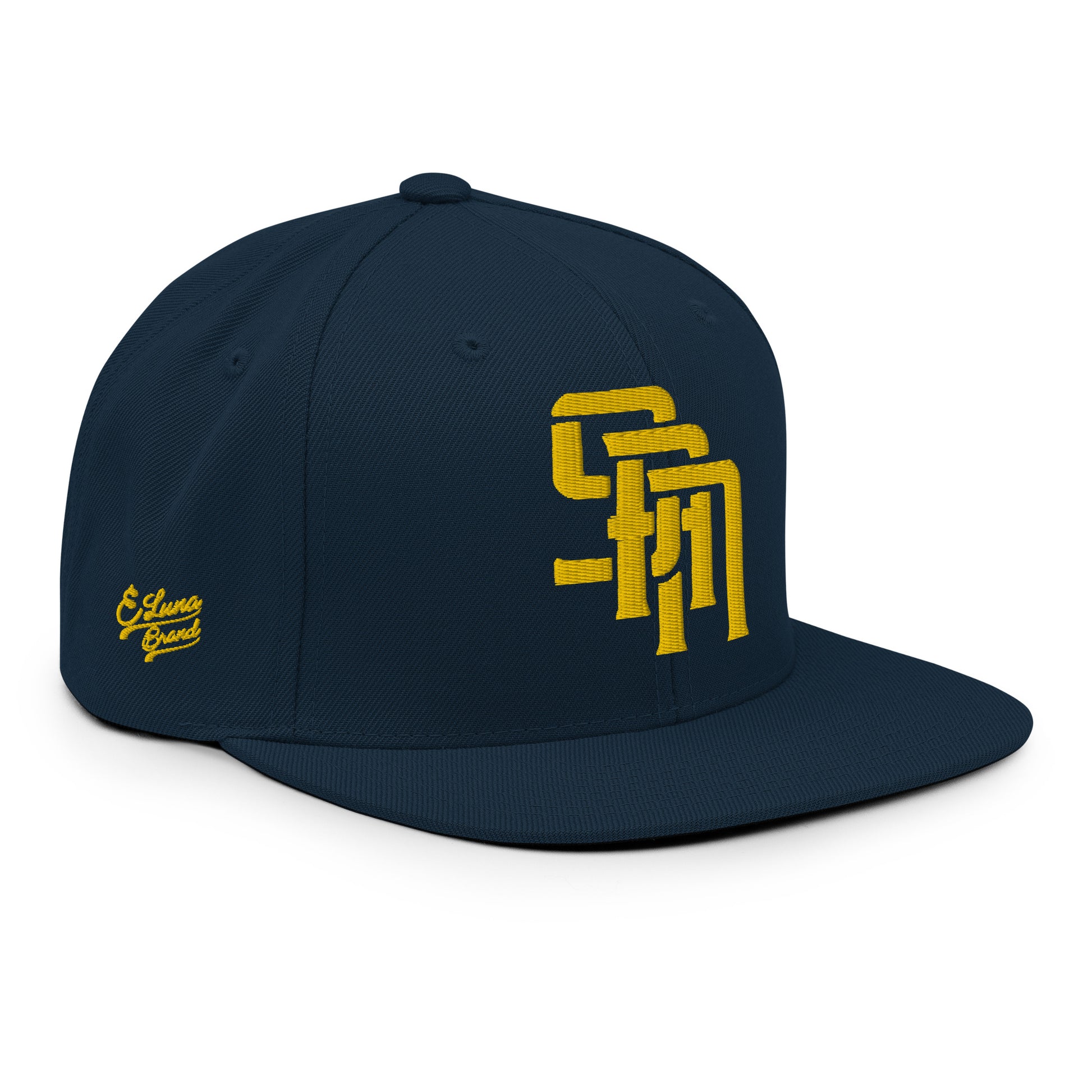 "SAN" Wool Blend Snapback Hat | Yupoong 6089M | E Luna Brand PREMIUM Quadcrest 4 Gold Thread Logos: Front, Left, Right Signature & Back [3D Puff Edition]