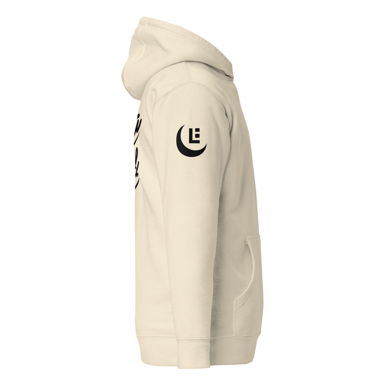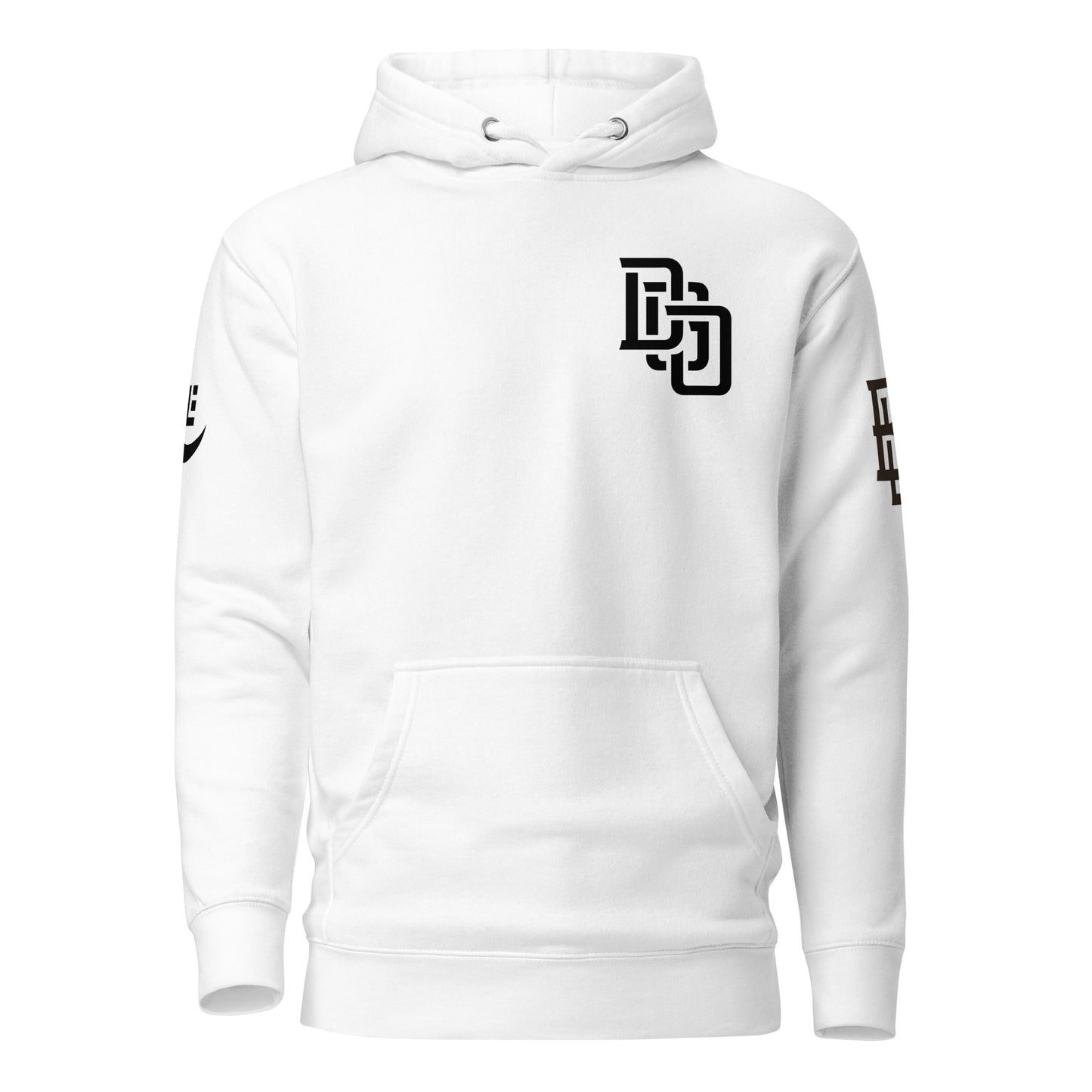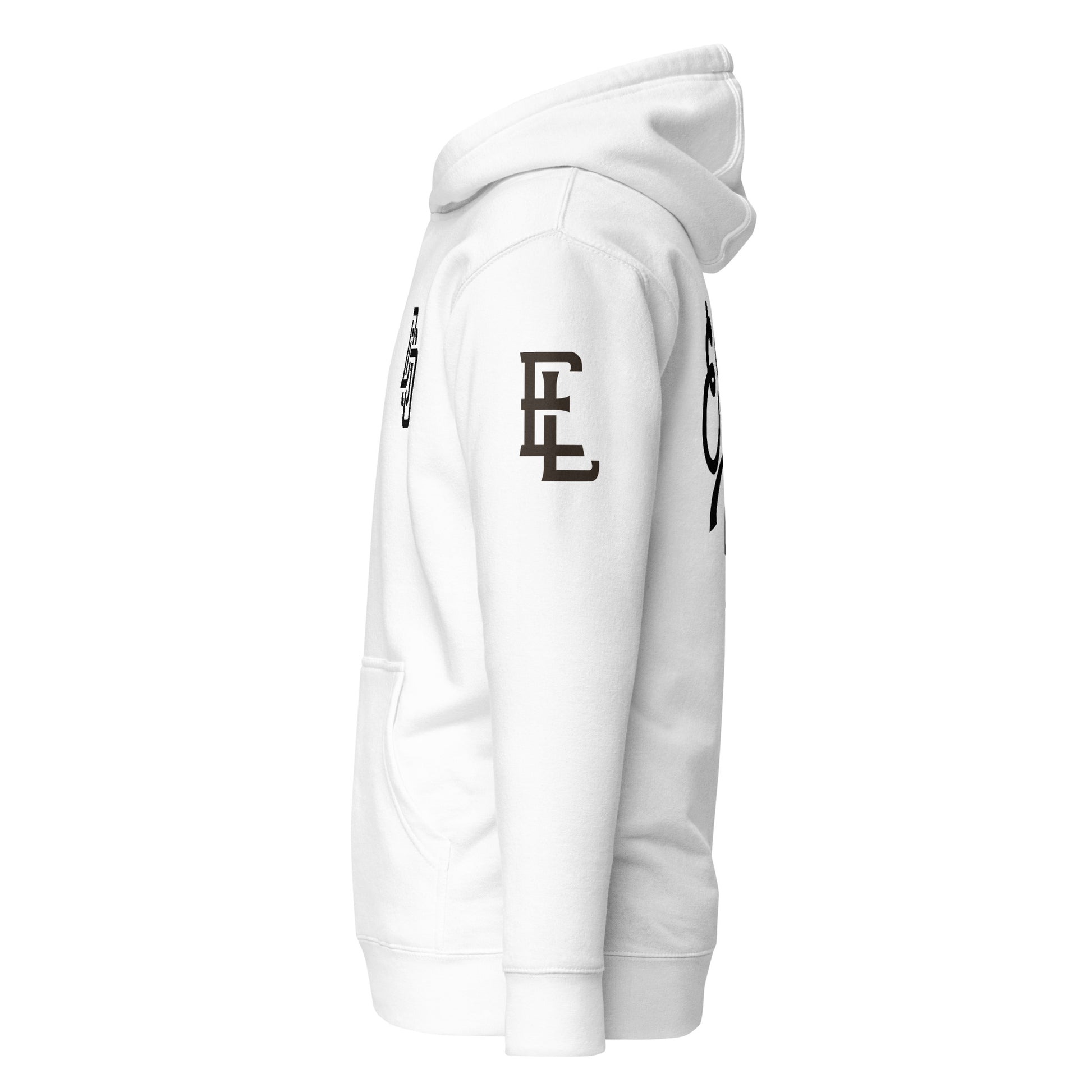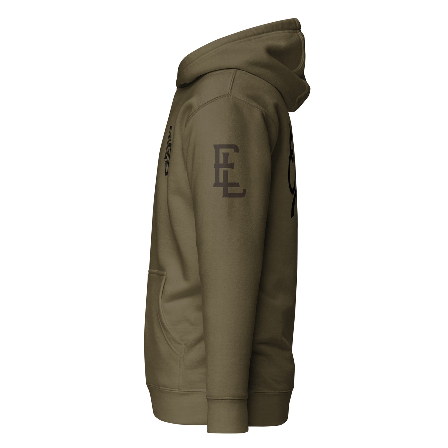 "DGO" Unisex Premium Hoodie | Cotton Heritage M2580 | E Luna Brand LEGACY Quadcrest 4 White Logos: Front Upper Left, Left/Right Arm & Back Signature (Large)