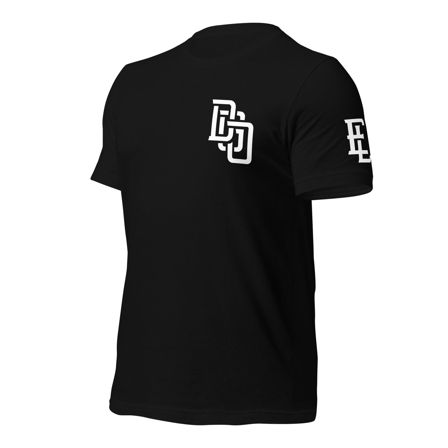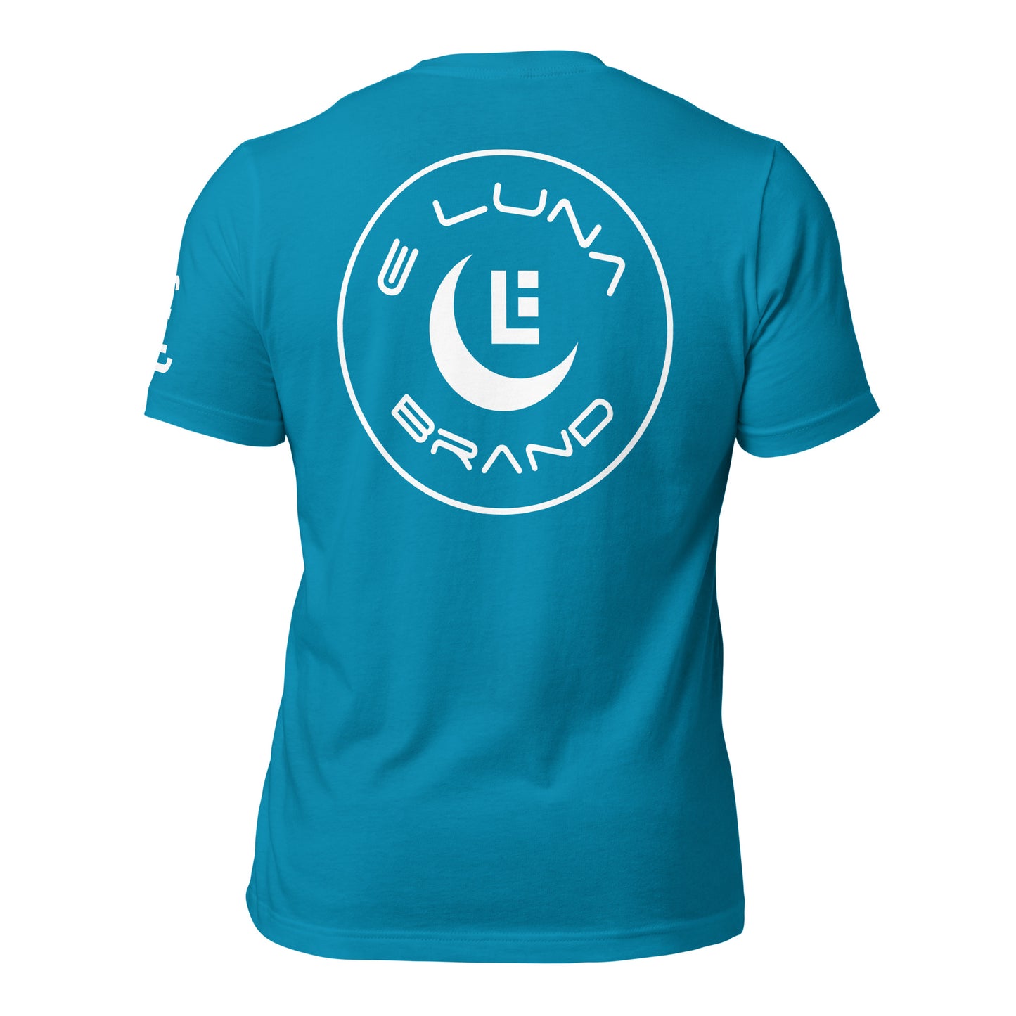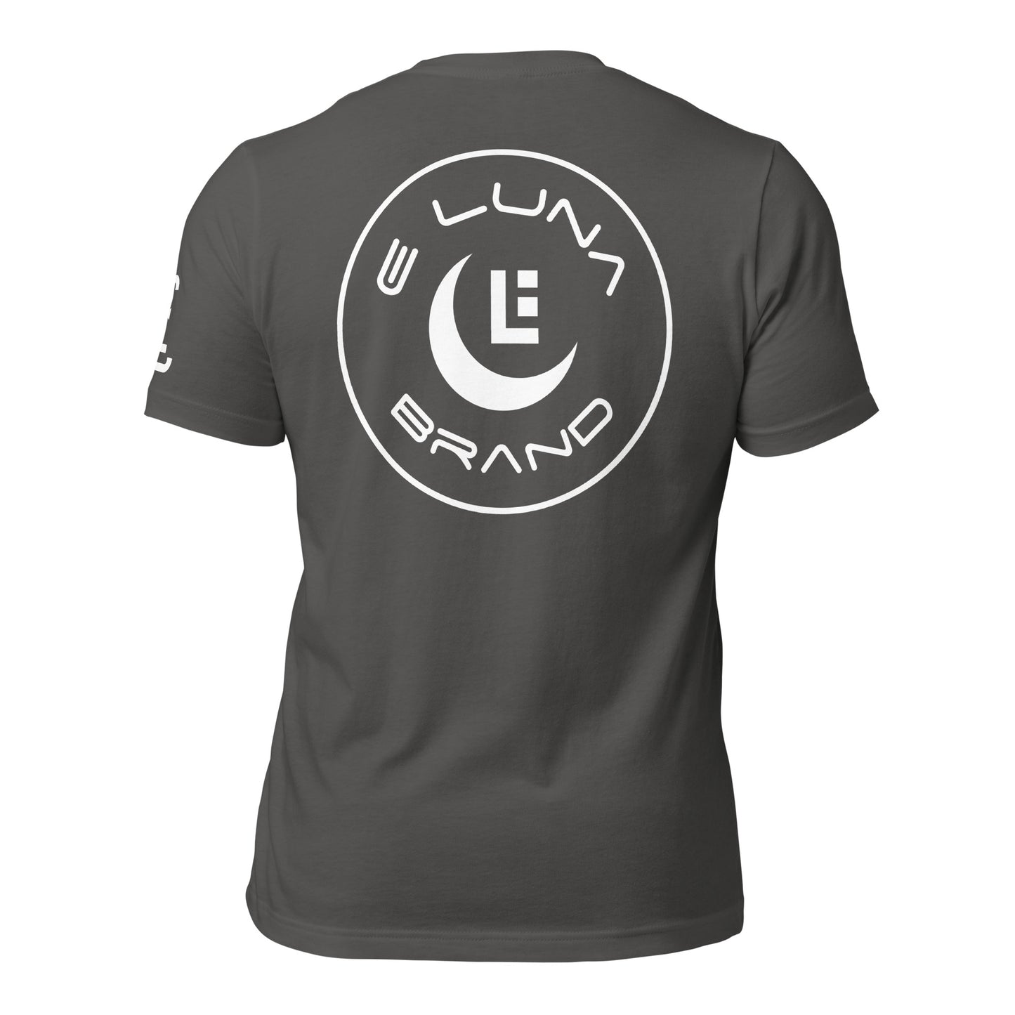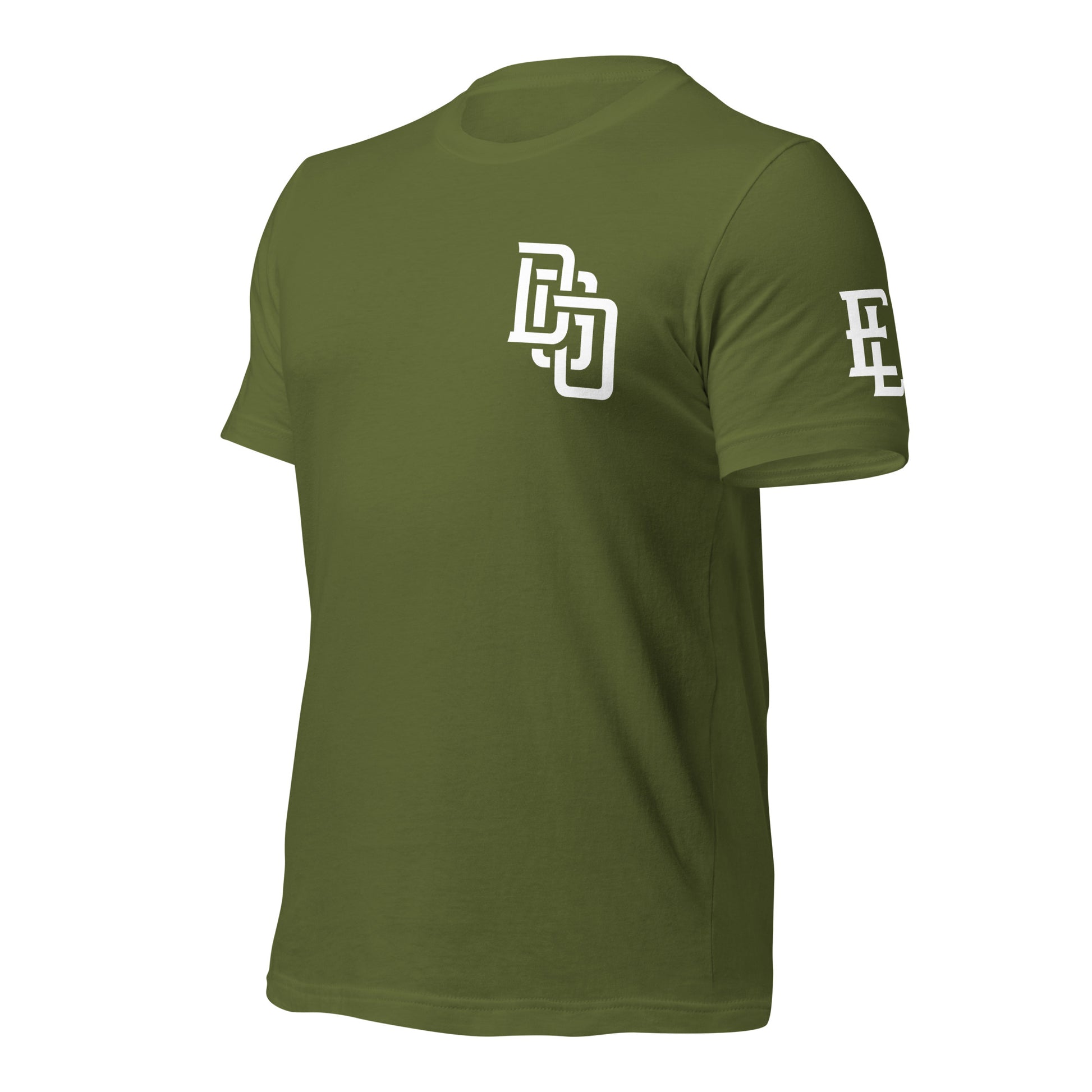 "DGO" Unisex Staple T-Shirt | Bella + Canvas 3001 | E Luna Brand ELEMENT Tricrest 3 White Logos: Front Upper Left, Left Arm & Back (Large)