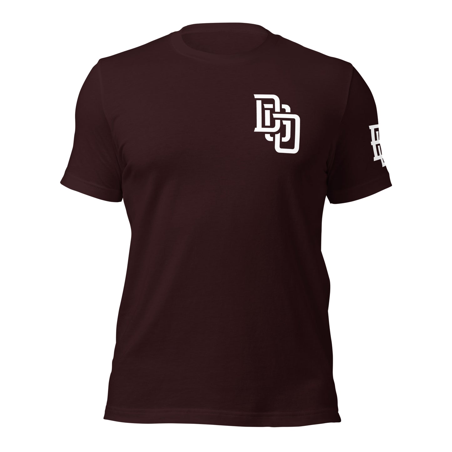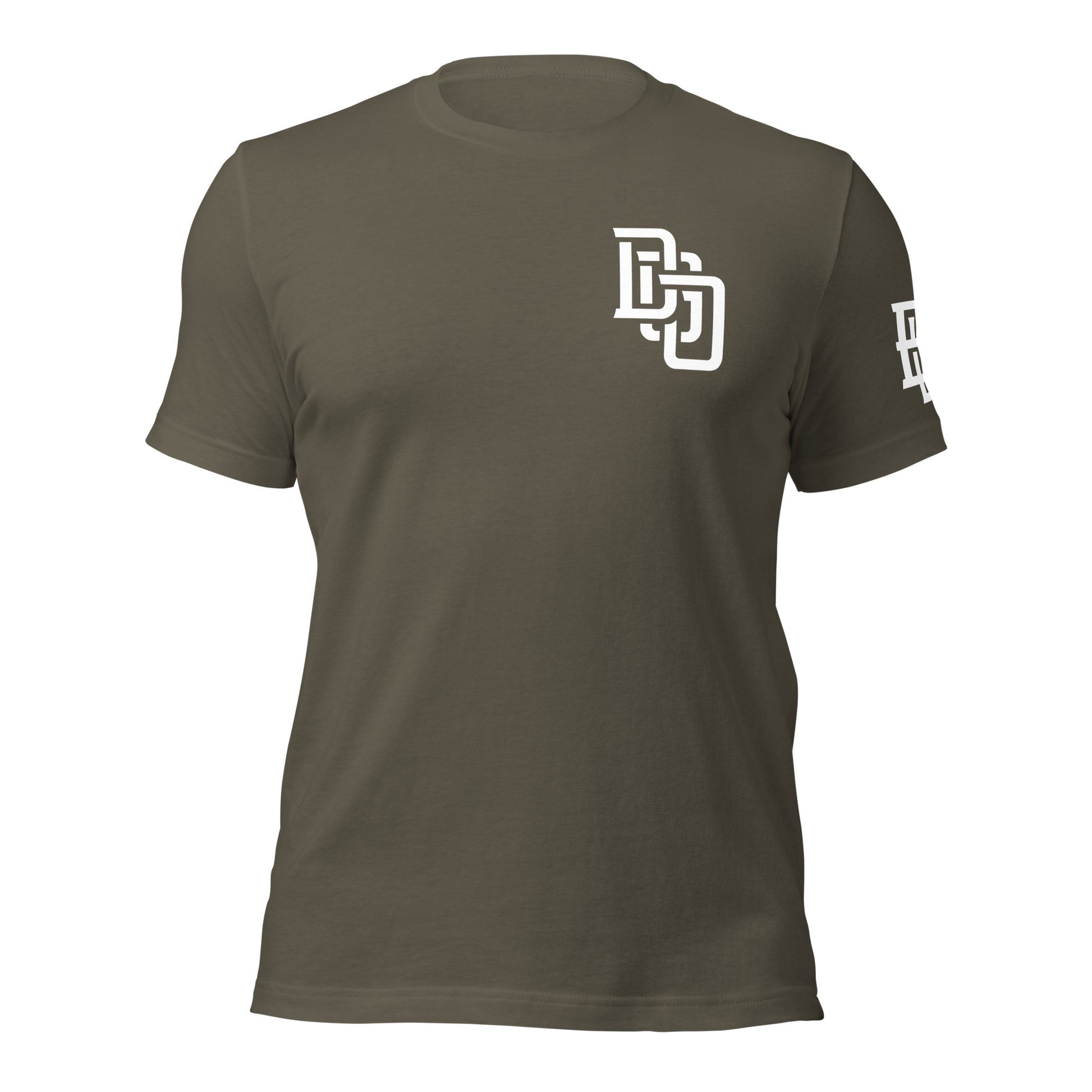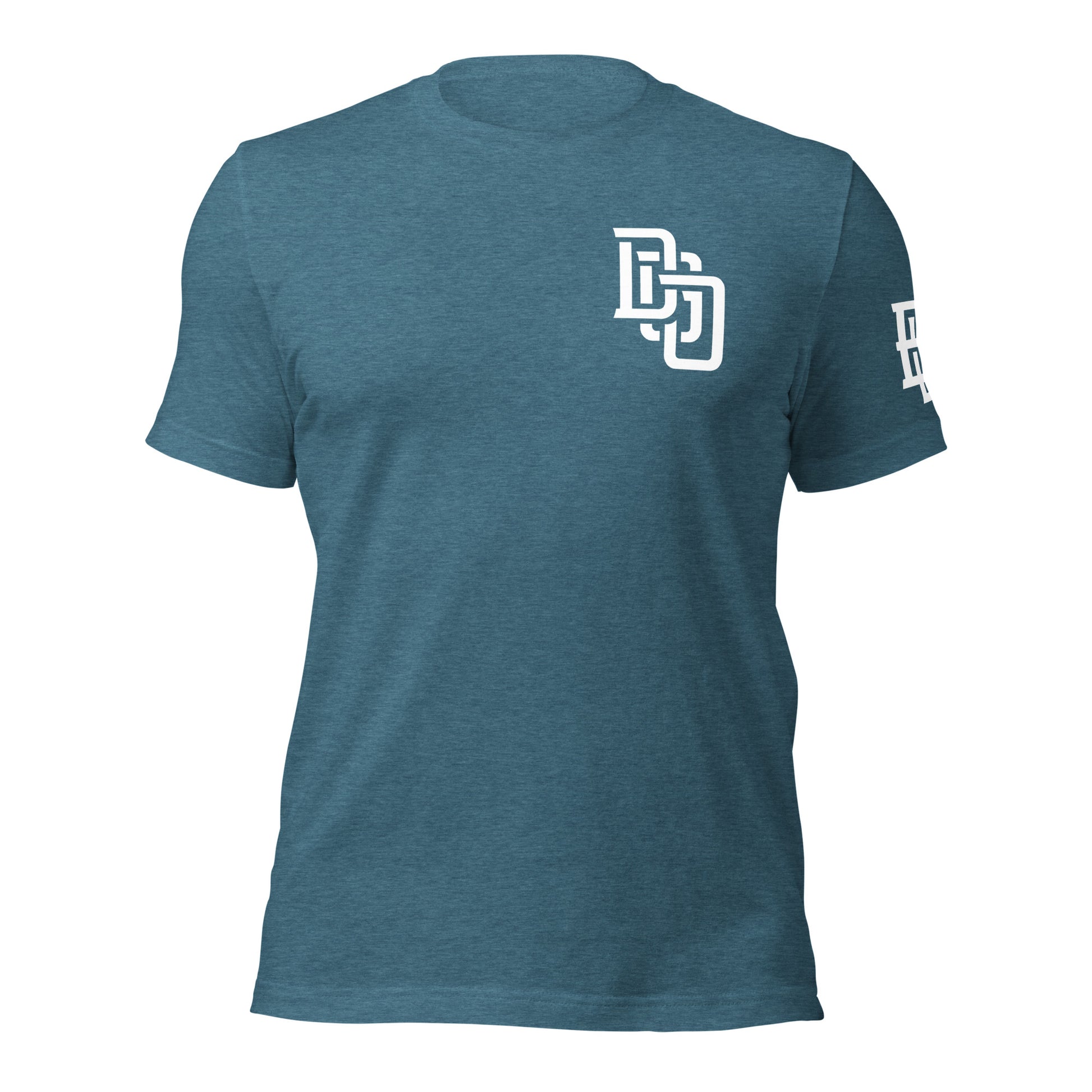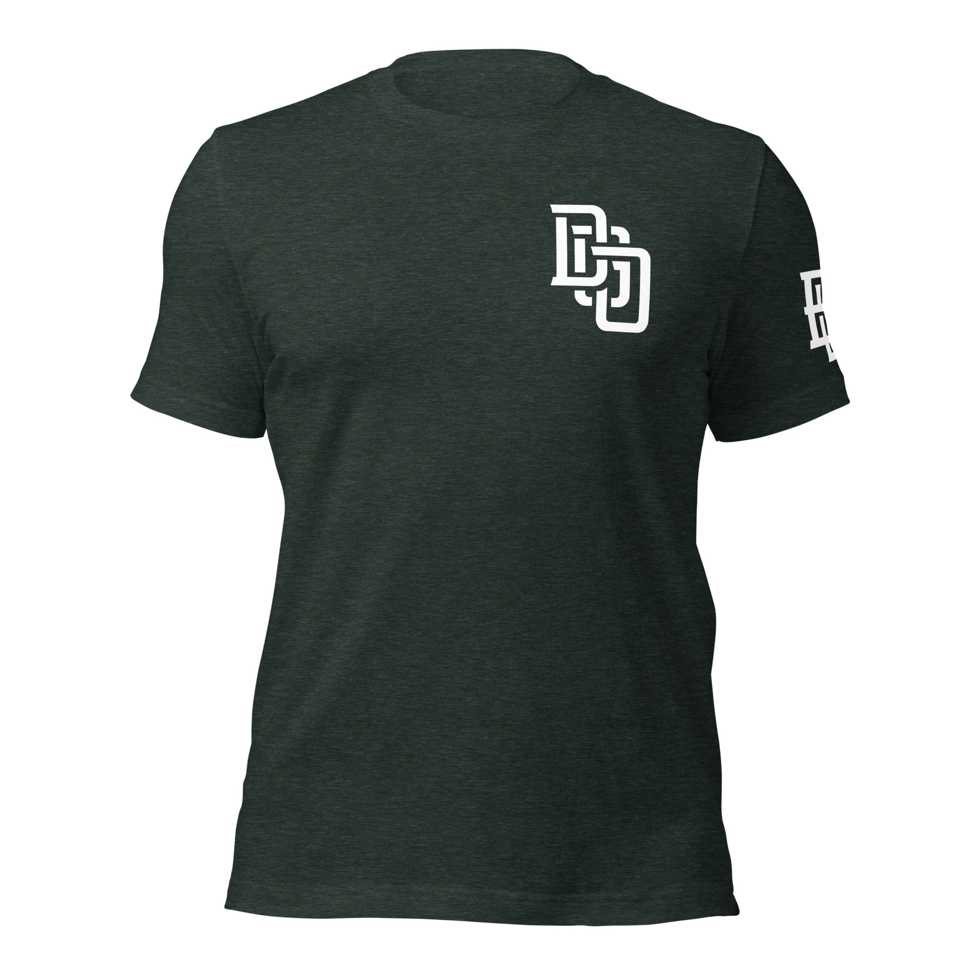 "DGO" Unisex Staple T-Shirt | Bella + Canvas 3001 | E Luna Brand ELEMENT Tricrest 3 White Logos: Front Upper Left, Left Arm & Back (Large)