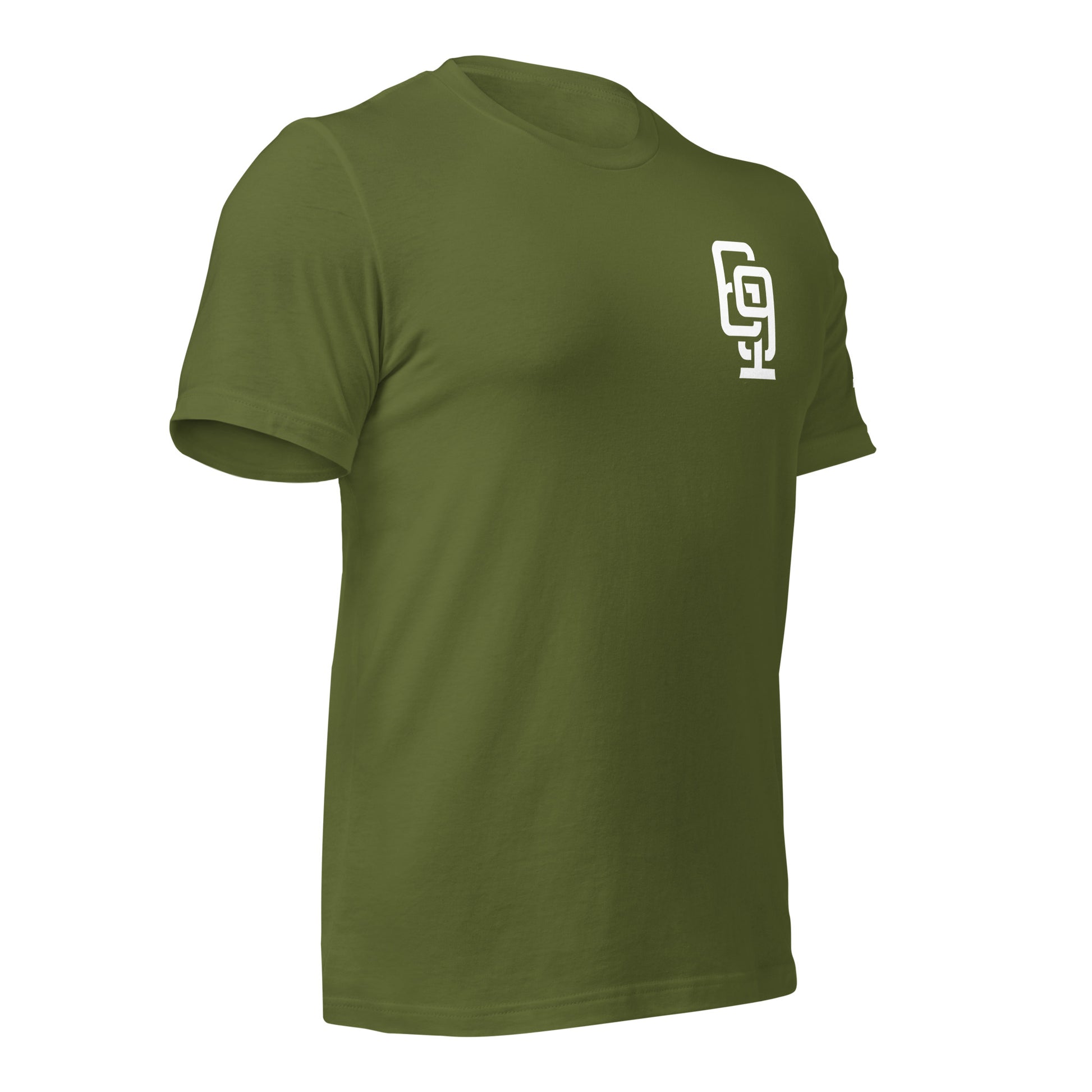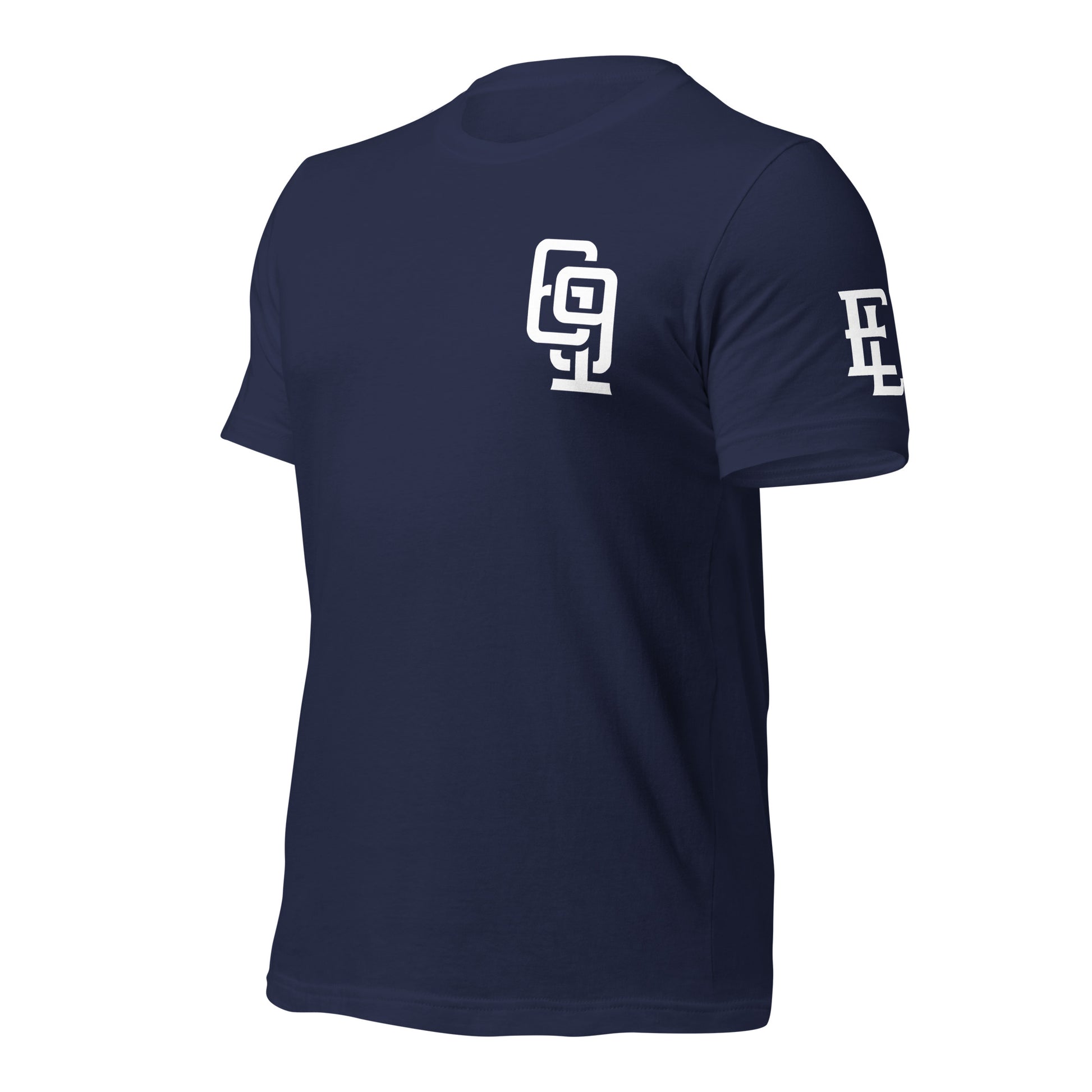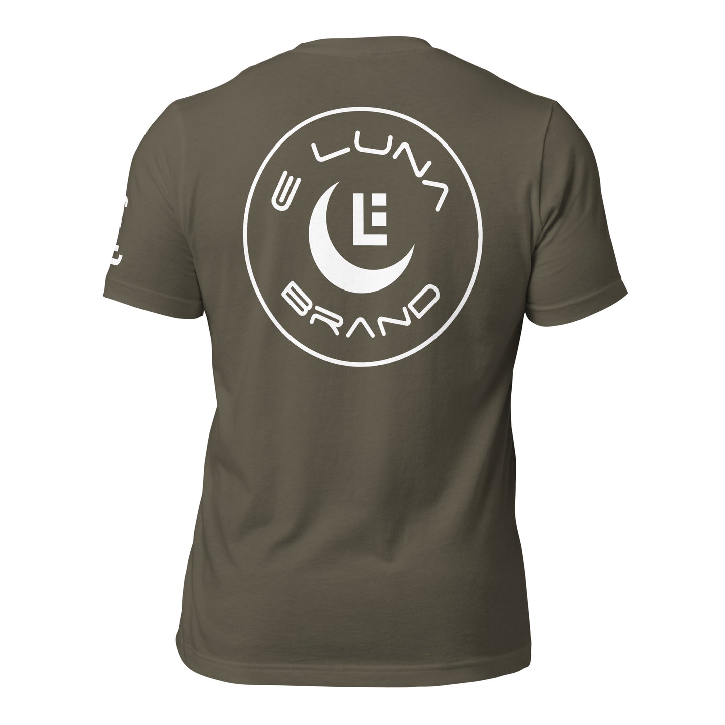 "619" Unisex Staple T-Shirt | Bella + Canvas 3001 | E Luna Brand ELEMENT Tricrest 3 White Logos: Front Upper Left, Left Arm & Back (Large)